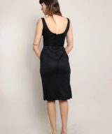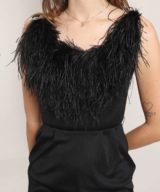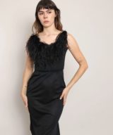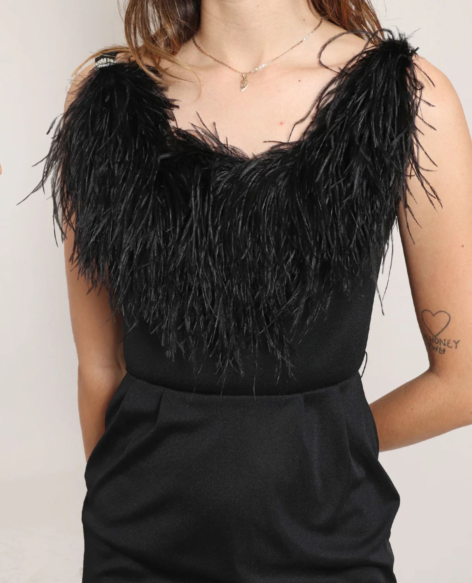 Vintage glamour at its finest. This black cocktail stunner from Lilli Diamond features a marabou feather neckline, fitted waist, and midi length for ultimate drama. Tank straps, zip back, and that iconic 70s energy.