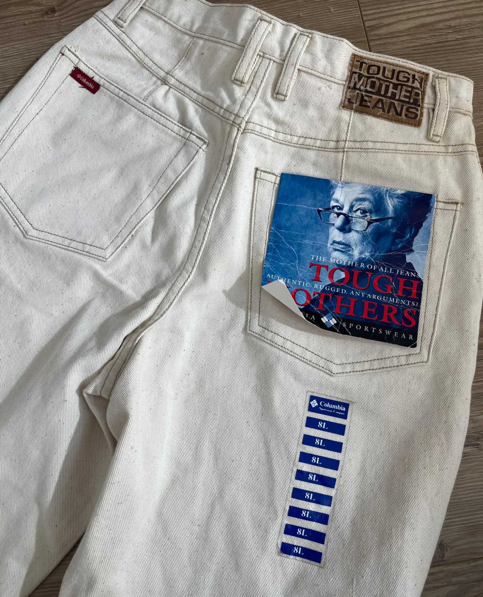 Snag a rare find: these deadstock ’90s Tough Mother jeans by Columbia in a creamy hue are unworn and ready to rock. Made from 100% cotton with a metal zipper and classic regular fit, they’re marked size 8L and best fit a modern 6/8.