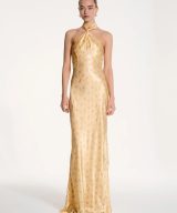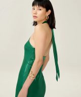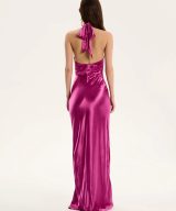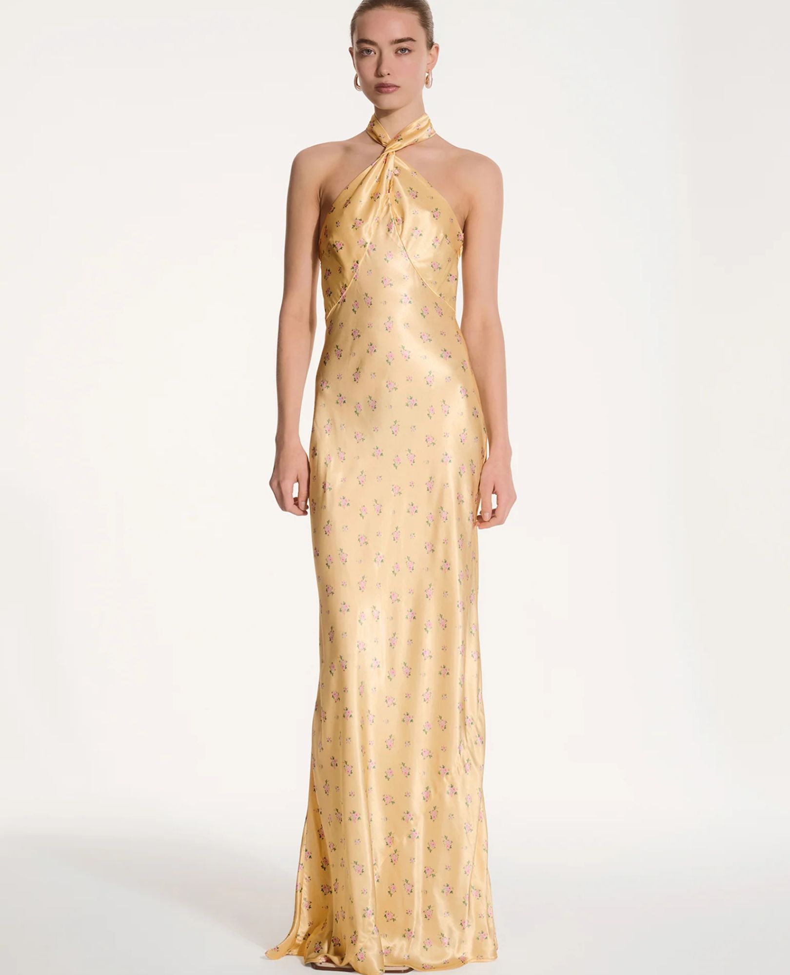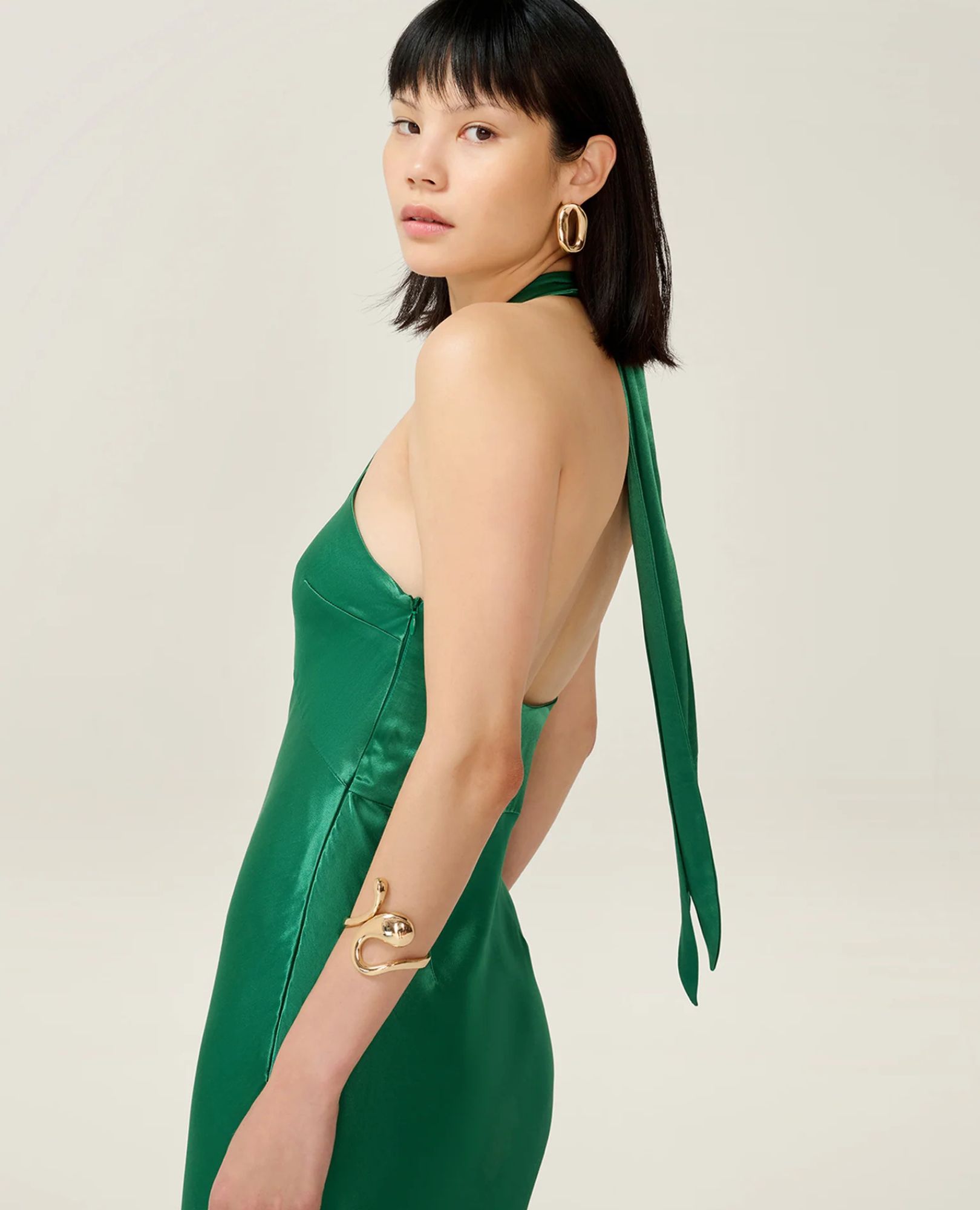 Draped in lustrous, eco-conscious satin, this maxi dress kisses your silhouette with a delicate cross-halter neckline and a back that whispers seduction — low, languid, unforgettable.