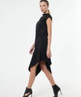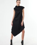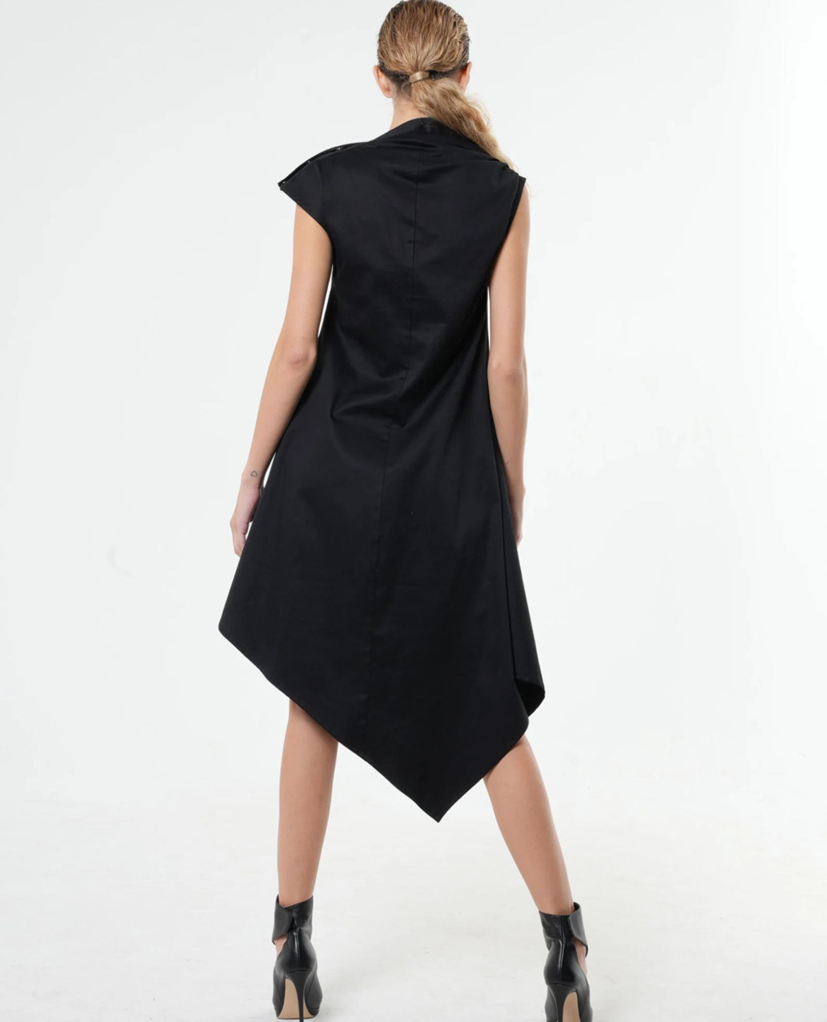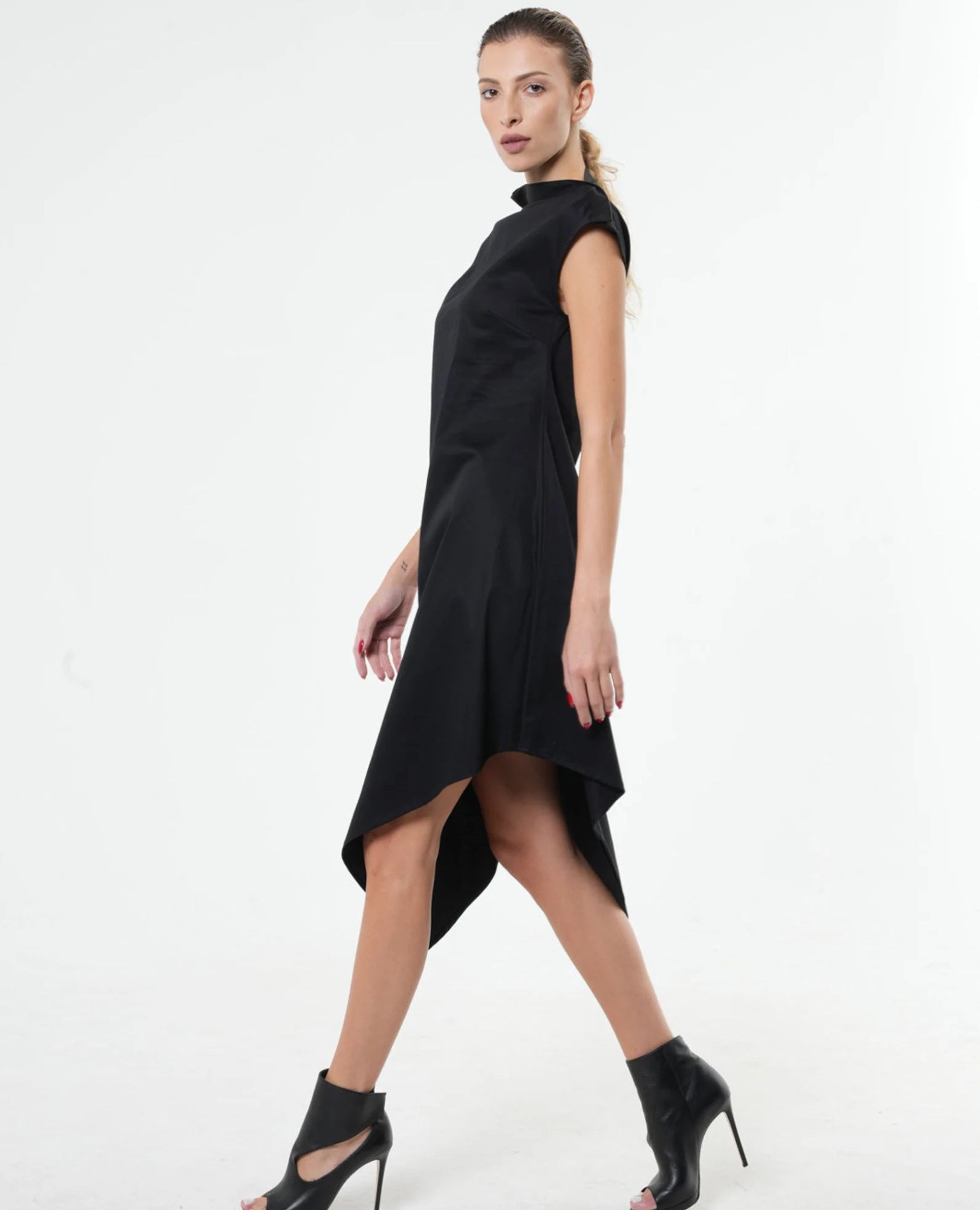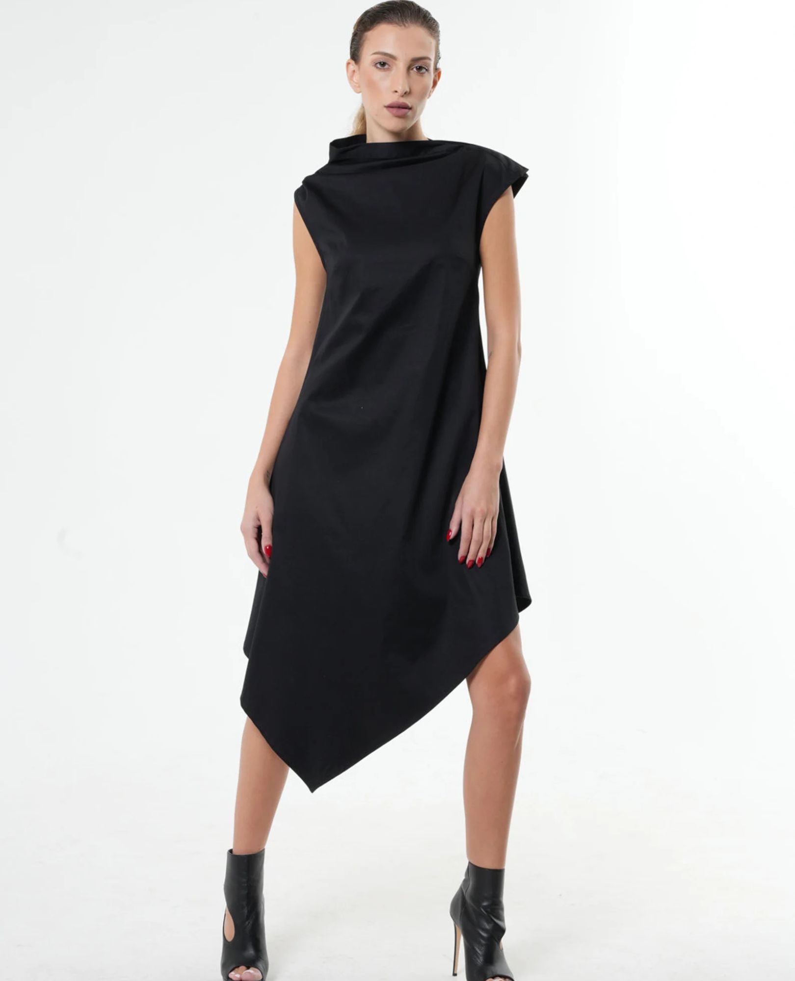 Make a statement with this elegant, minimalist black dress—easy to wear with shoulder snap buttons, perfect for any occasion or as a gift. Crafted from satin cotton with a touch of elastine for comfort.