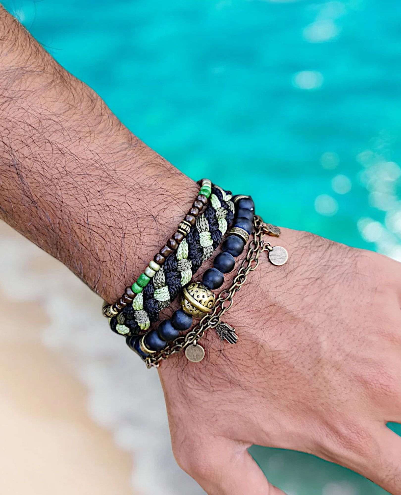 Don't be shy—wear 2 or 3 together on one wrist. Combining the different textures (beads, knit, metal) is what creates that expert, layered look.
