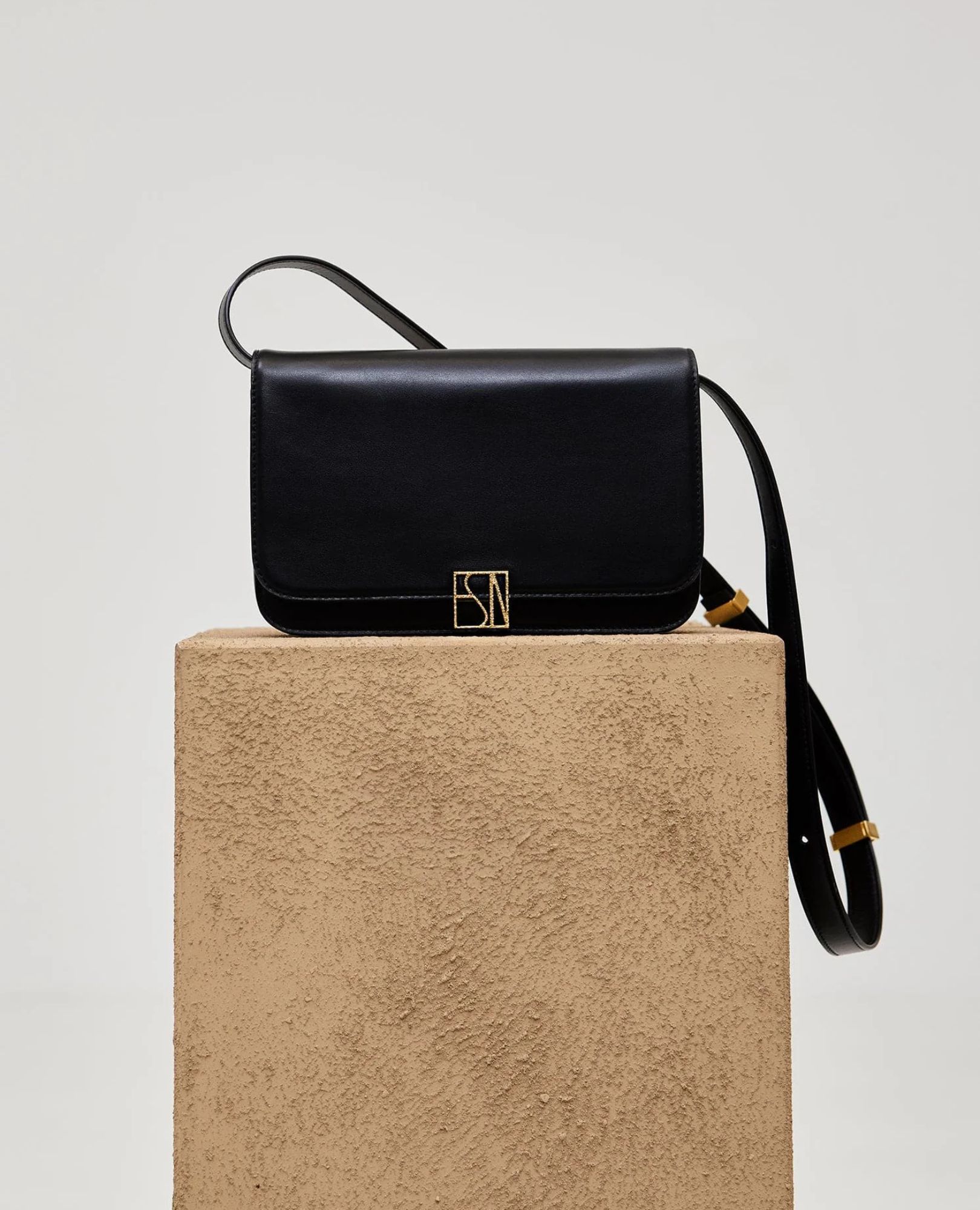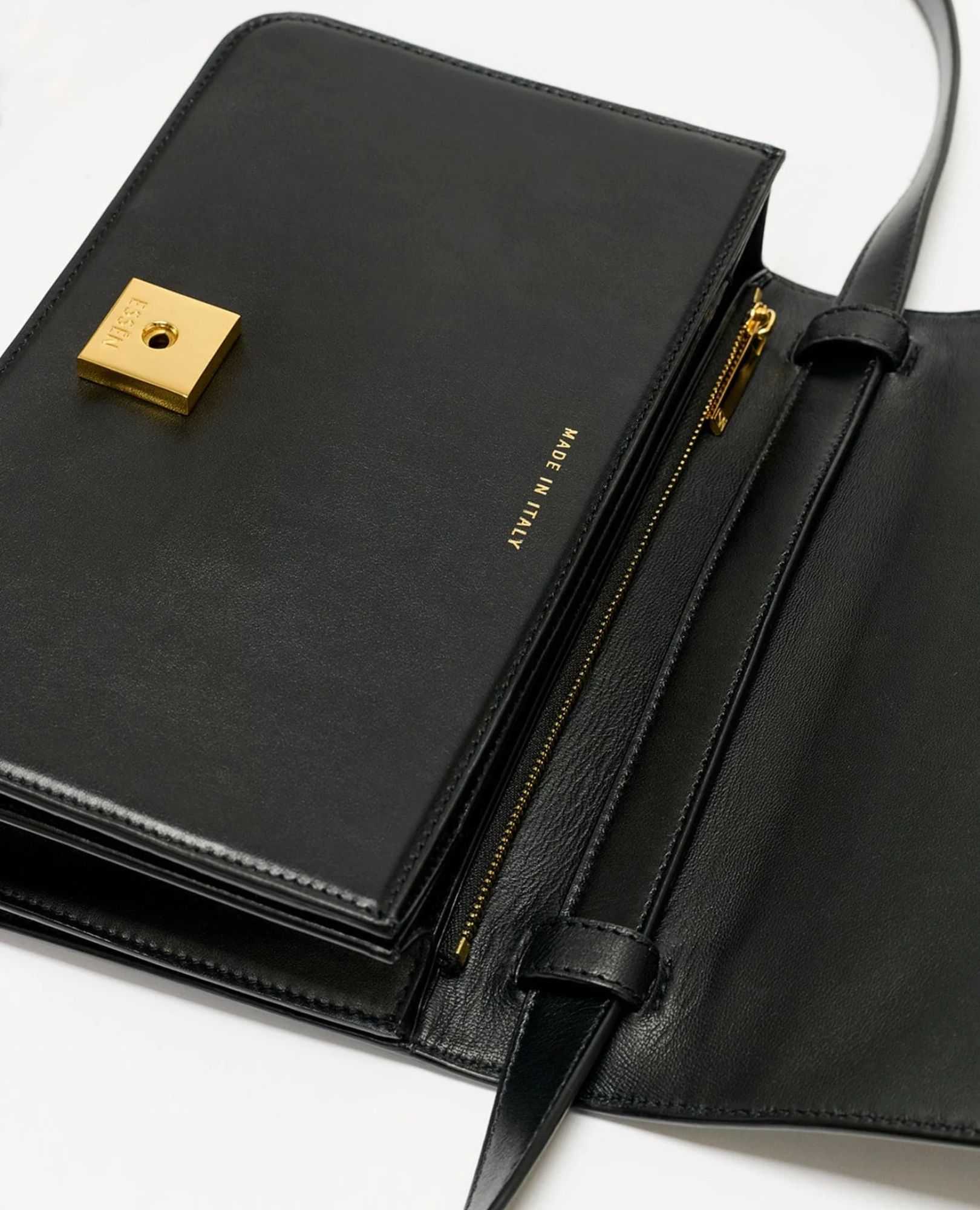 Meet your new go-to for nights out and special moments. Handcrafted in Italy from smooth, LWG Gold-certified calf leather, this classic black bag features a sleek gold monogram closure and smart compartments to keep your essentials organized.