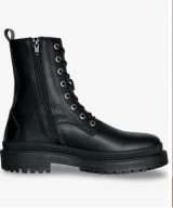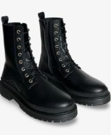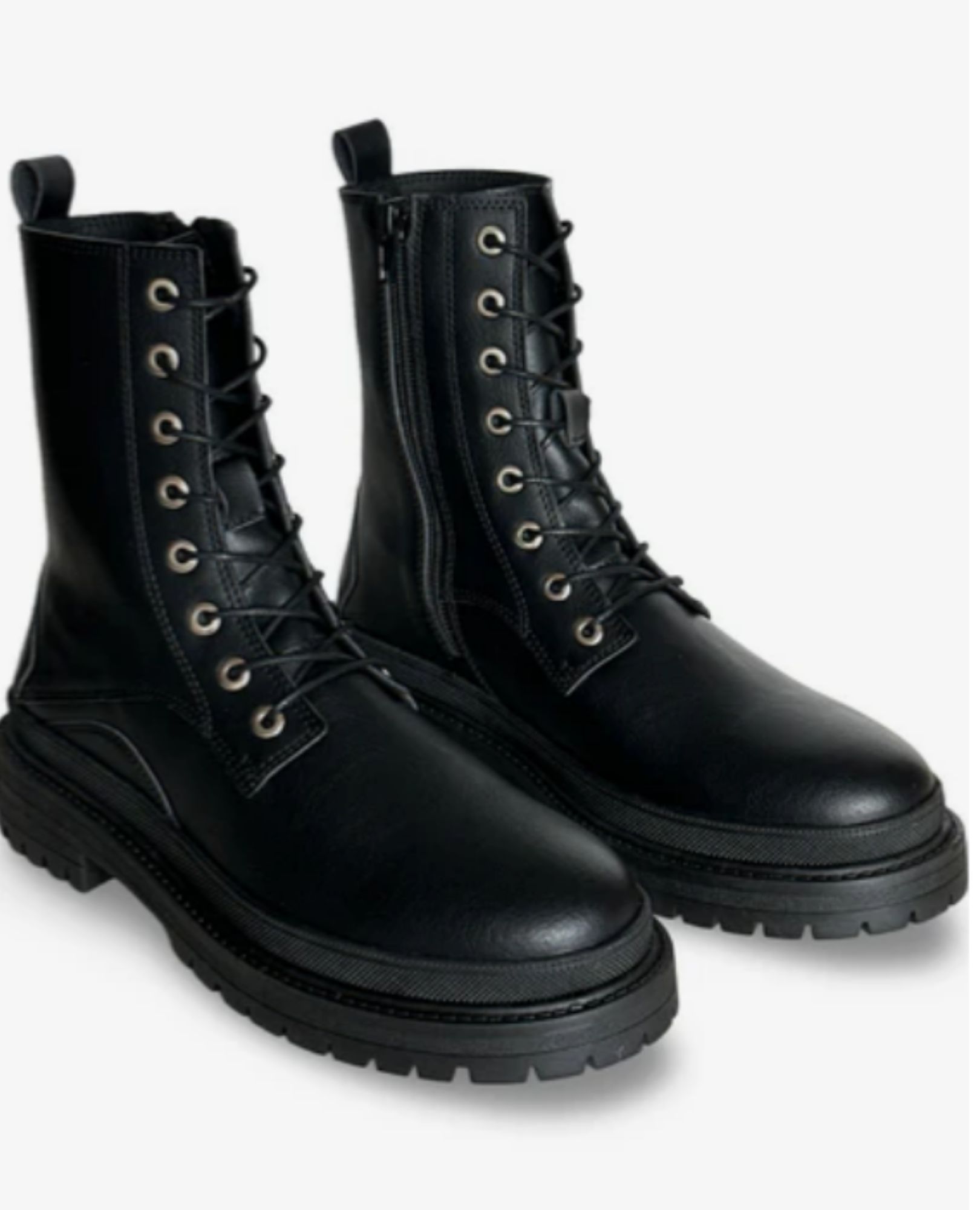 Diram is a striking unisex vegan combat boot with a chunky sole, metal eyelets, and side zipper—bold style with ethical roots.