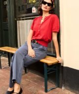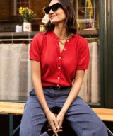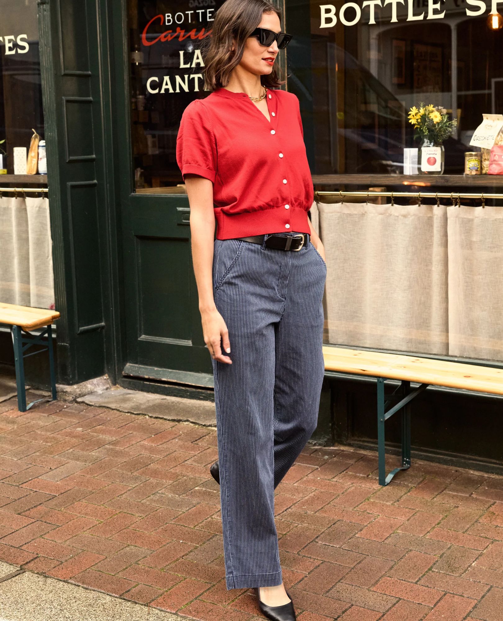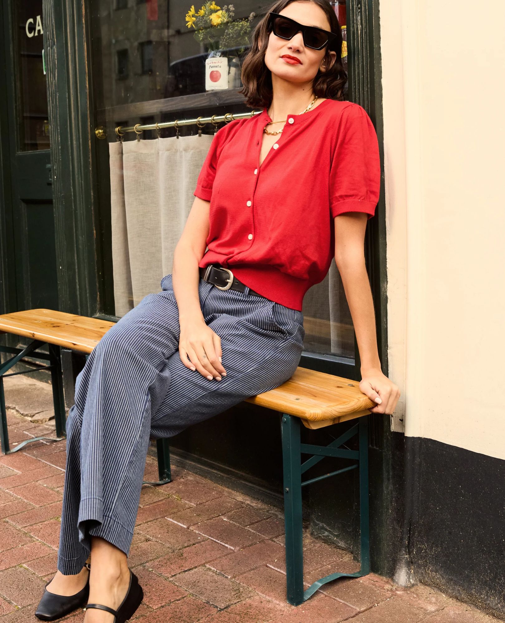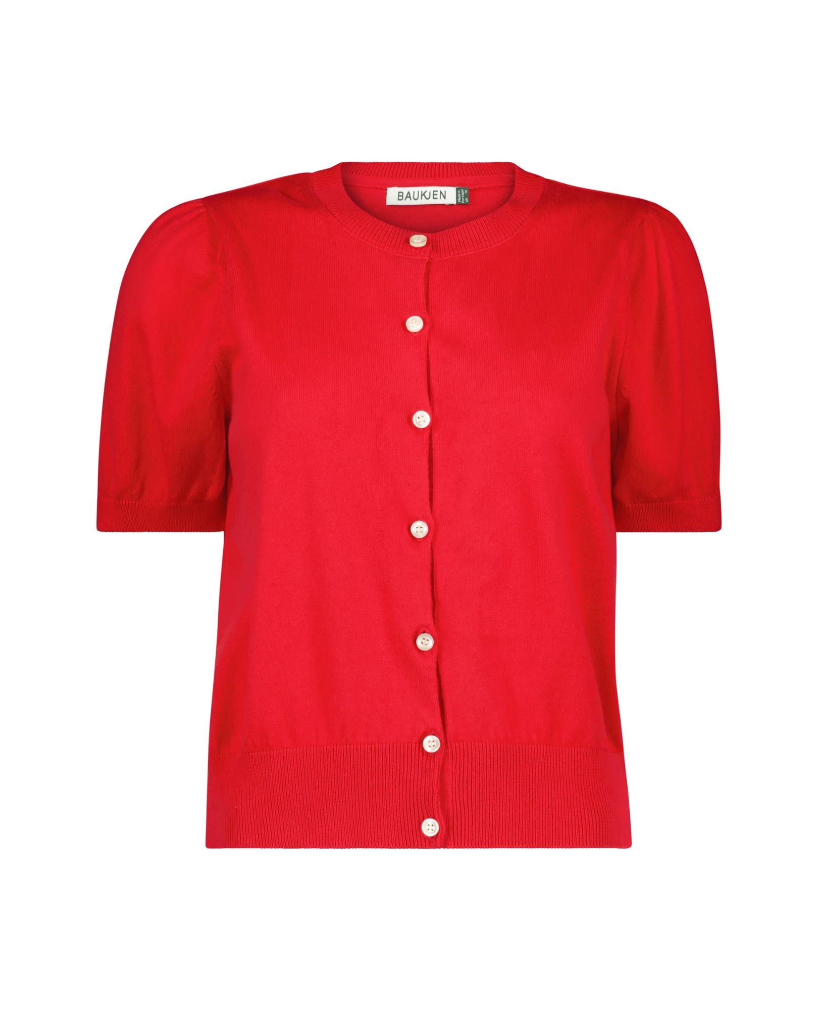 Elevate your wardrobe with the Sasha cropped cardigan in a vibrant red. This chic piece, made from organic cotton, boasts a flattering waist-skimming fit and playful puffy sleeves. Style it open over a dress or vest top, or button it up with your favorite jeans for a trendy look.