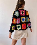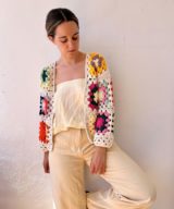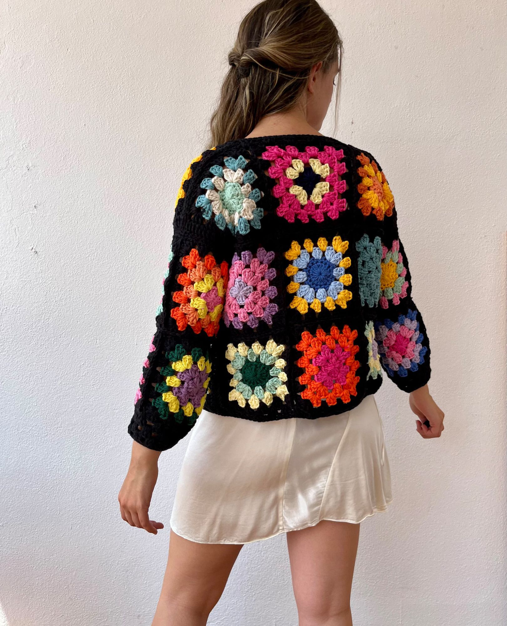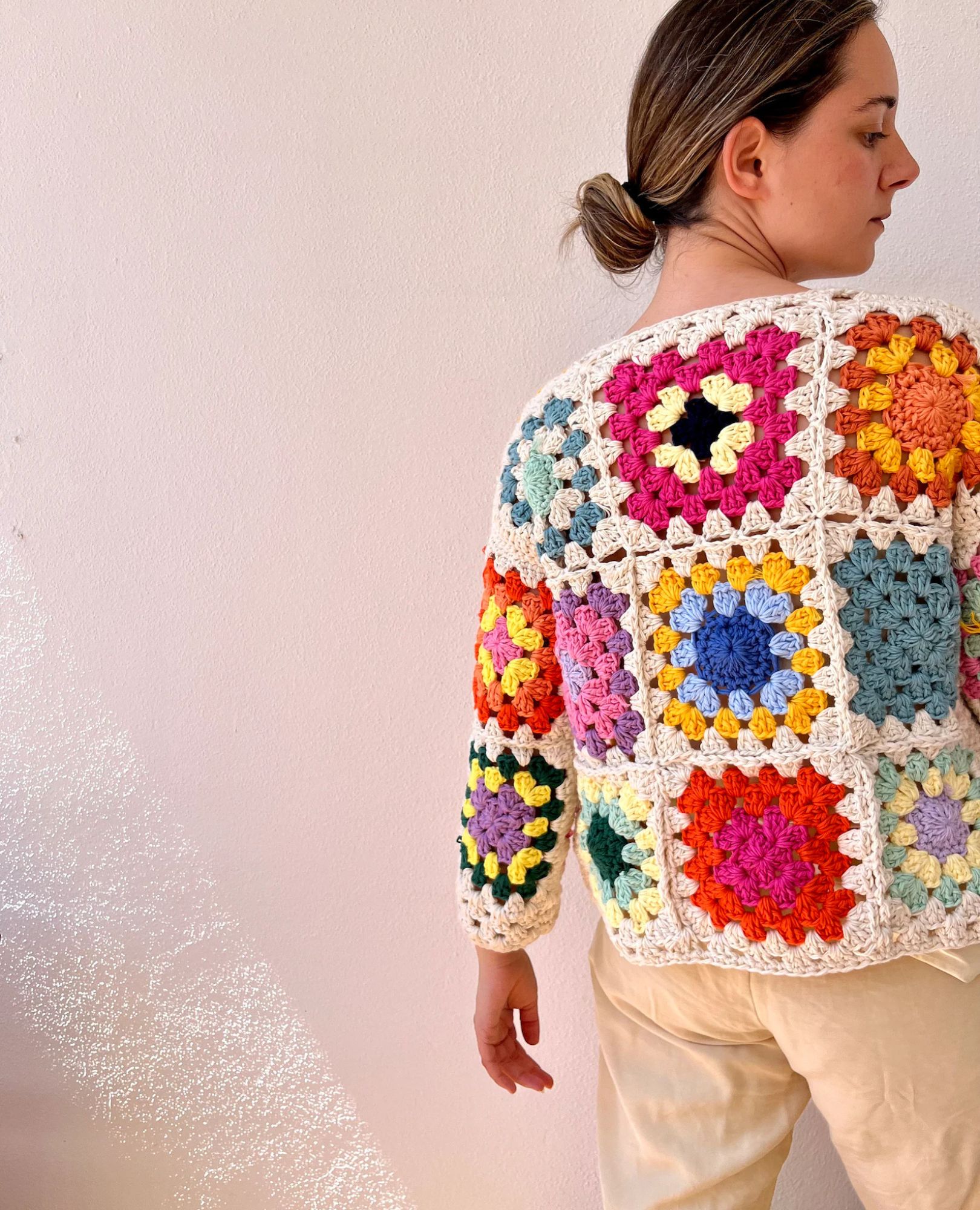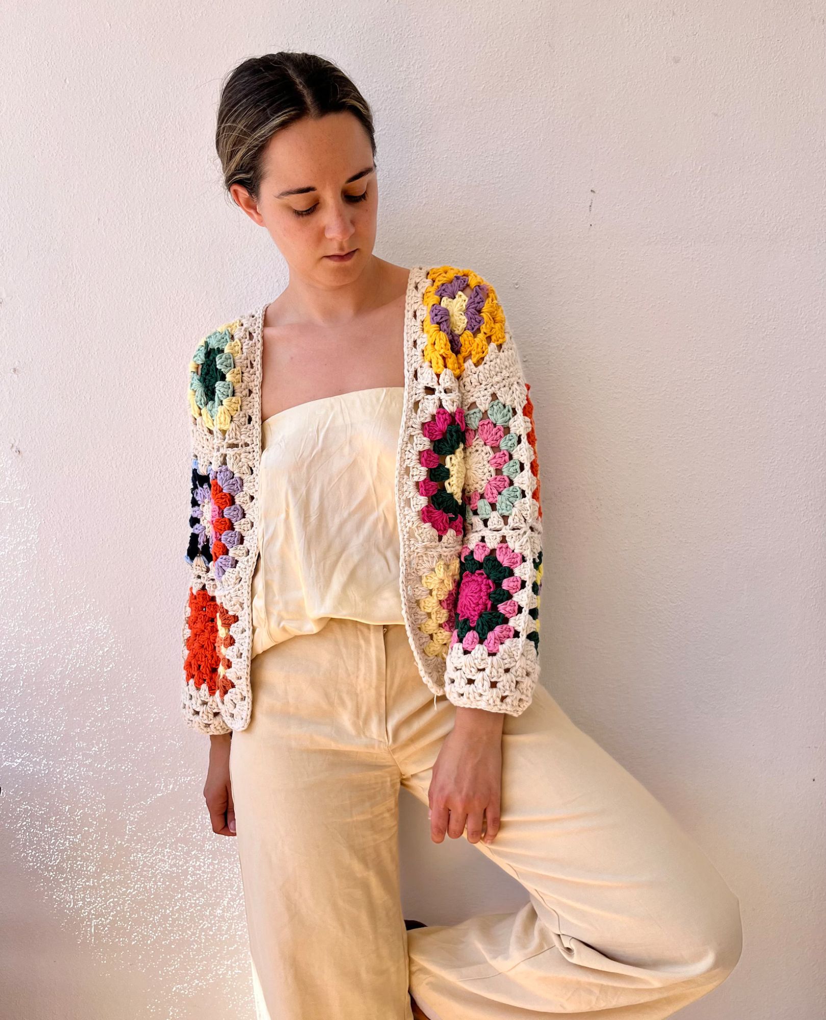 Handmade crochet granny square cardigan in soft, organic cotton—colorful, lightweight, and endlessly versatile. Perfect over dresses or jeans for effortless summer style.
