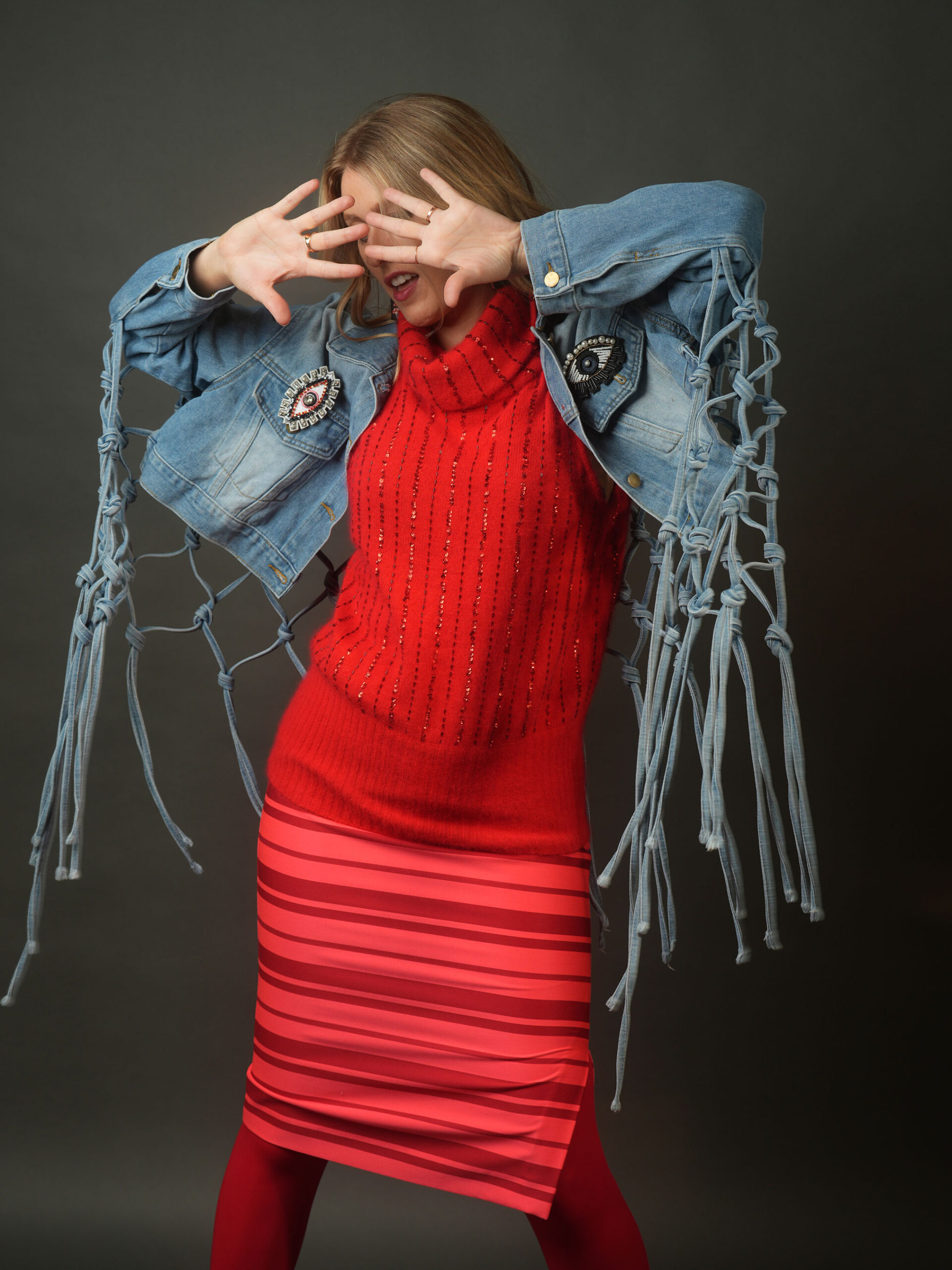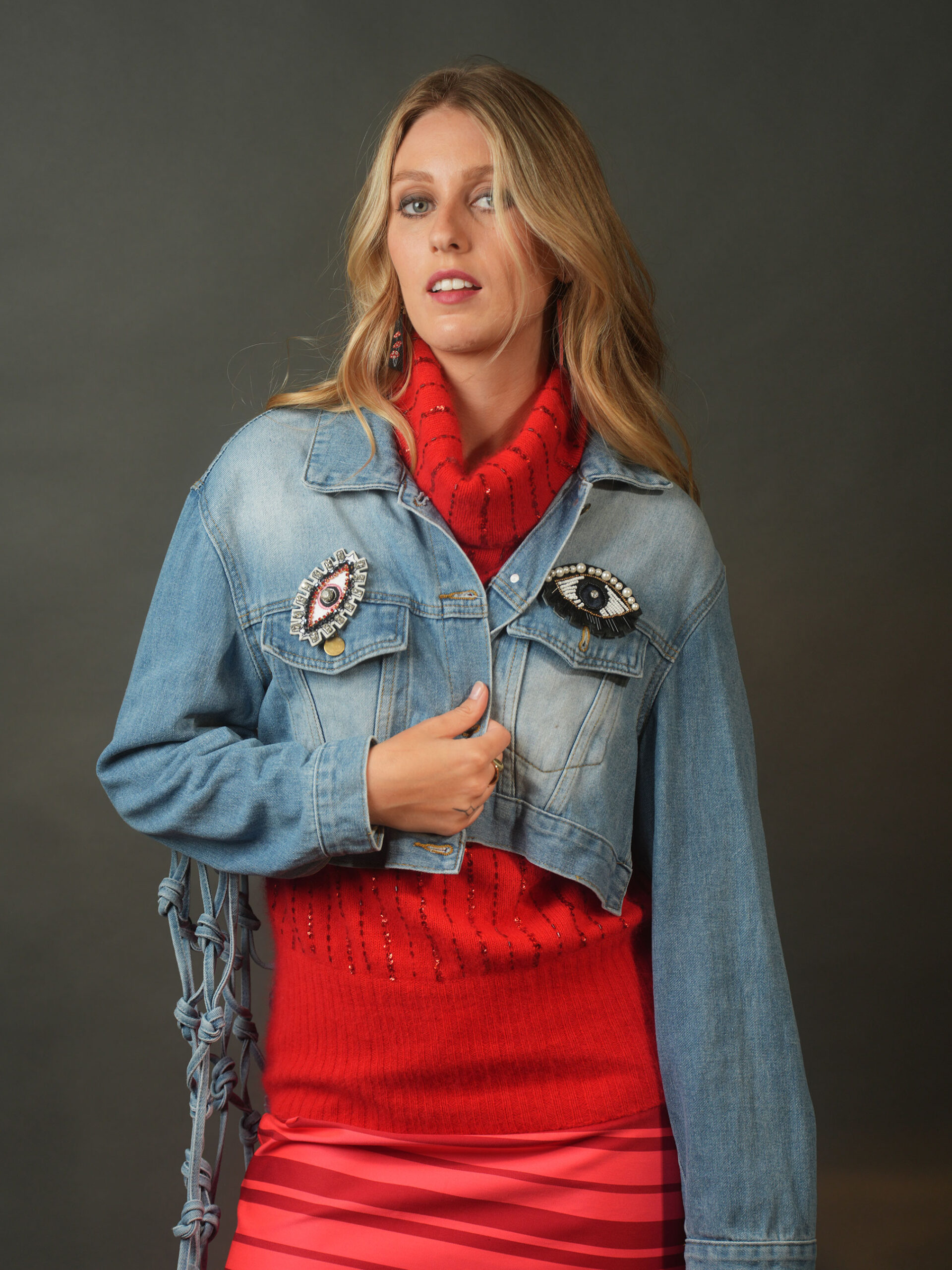 Pair this jacket with high-waisted jeans and a cropped tee for an edgy street-style look. Add some ankle boots, and you’re ready to rock the day! Switch out the brooches for a personalized touch every time you wear it. Check out our brooch bundle to mix and match.