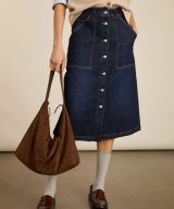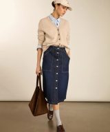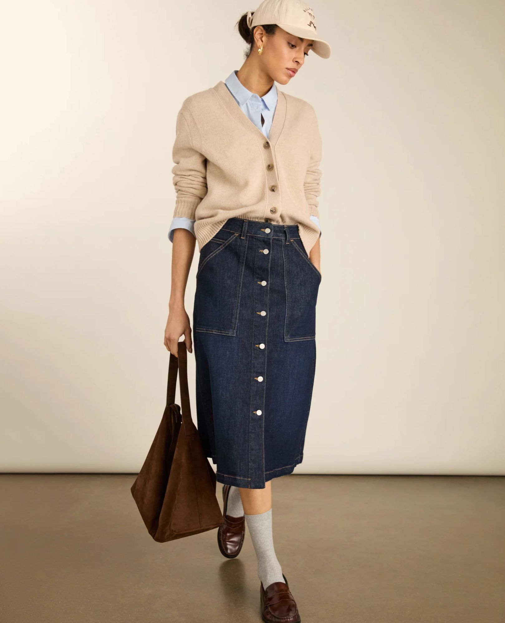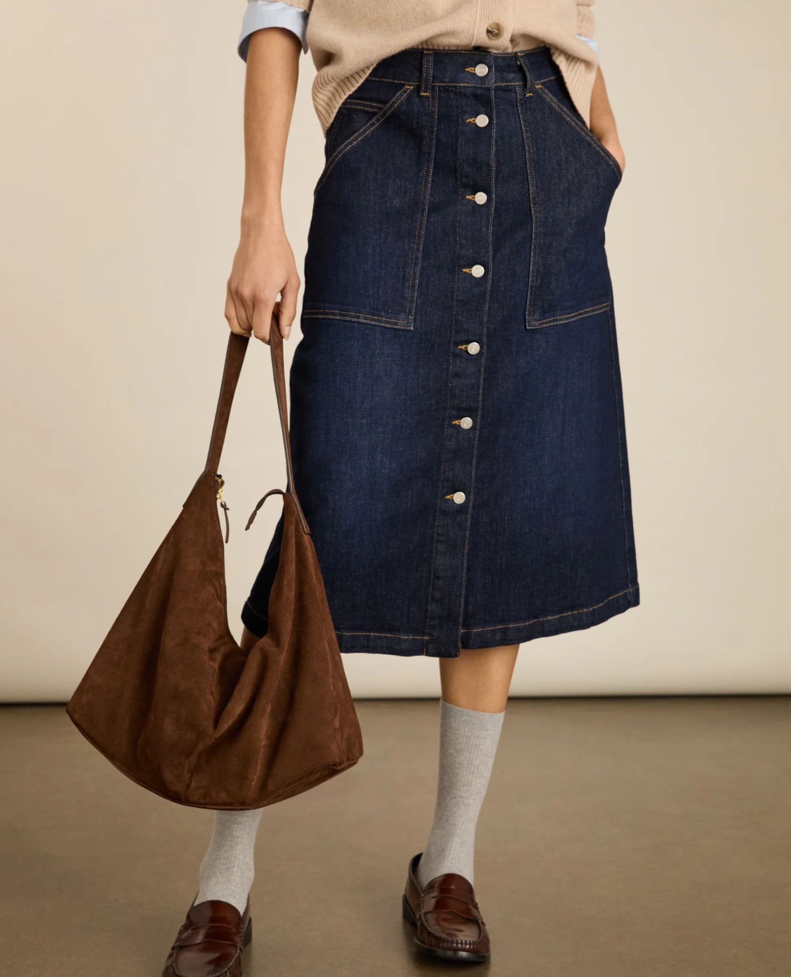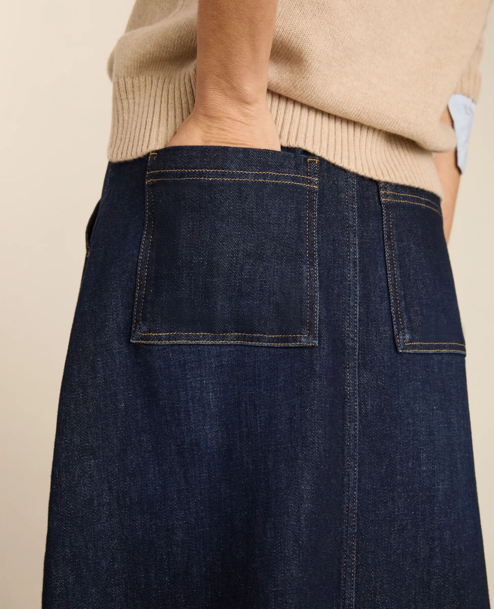 Meet new wardrobe staple—the A-line Bobbie midi skirt in organic stretch denim. With button-front styling, rear patch pockets, and a flattering dark indigo wash, it’s designed to sit at your waist and skim your hips for timeless, easy wear.