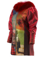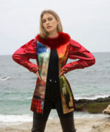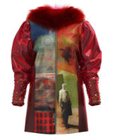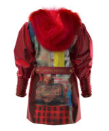 Meet this one-of-a-kind digital Fiery Punkadelic Jacket. It’s made from sleek, shiny red digital leather and flaunts a vibrant graffiti print on both the front and back, making it an absolute head-turner. This jacket is all about the details, with golden studs on the cuffs, a fabulous faux fur hood, and our signature branded belt in dazzling gold embroidery.