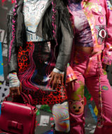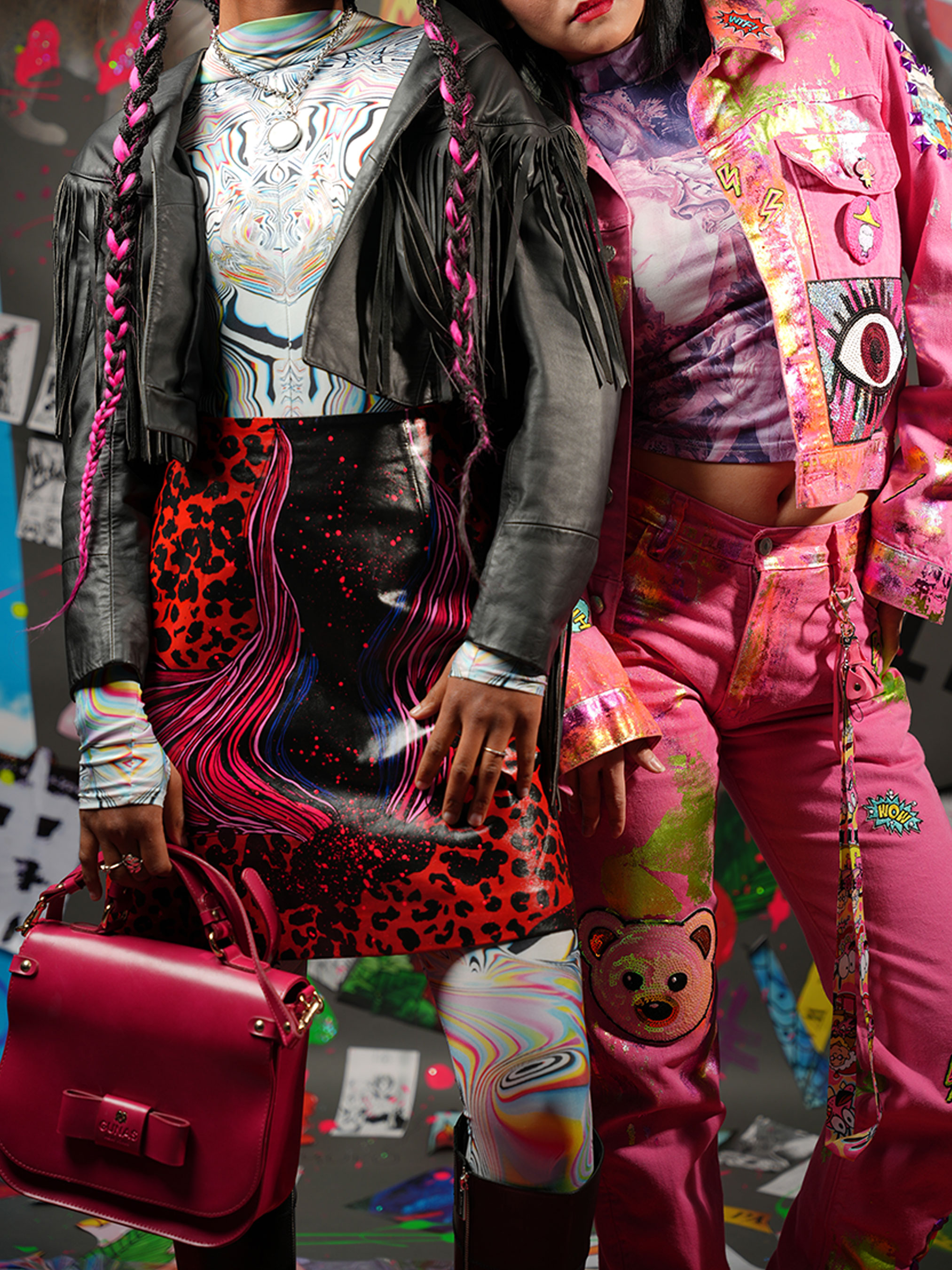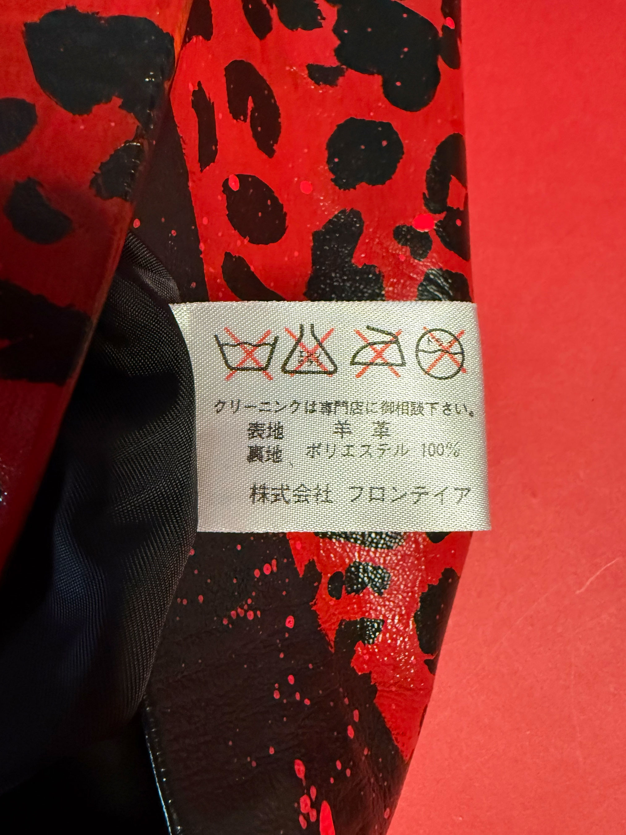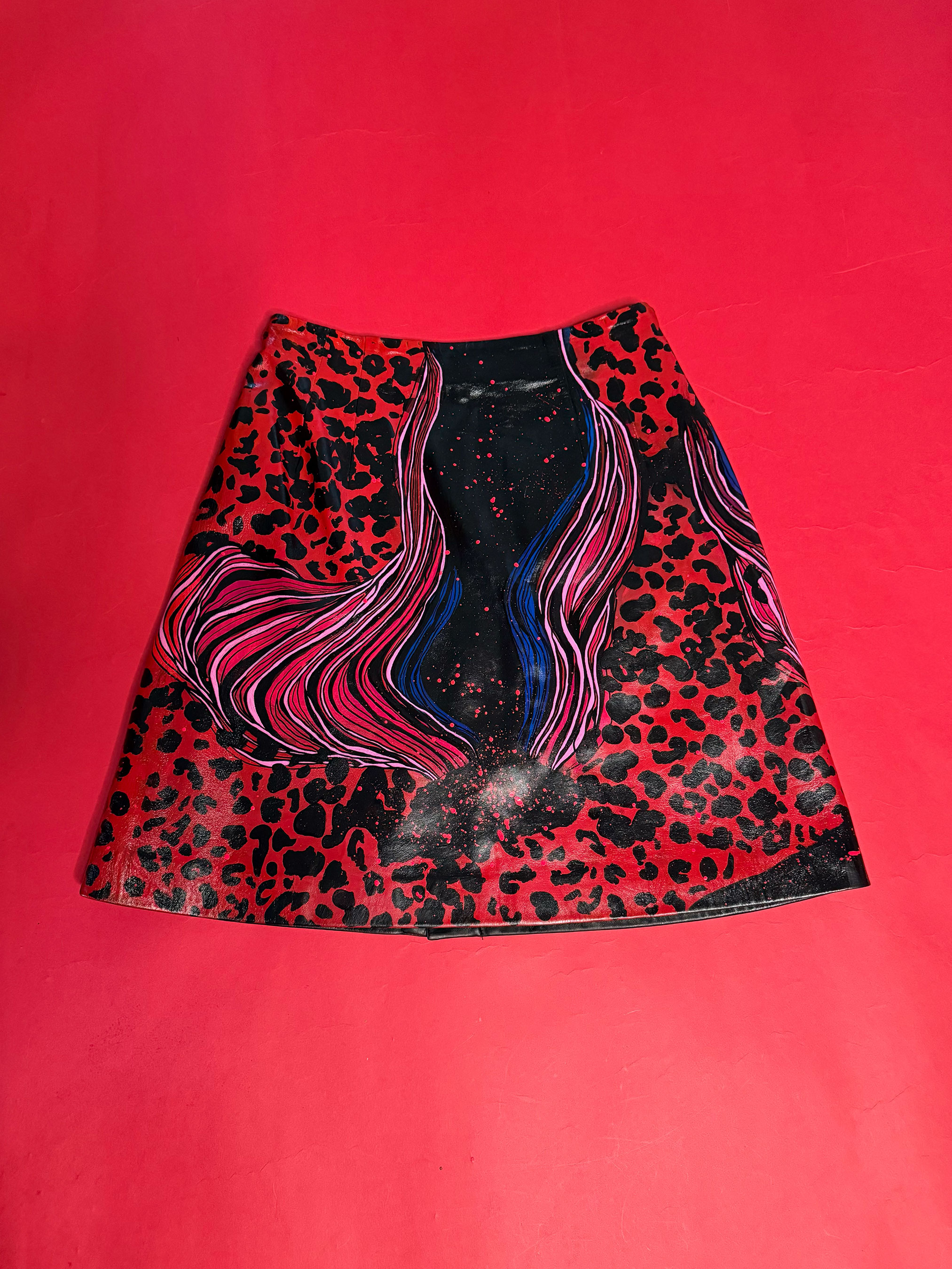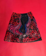 Originally discovered in a vintage shop in Harajuku, Japan, this gem started life as a 90s leather mini by Japanese brand Donna. Now it’s reborn with bold magenta, blue, and red psychedelic waves + animal print accents—ready to slay festivals, street style shoots, and late-night dancefloors.