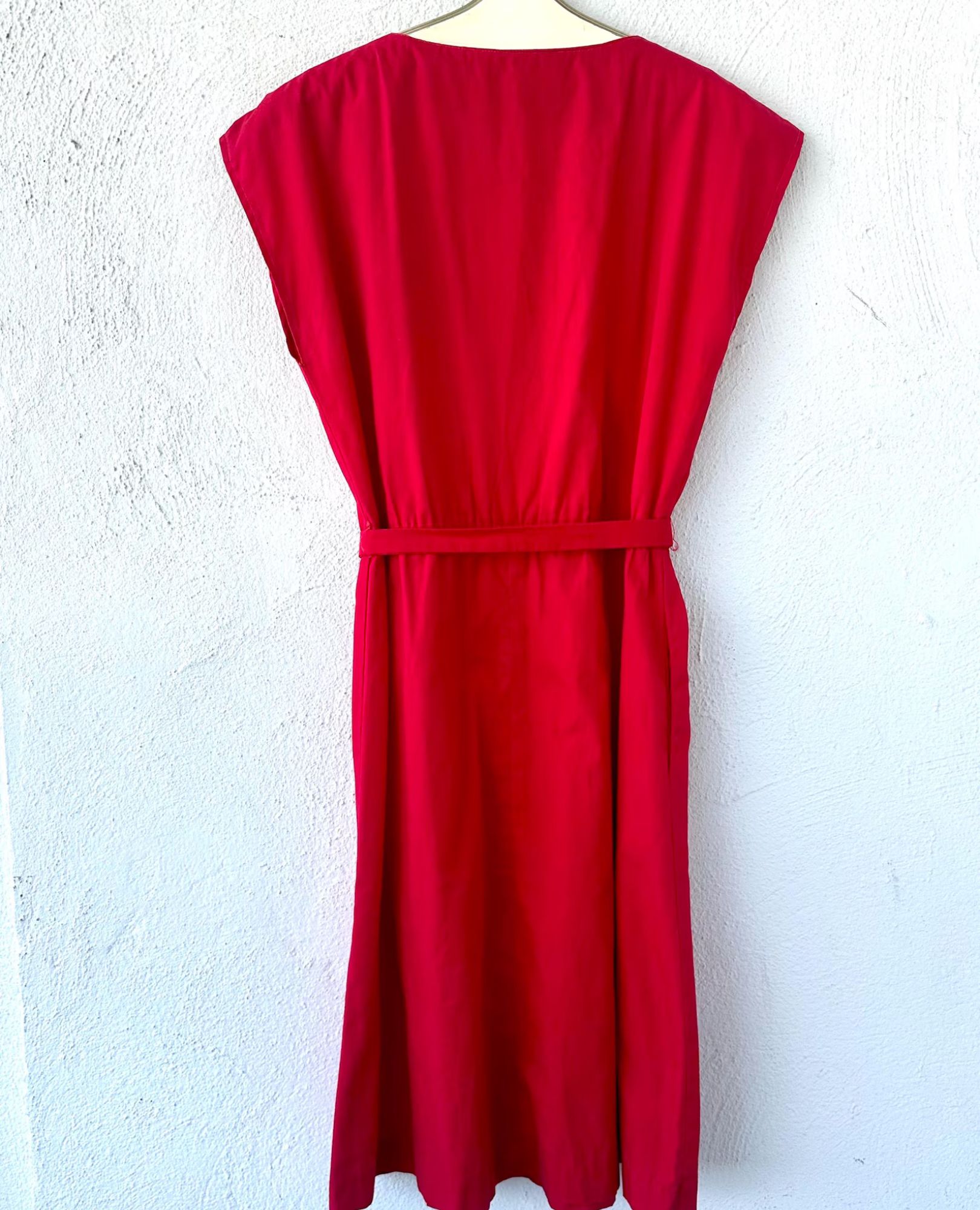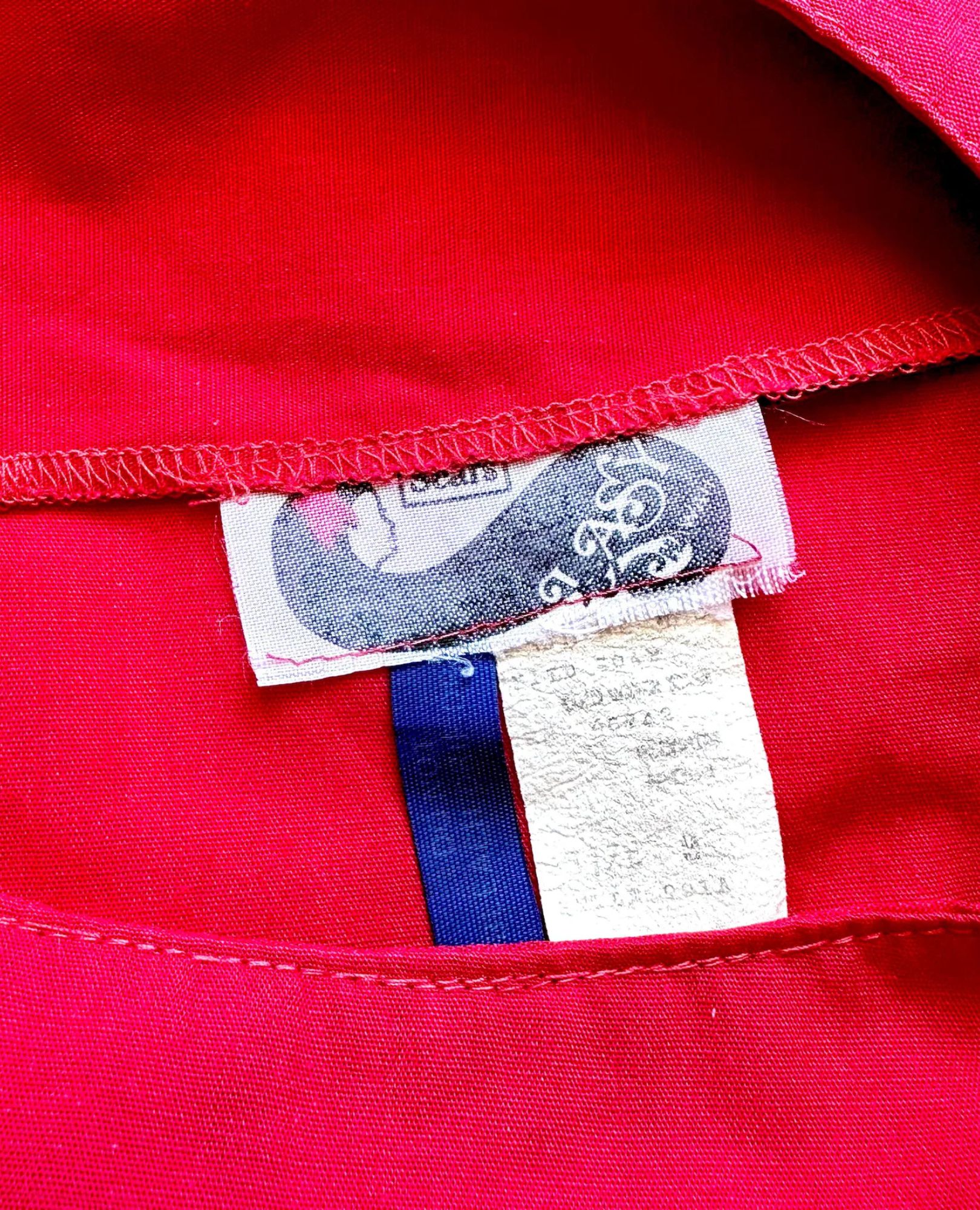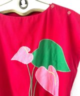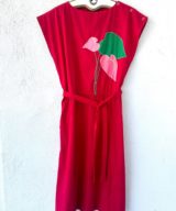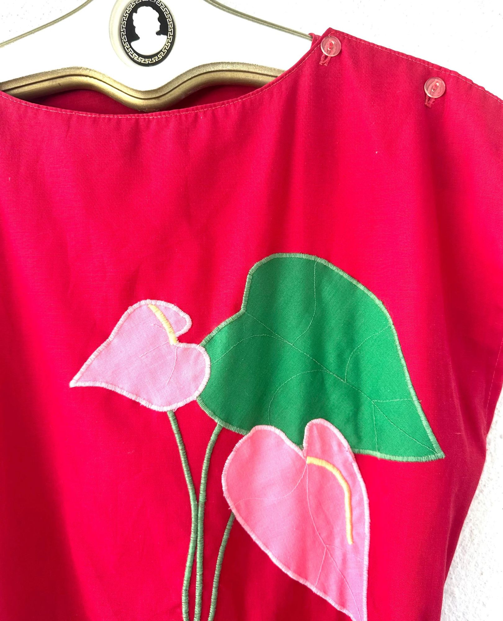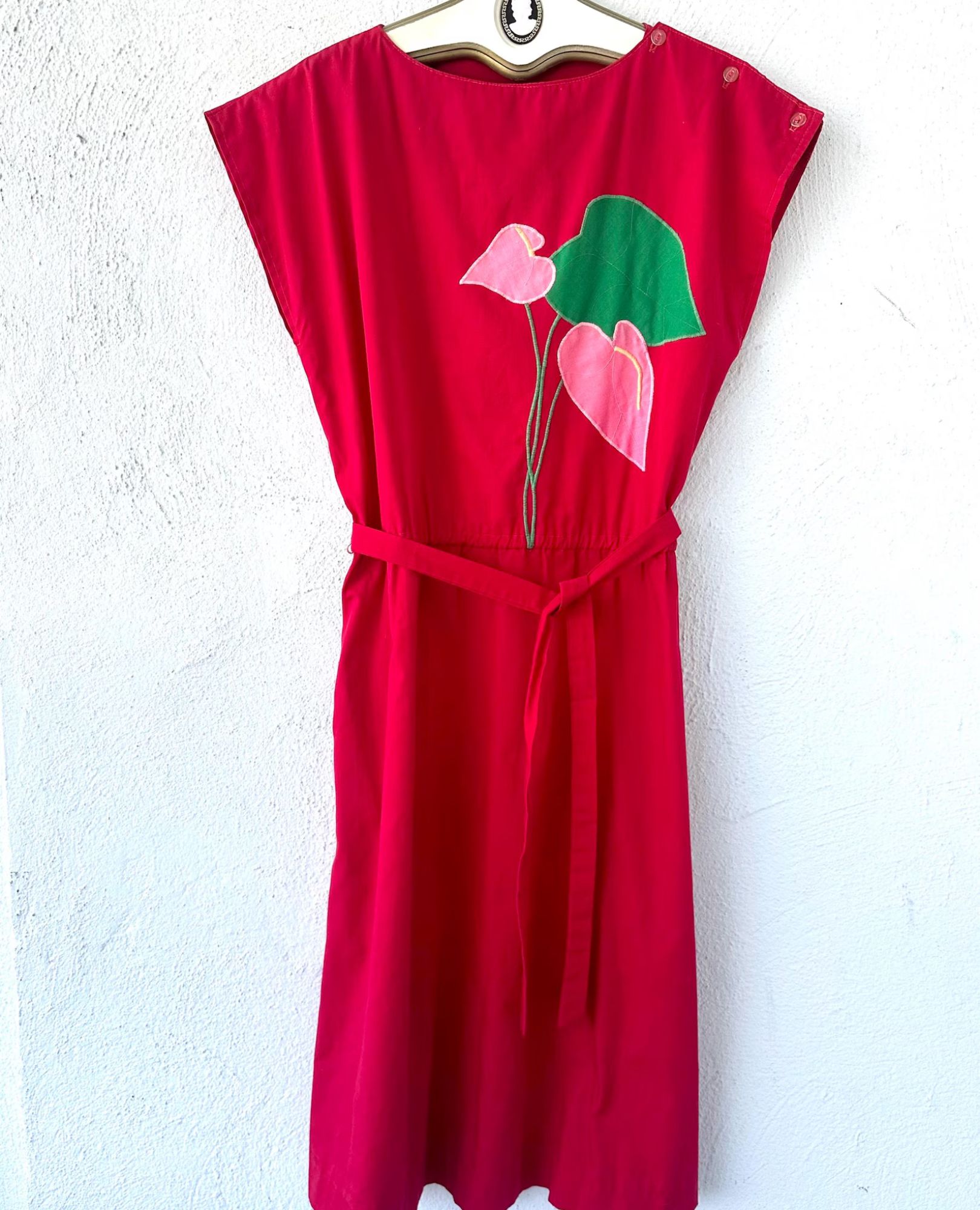 This 1970s Sears Hawaii dress is a total island dream—bright red cotton with gorgeous embroidered anthurium flowers in pink, green, and yellow. It even comes with a matching sash and has a hidden side pocket (yes, really!). A true vintage Hawaiian gem, beautifully preserved. Fits like an XS–S depending on your vibe. In amazing condition—well-kept and full of aloha charm.