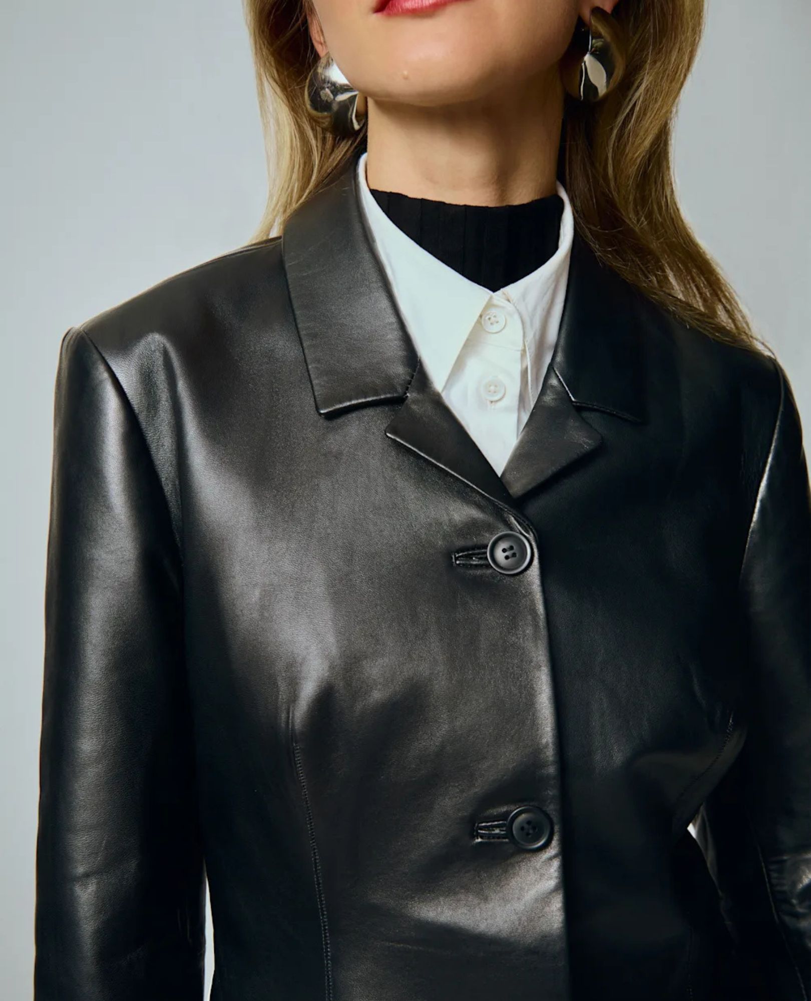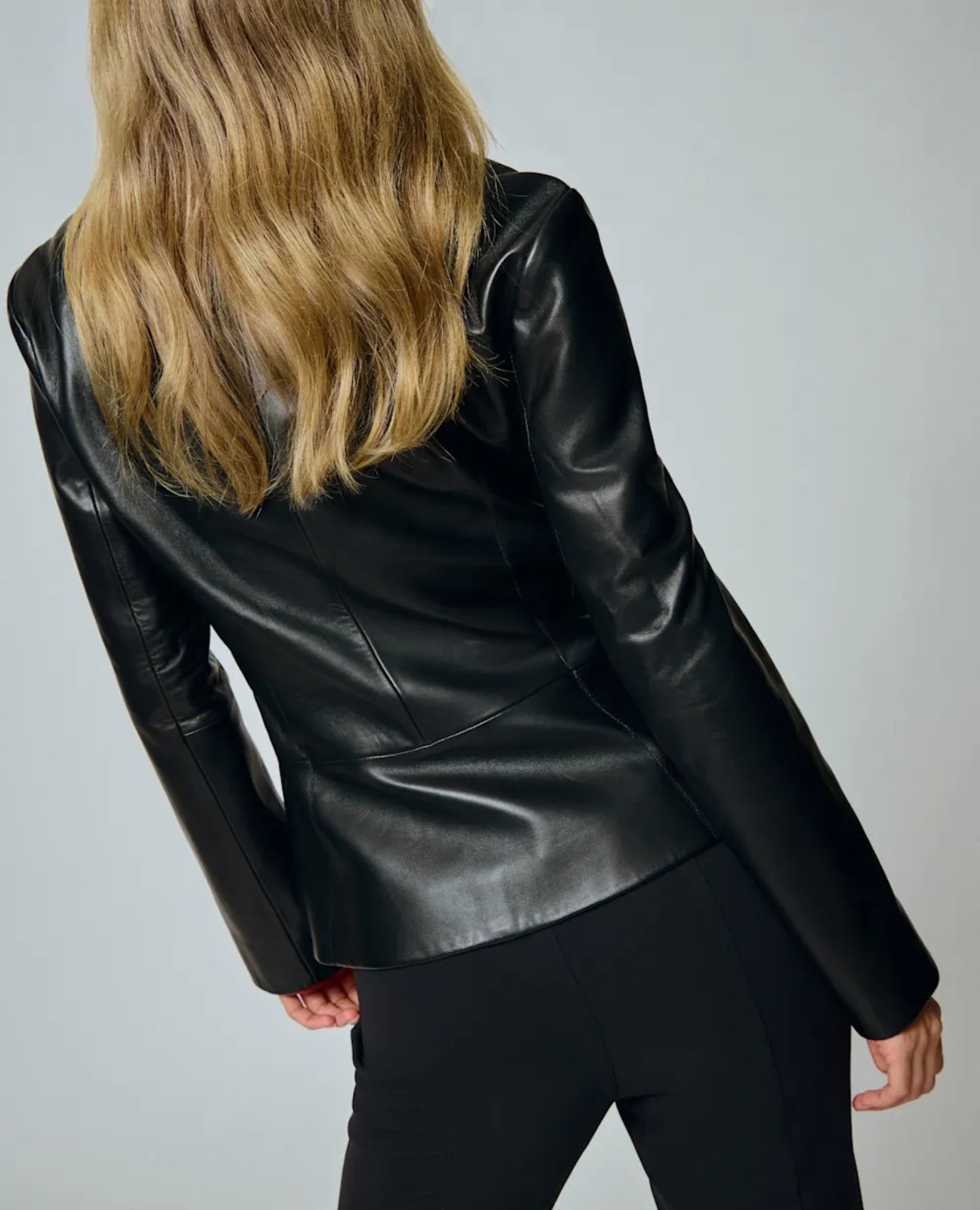 A sleek, fitted silhouette made from regenerated leather and easy to clean—this jacket is equal parts edgy and eco-conscious.