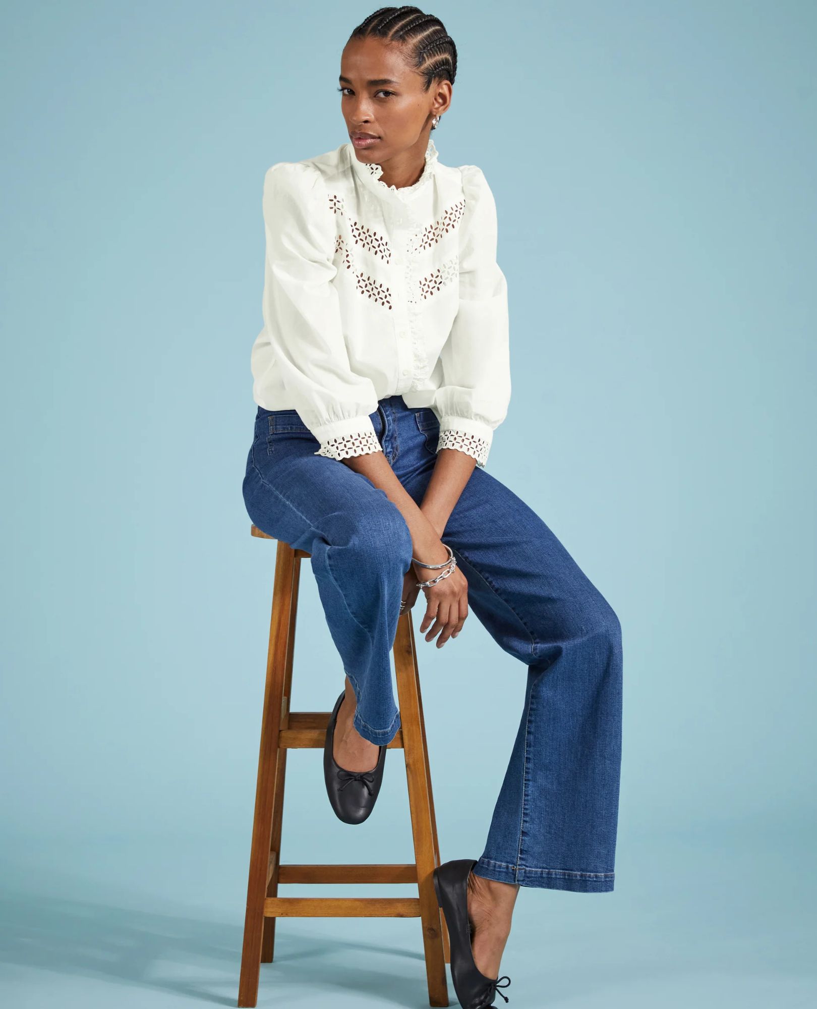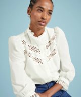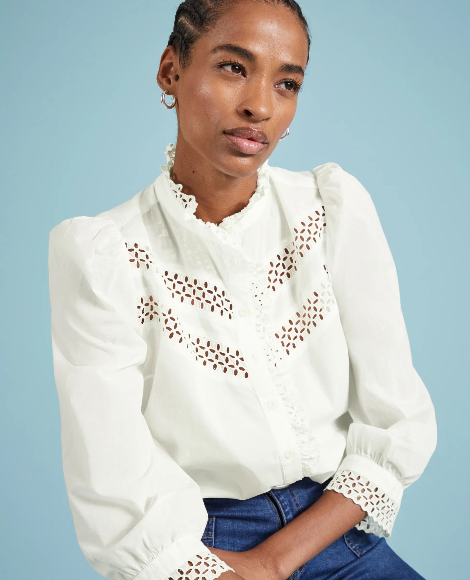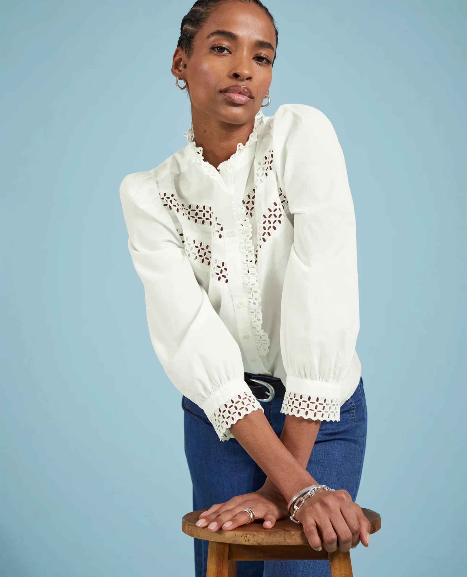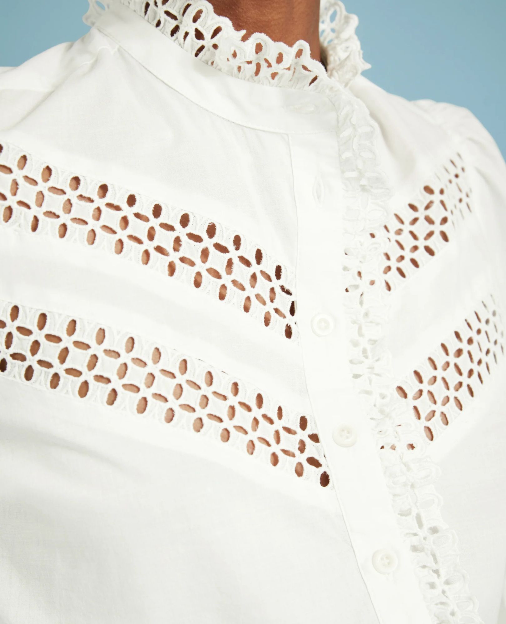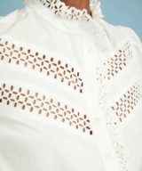 Get ready to fall in love with Isamaya—the ultimate romantic white cotton blouse. With intricate broderie anglaise panels, a ruffled collar, and beautifully embroidered cuffs, this blouse is a feminine must-have.