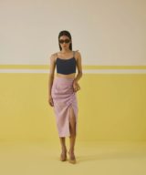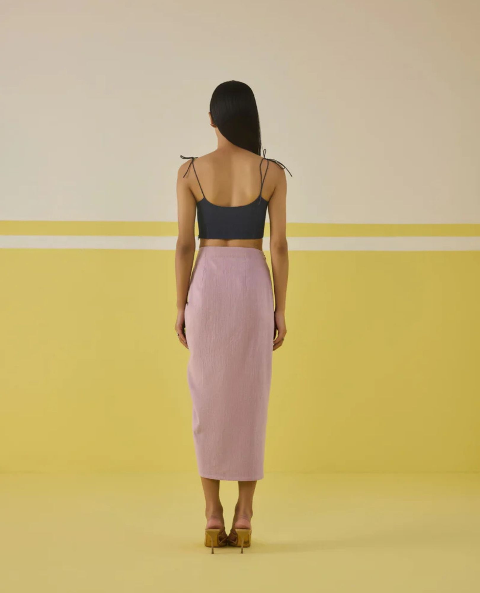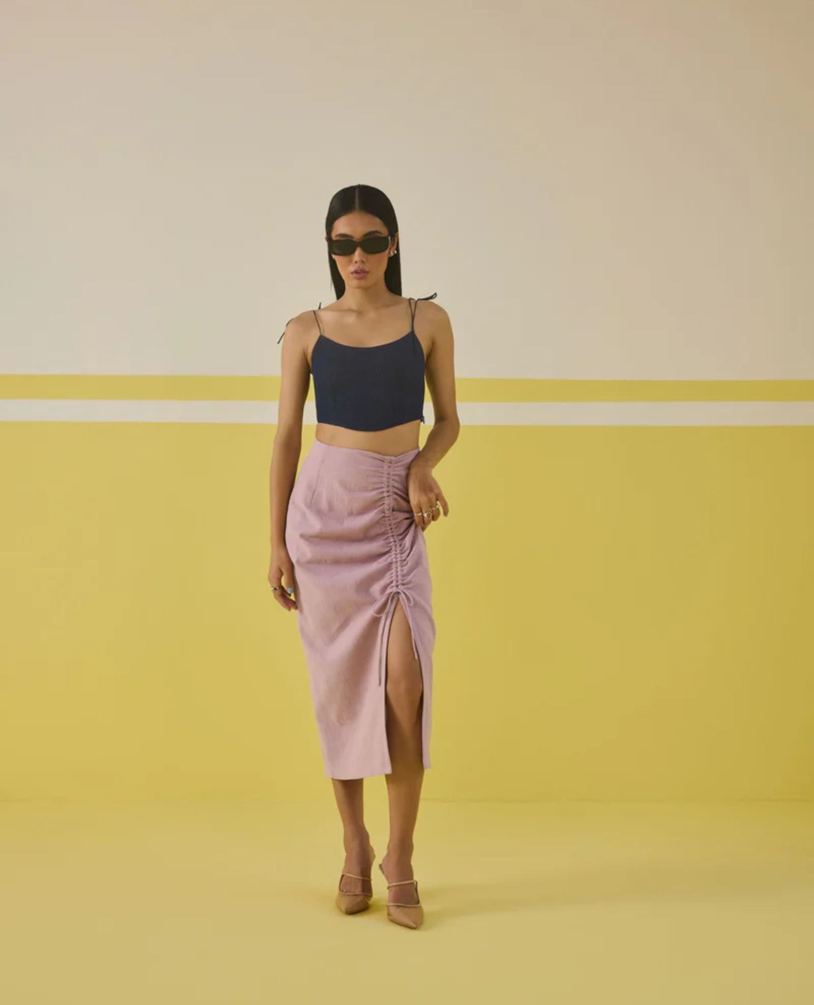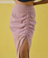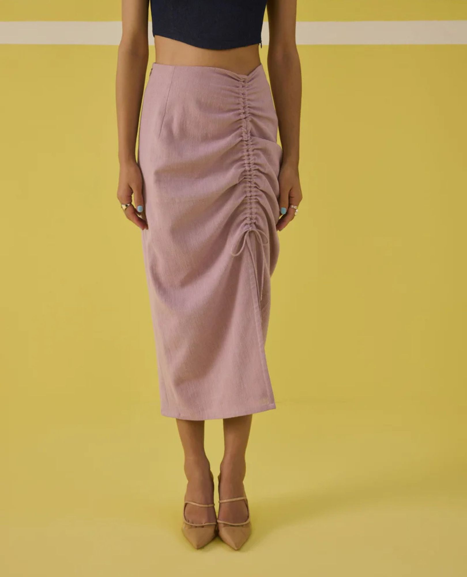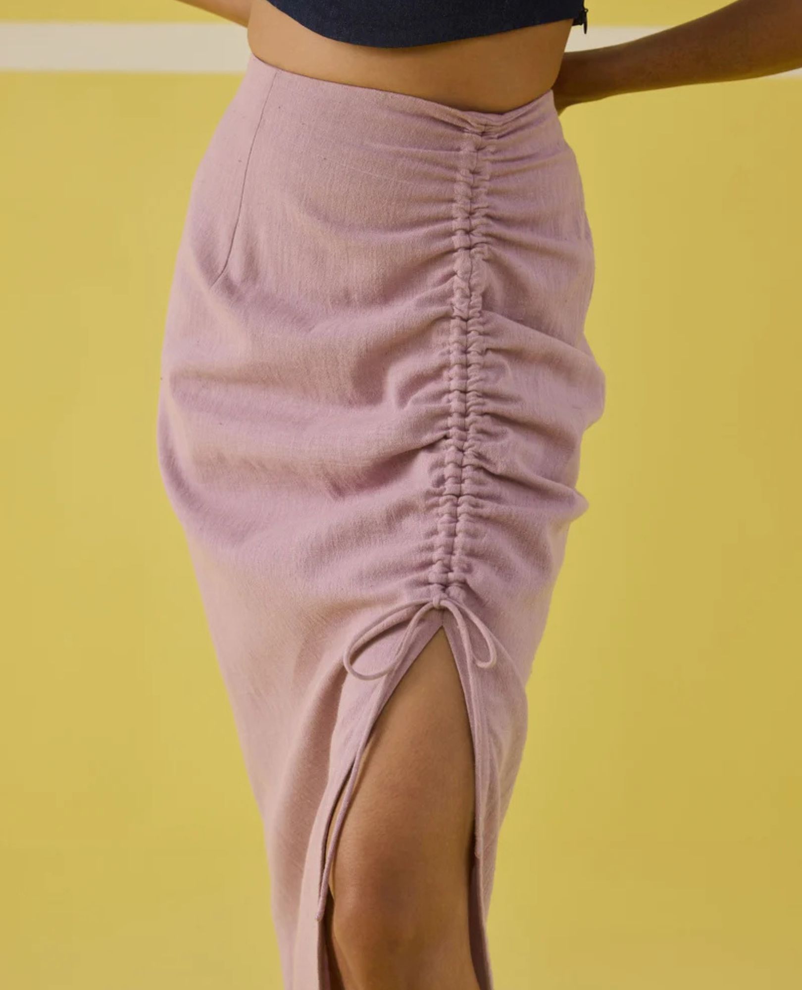 Elevate your wardrobe with the fitted, ruched maxi skirt featuring a stylish side slit and adjustable tie. Made from azo-free dyed, handspun organic cotton, this versatile piece is perfect for both special occasions and everyday wear.