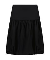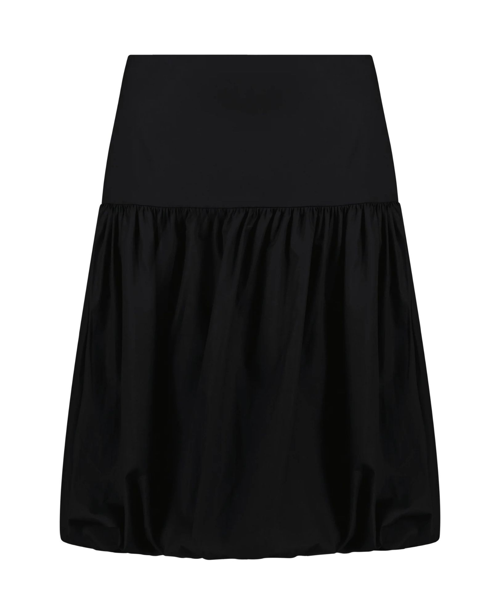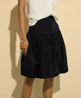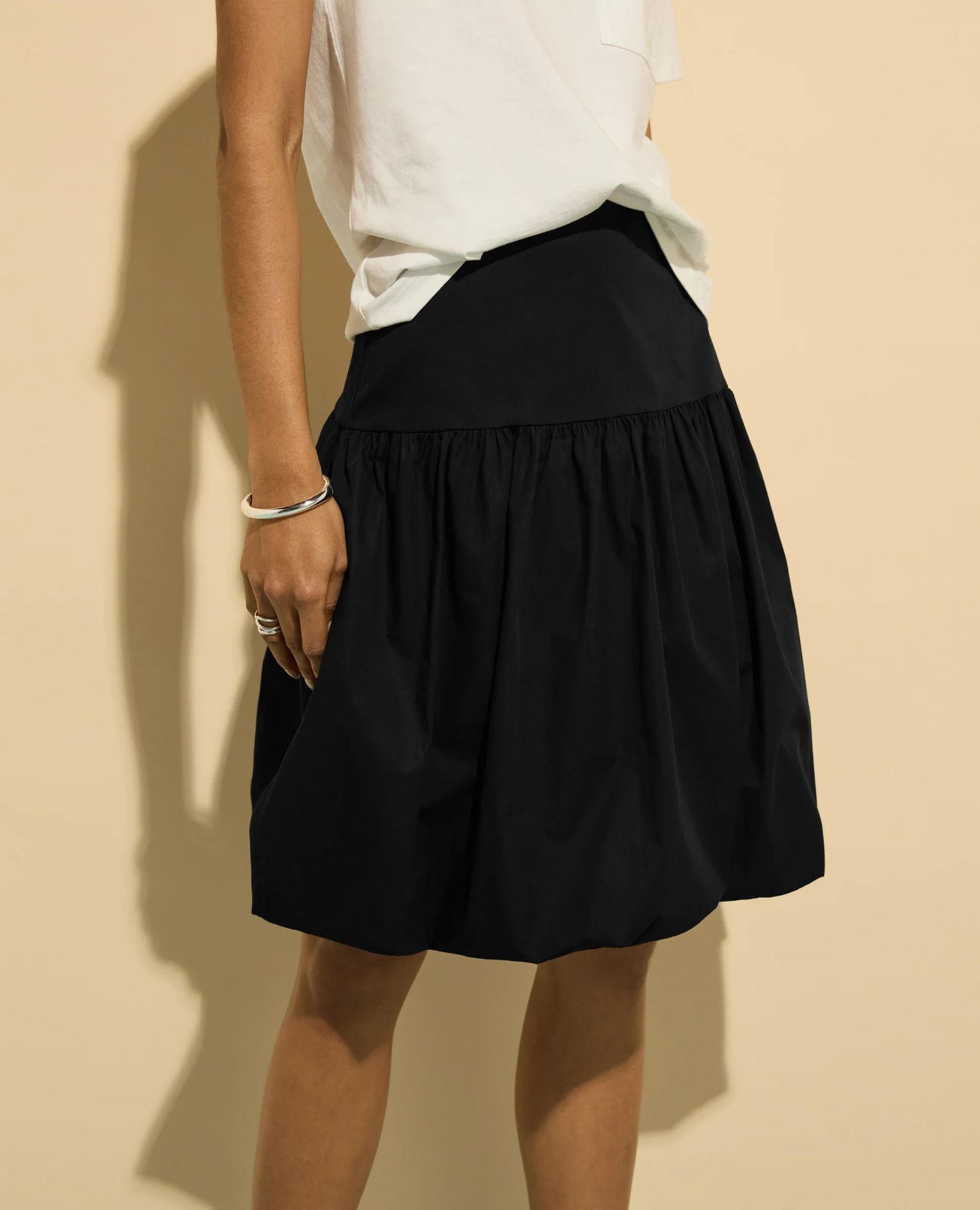 A playful puffball silhouette with a flat front and voluminous organic cotton poplin skirt. Knee-length with a concealed side zip. Made in Europe.