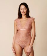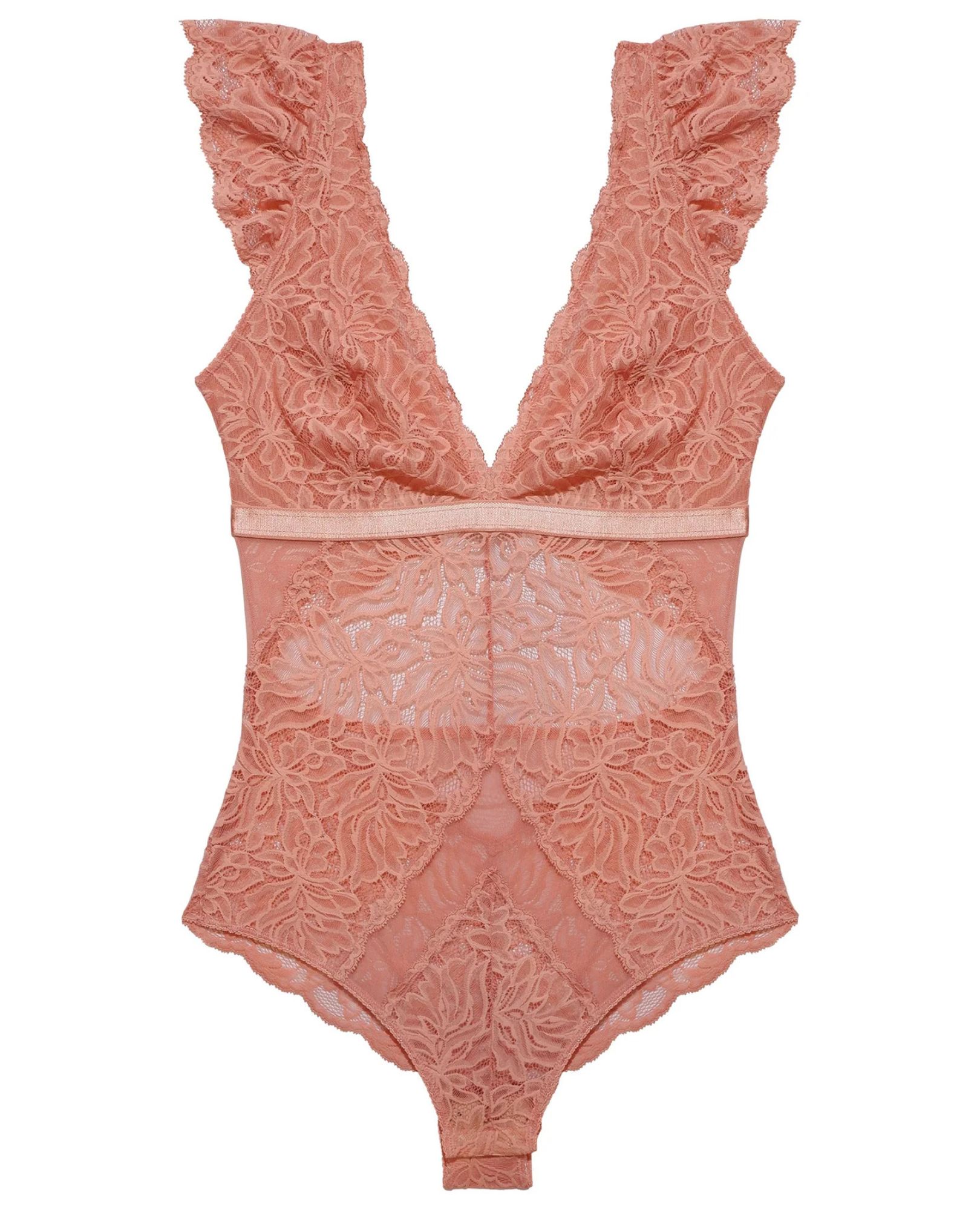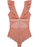 Turn heads in the Vicky bodystocking in rose—crafted from soft recycled mesh and delicate floral lace with romantic shoulder frills and a low back. Perfect for layering under high-rise pants and a blazer, finished with heels for an unforgettable night out.