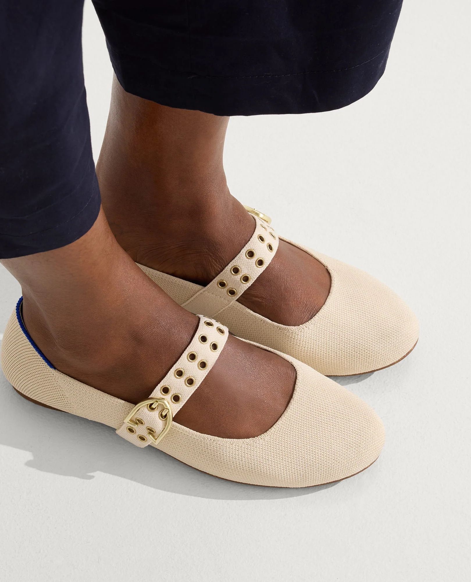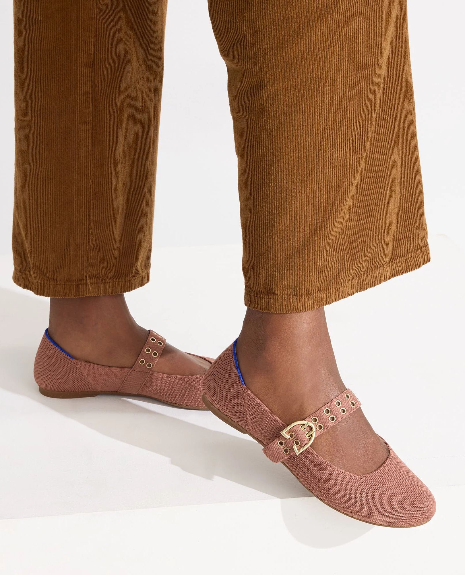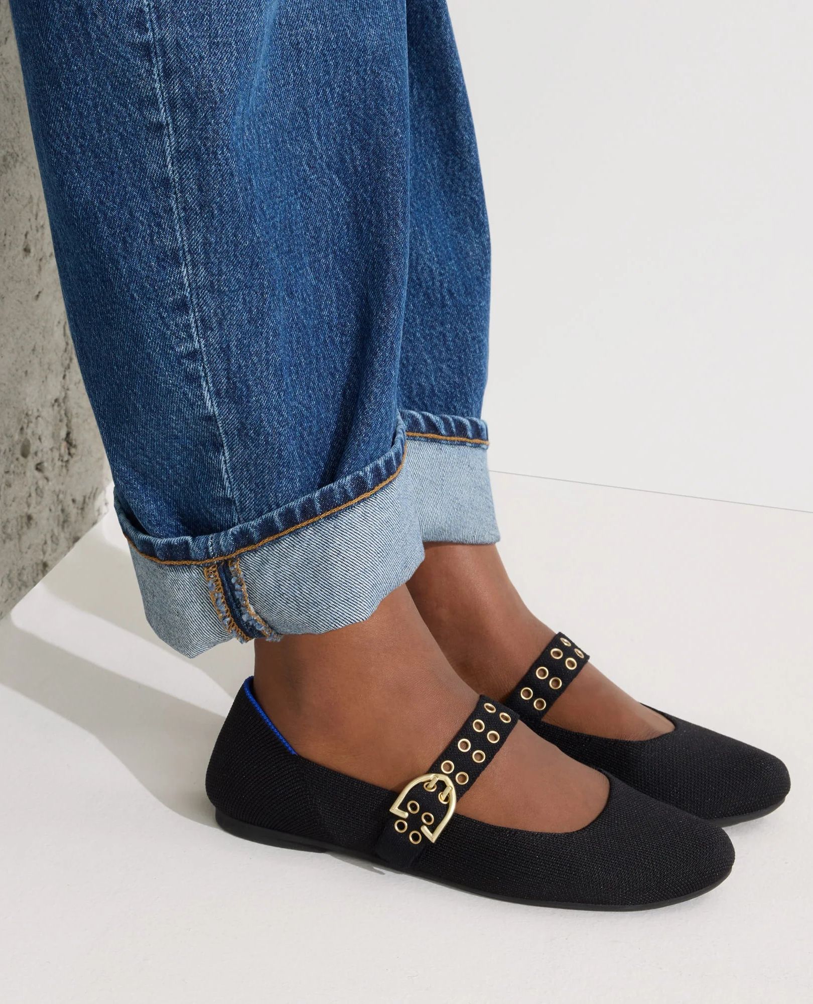 A timeless classic with a modern twist, the Ballet Mary Jane in black features a breathable knit upper made from approximately 10 recycled plastic bottles. With a smooth, rounded toe box, cushioned In Love Insole™, and adjustable signature straps with gold eyelets, these shoes balance elegance with edge. Sculpted black outsoles provide extra comfort and stability, making them perfect for all-day wear. Available in four versatile colors.