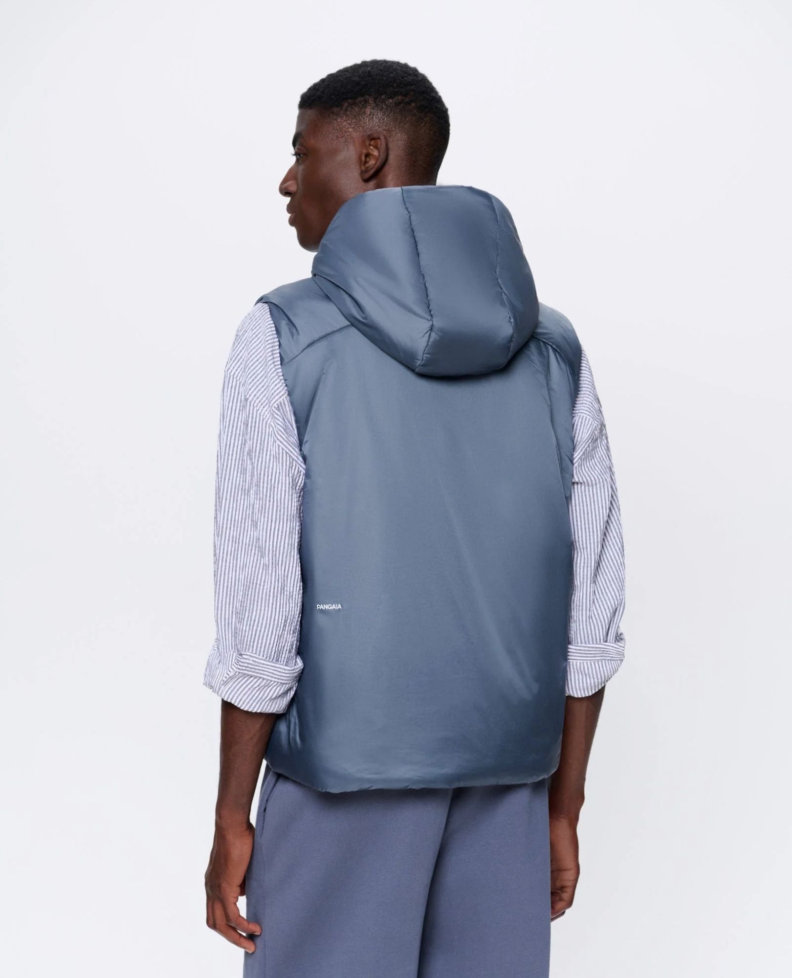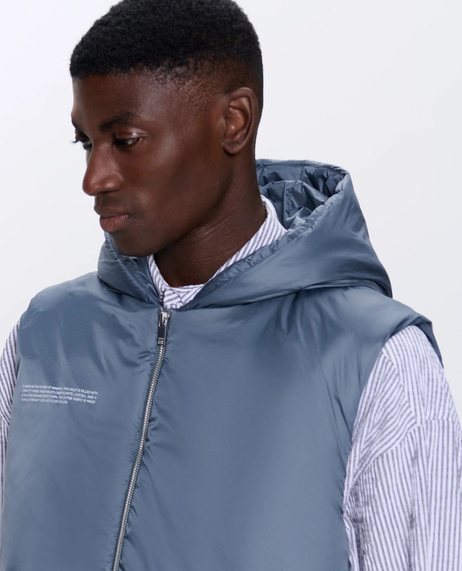 Stay warm sustainably with this FLWRDWN™ gilet—animal-free, lightweight, and eco-friendly, featuring a detachable hood and made from recycled nylon.