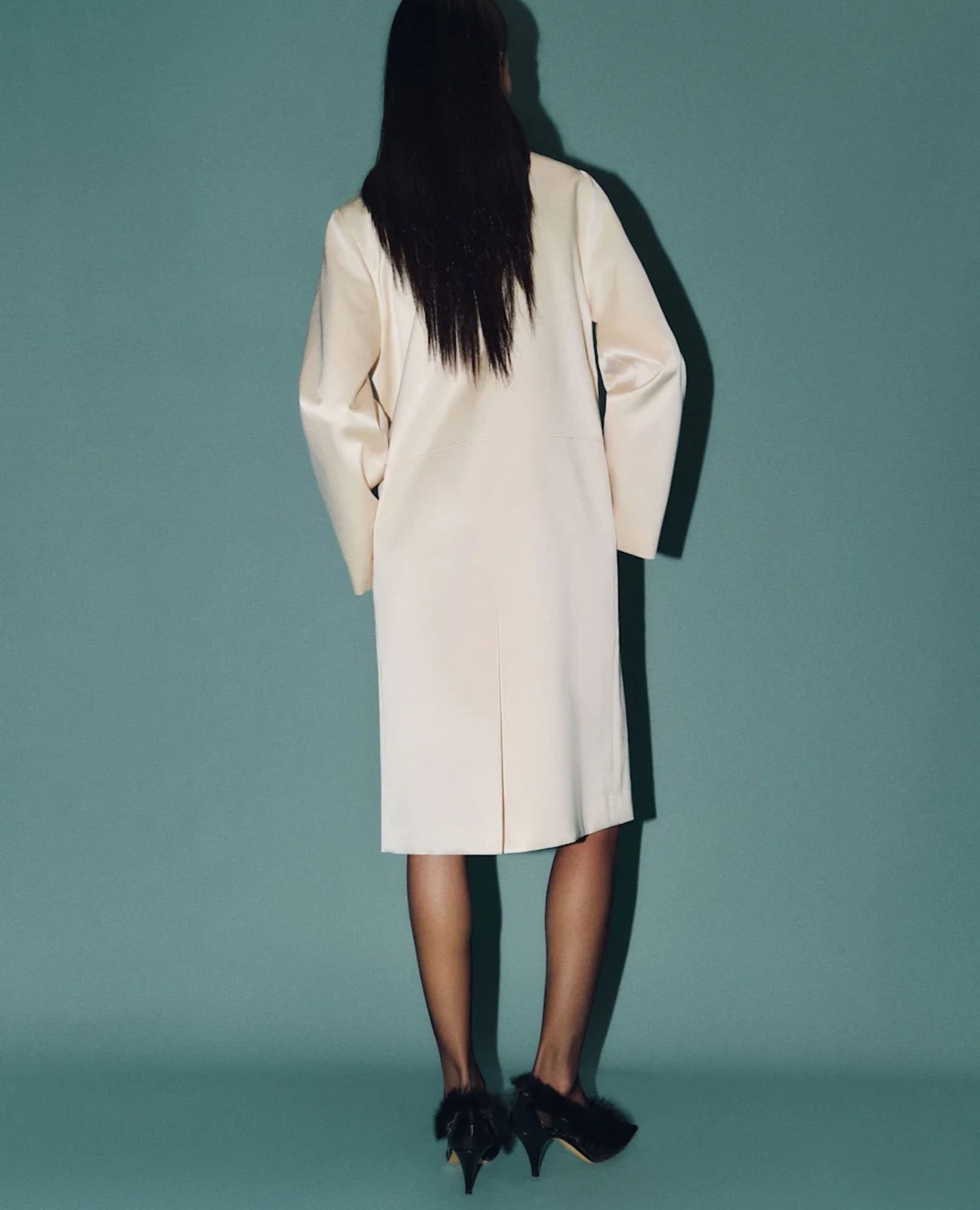 Long, luxurious, and effortlessly sleek — this full-length satin coat buttons up with quiet confidence. Designed for a slim, sculpted fit, it hugs your frame like a second skin.