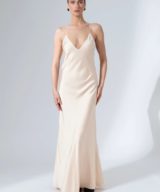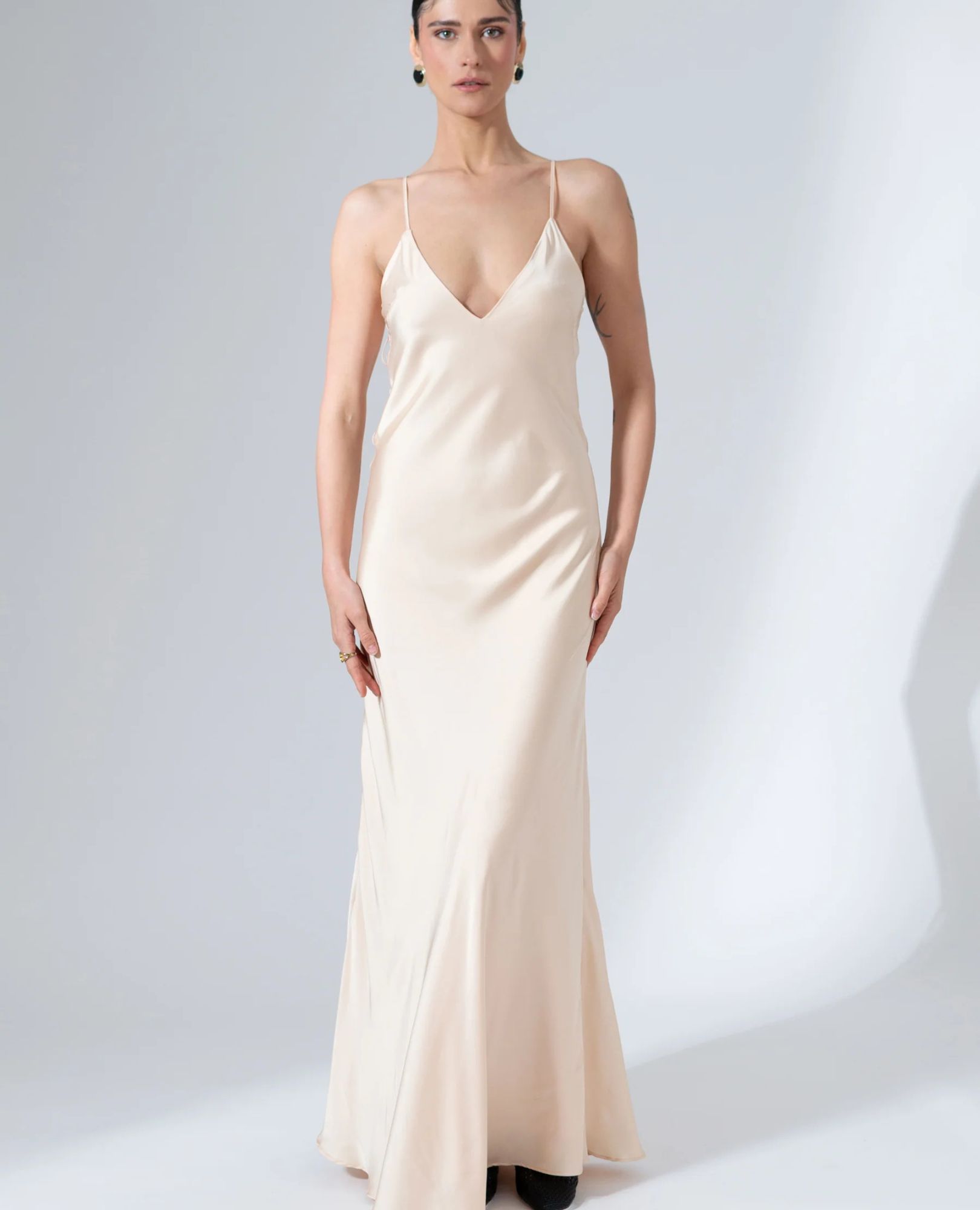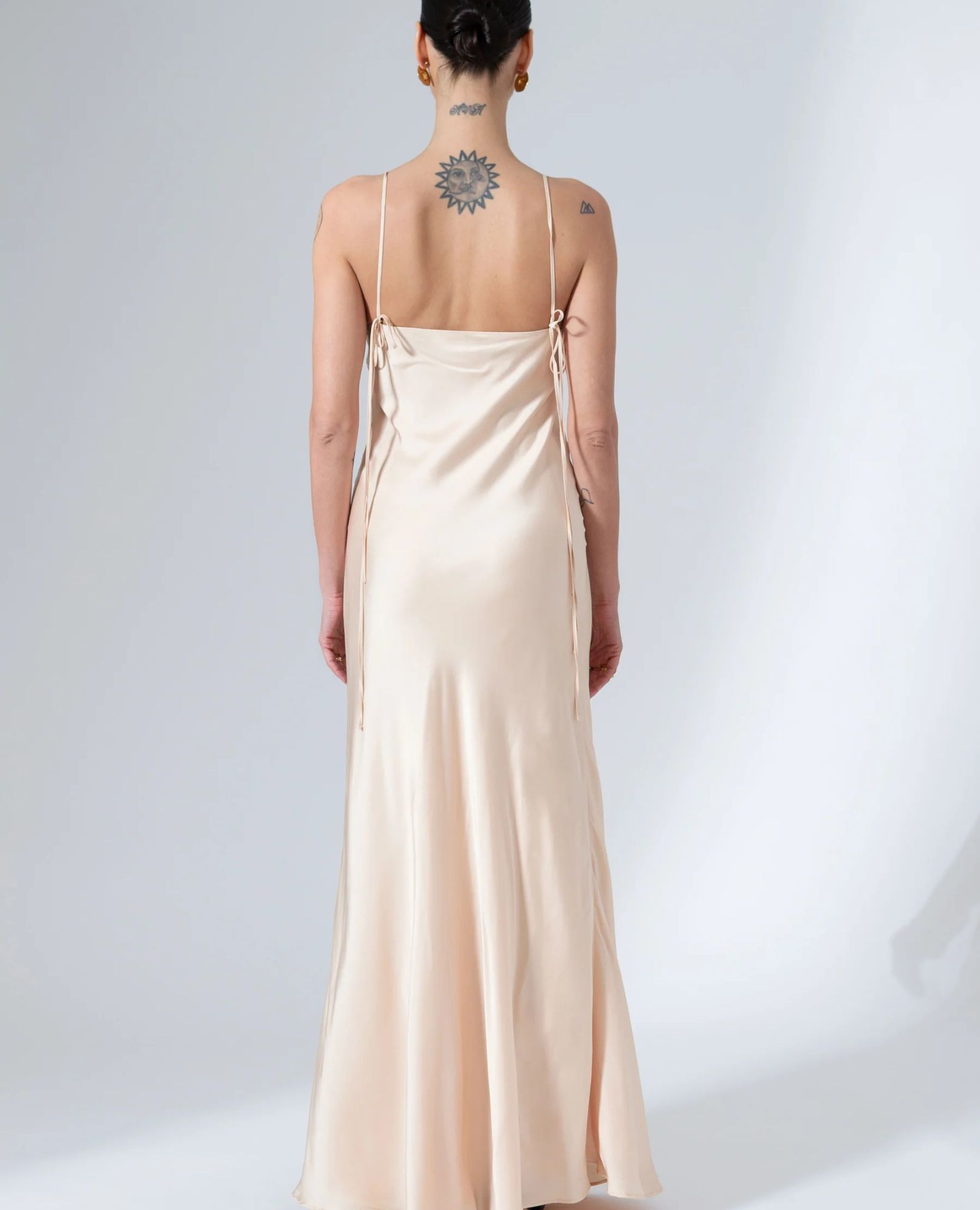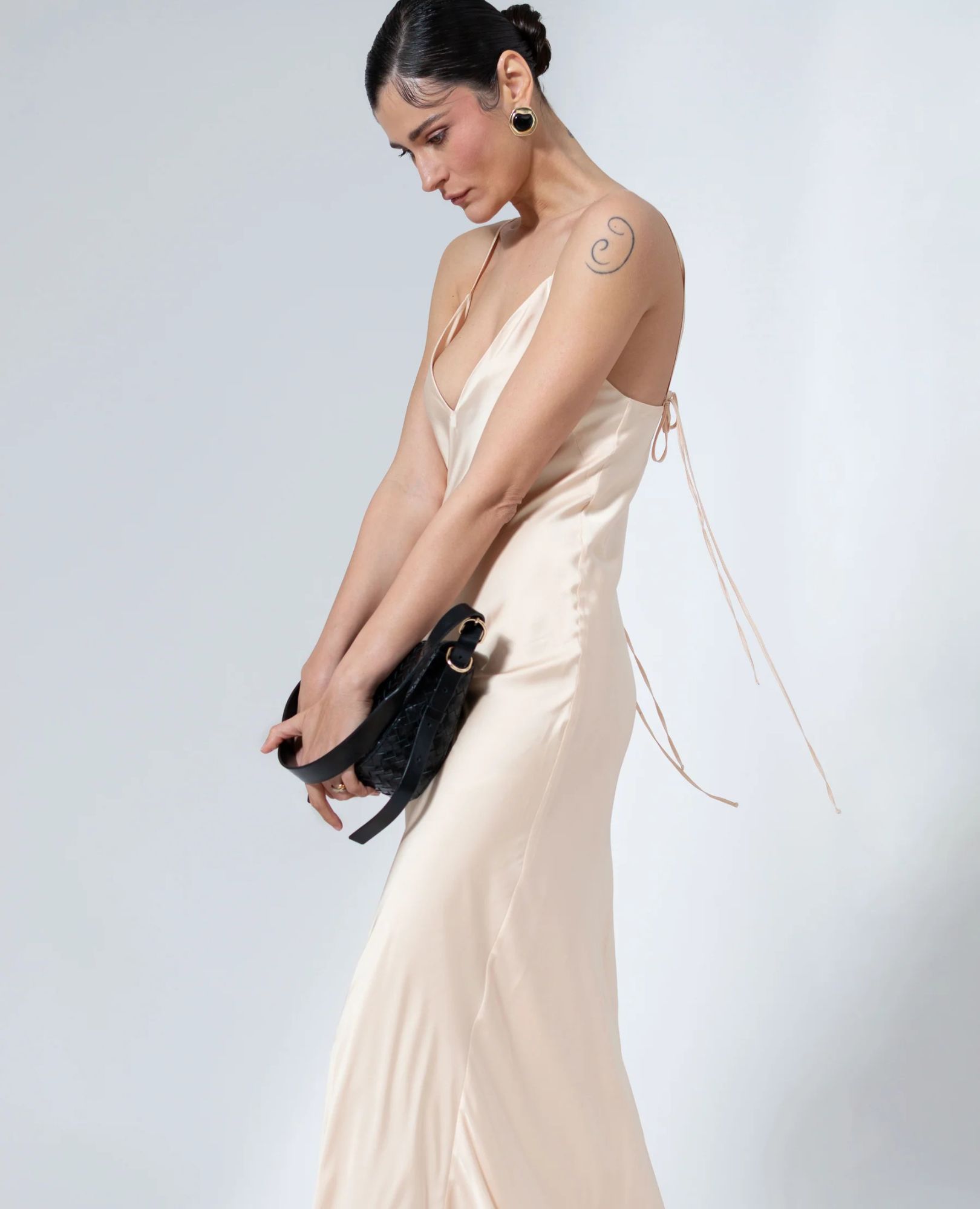 Slip into something effortlessly stunning. This butter-hued satin slip dress is made to move with you—cut on the bias for that dreamy drape and finished with dainty spaghetti straps, a deep V neckline, and adjustable side ties for your just-right fit.