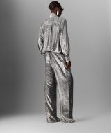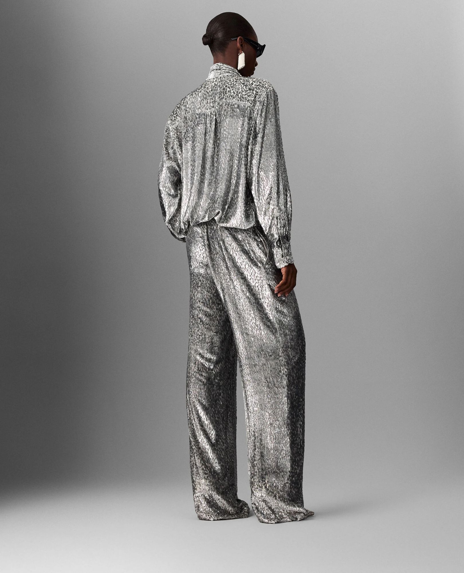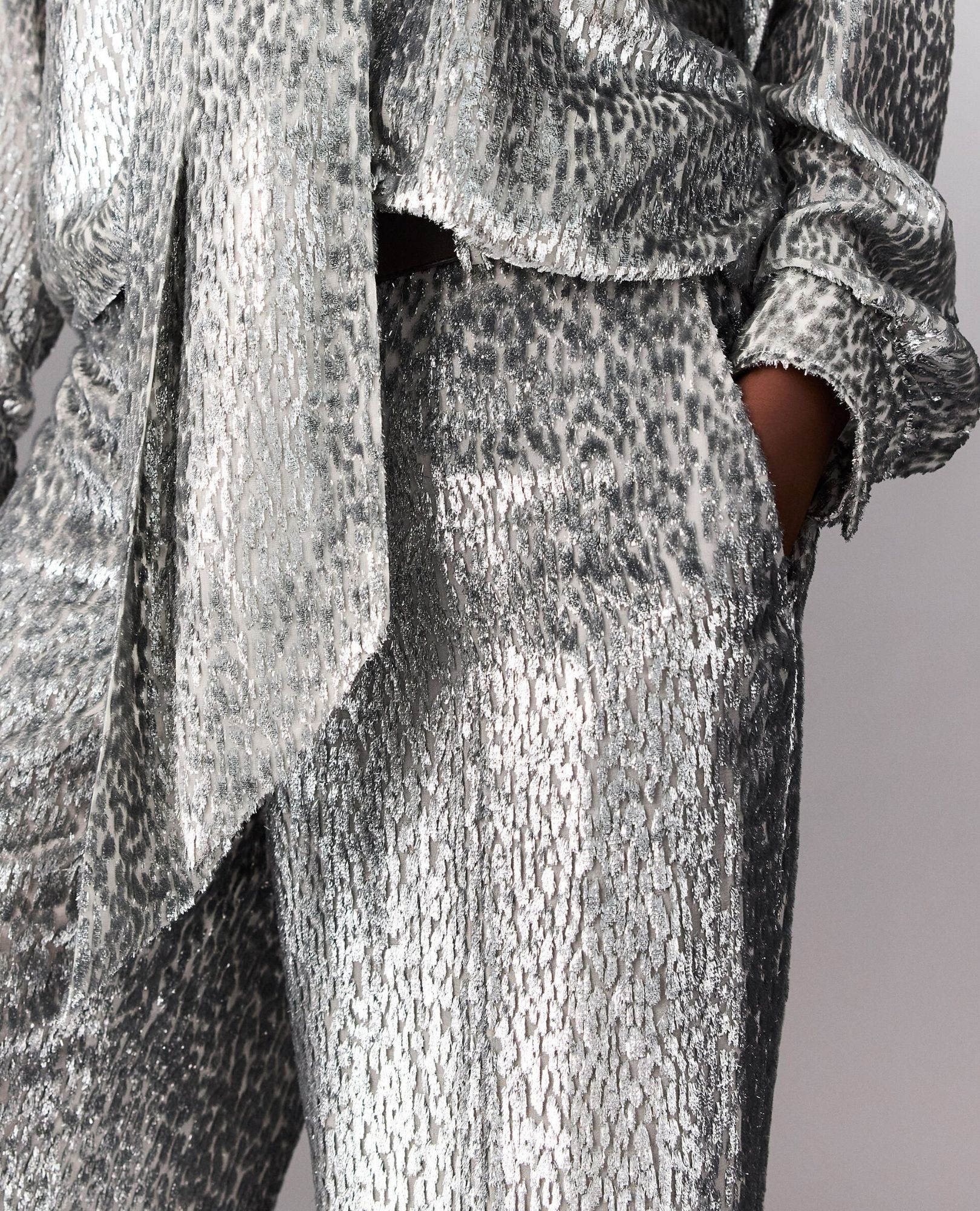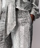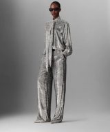 Stella McCartney’s silver lame velvet trousers — slouchy, straight, ankle-draped, and boldly textured.
