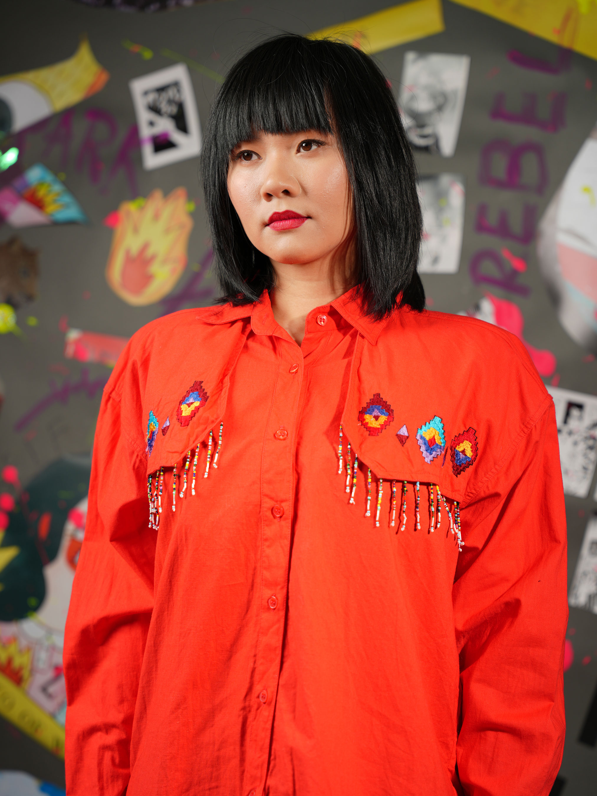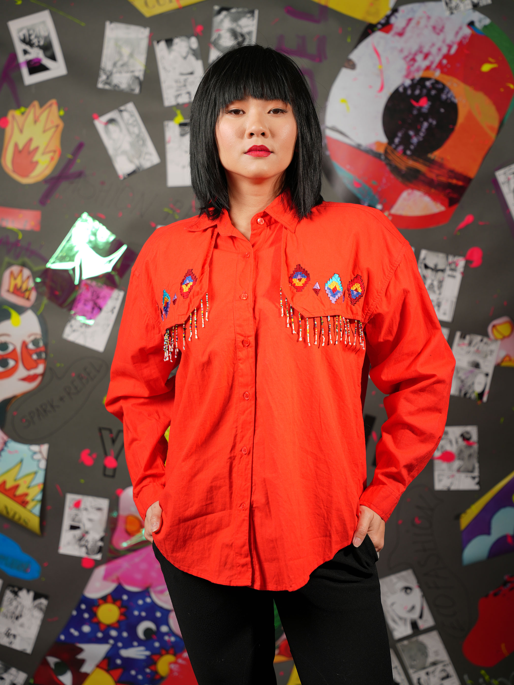 Wear this blouse loose over jeans and cowboy boots for a laid-back Western vibe, or tuck it into a flowy maxi skirt with layered jewelry for a boho-chic look. Want to add some edge? Pair it with fitted leather pants and ankle boots for a modern, effortless statement.