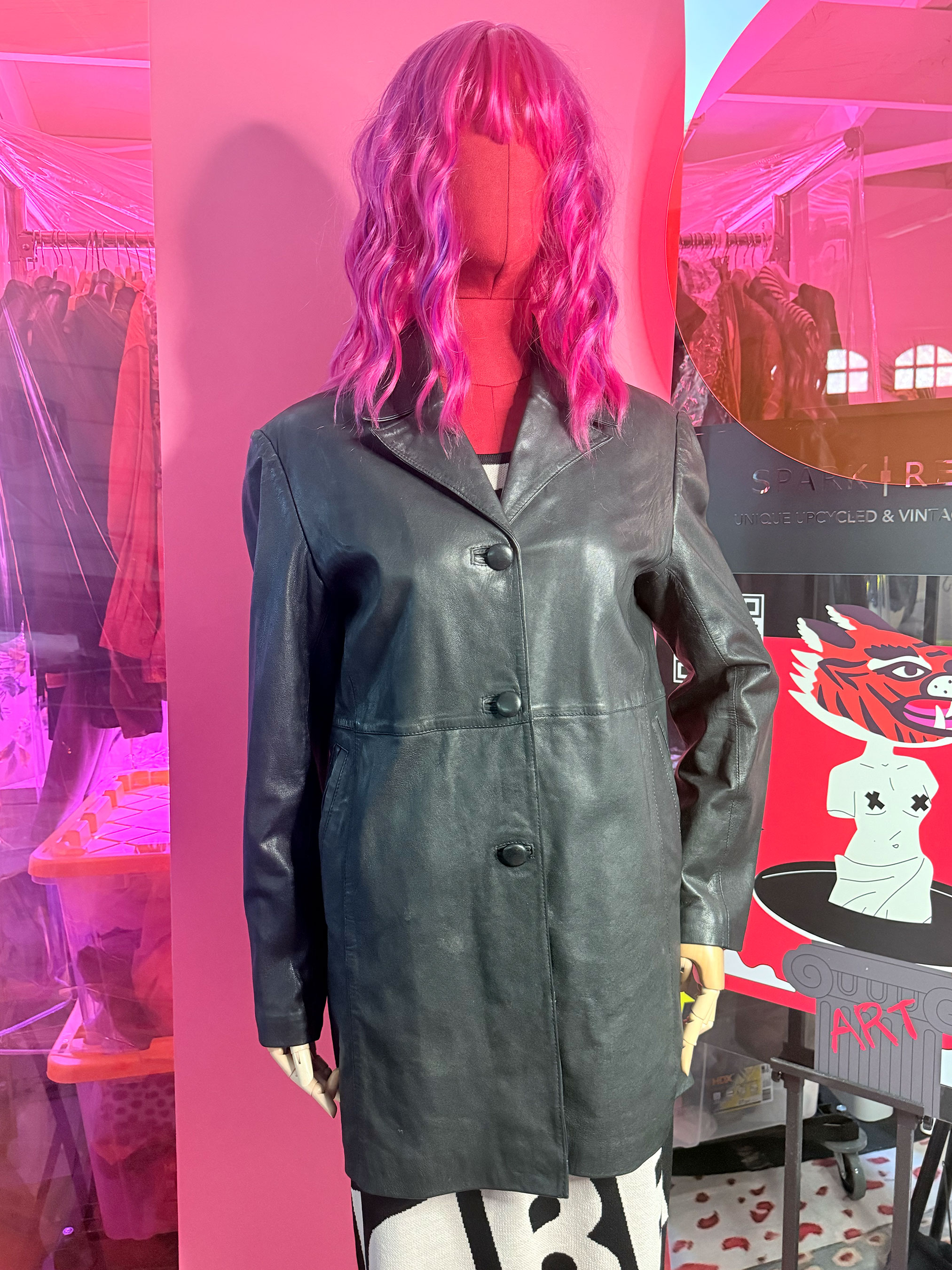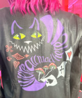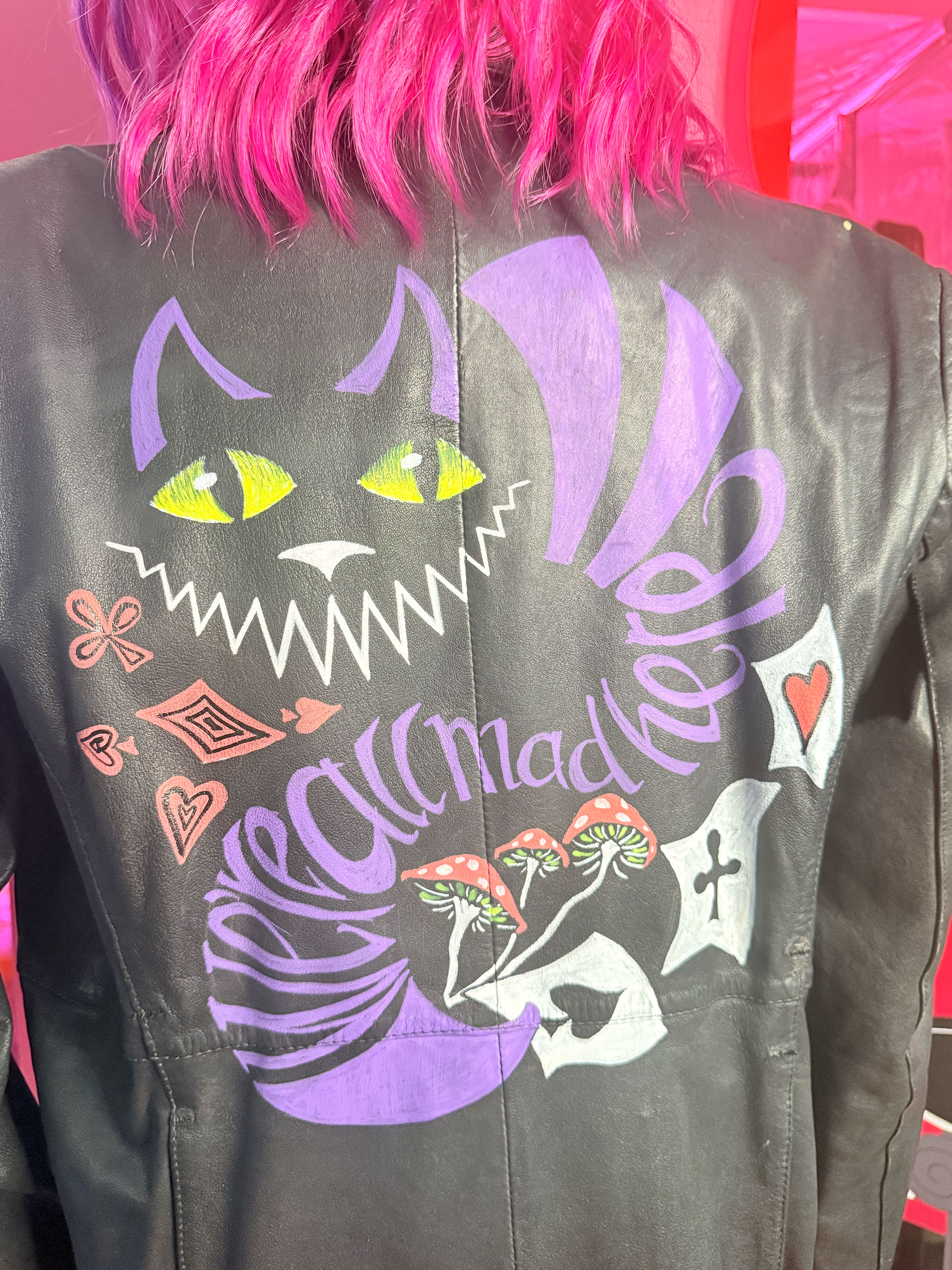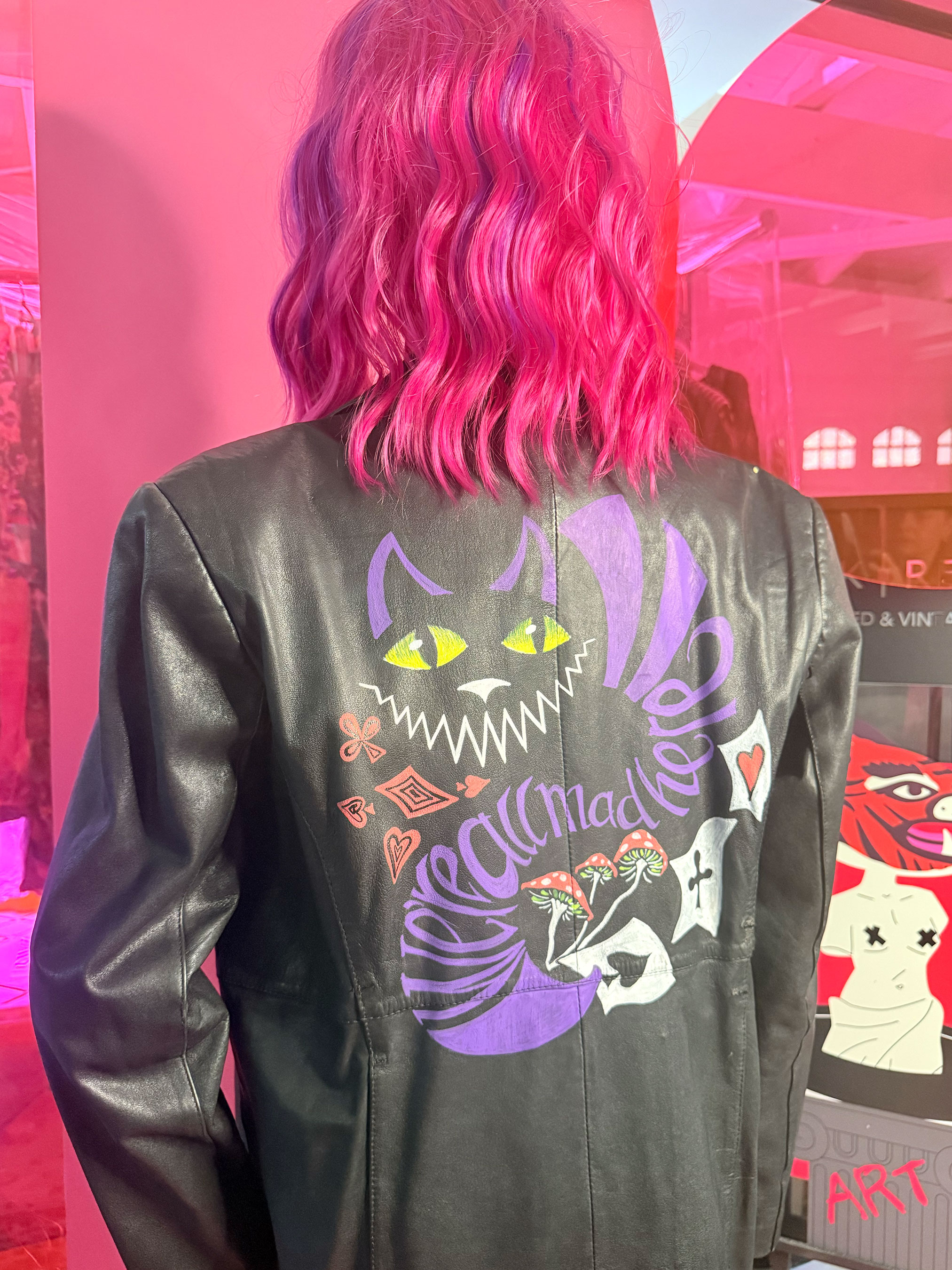 Unleash your wild side with this upcycled vintage leather jacket—neon cat eyes and “We’re all mad here” print make it a head-turning, festival-ready statement piece. Unisex and full of chaotic charm.