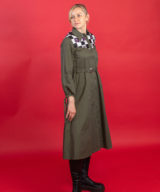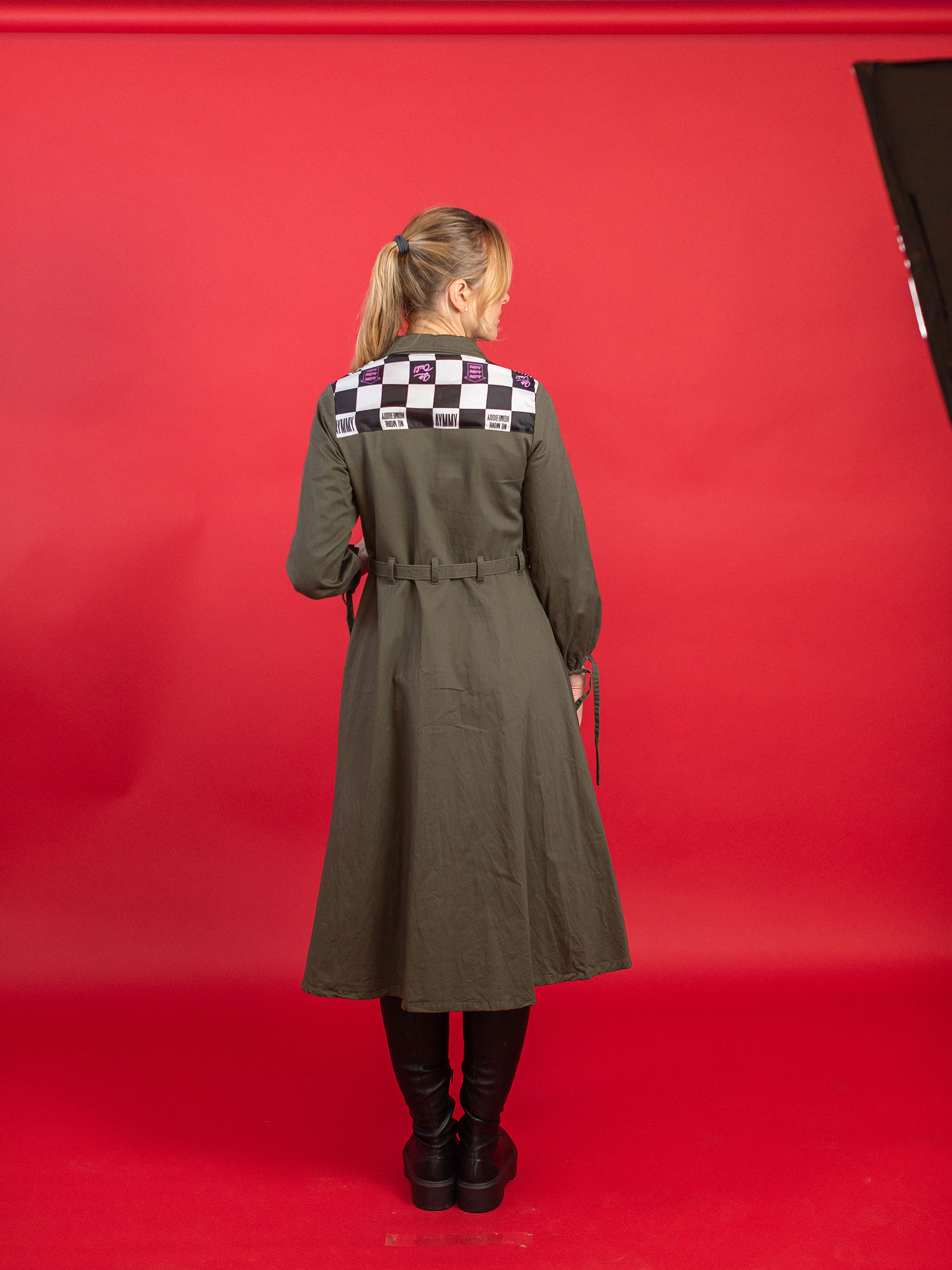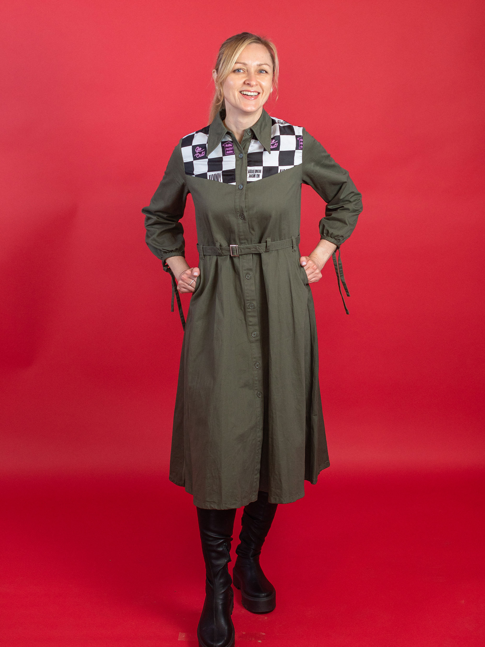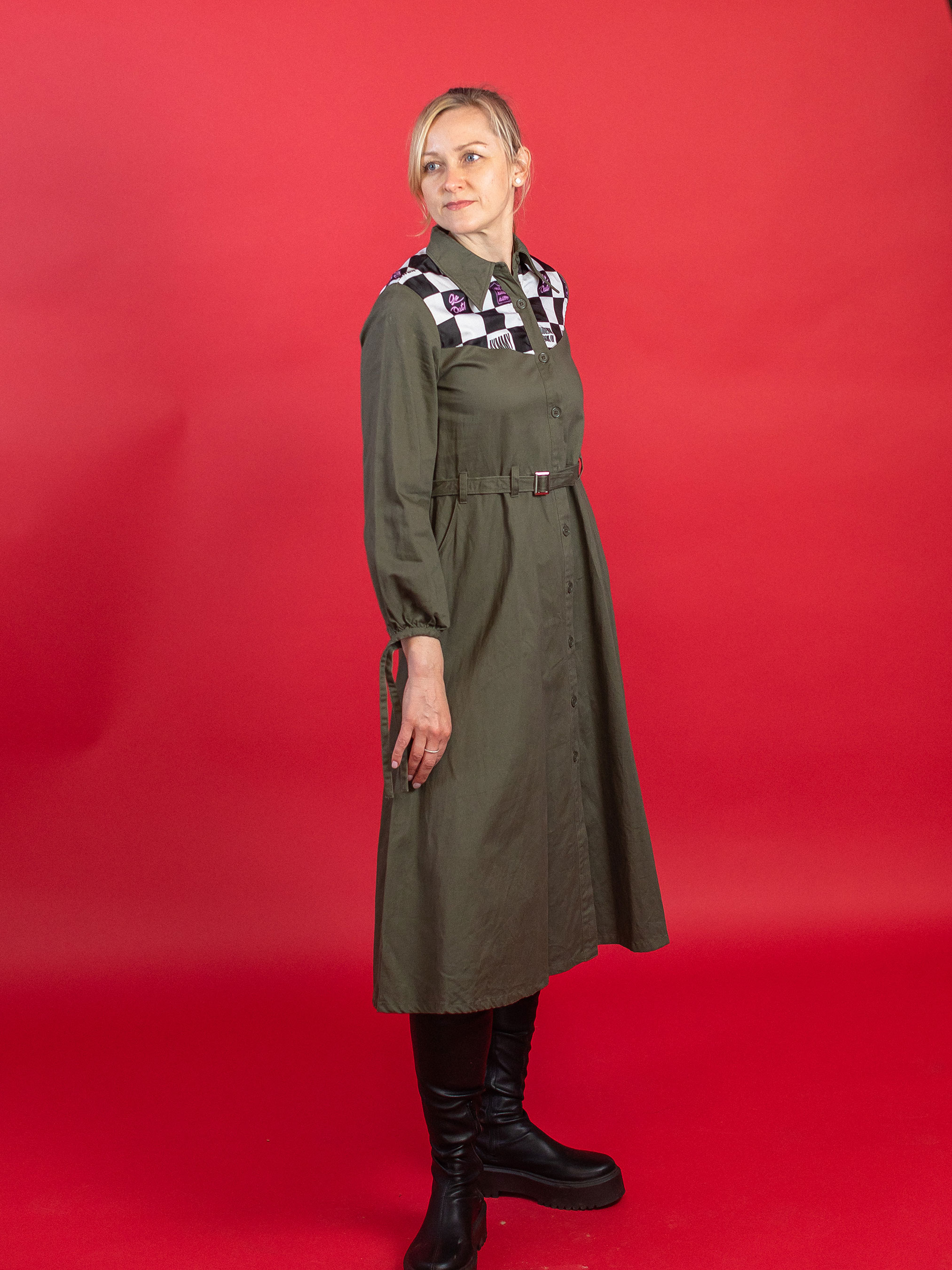 Pair this dress with chunky ankle boots and a structured crossbody bag for an edgy street-style look. For a softer vibe, add white sneakers and a denim jacket. Don’t forget to accessorize with minimal jewelry to let the unique print shine.