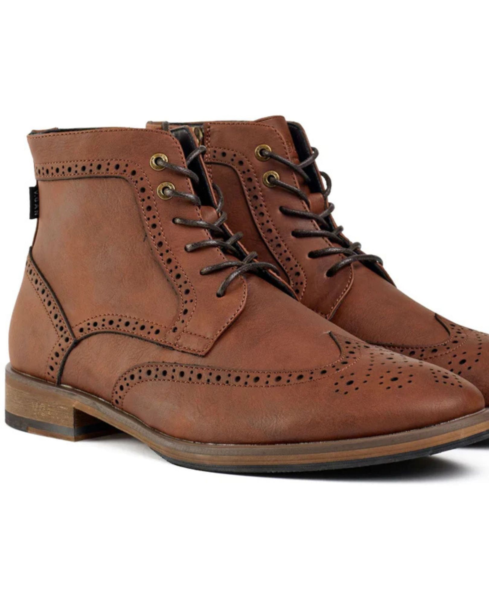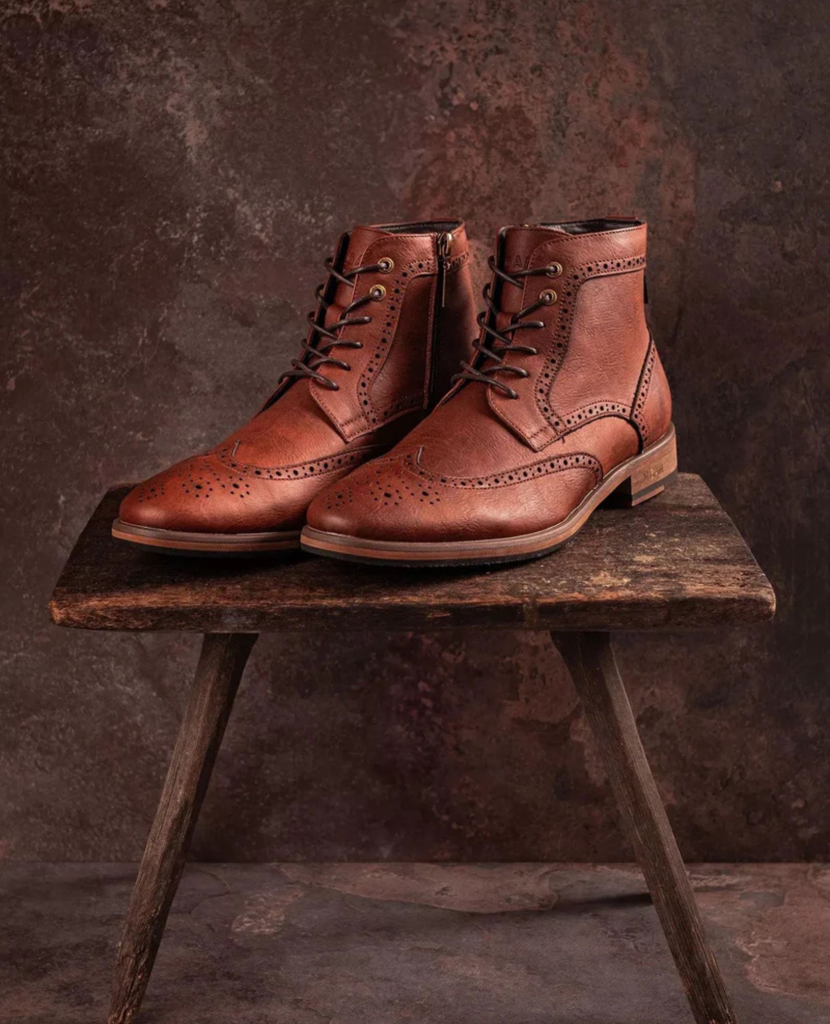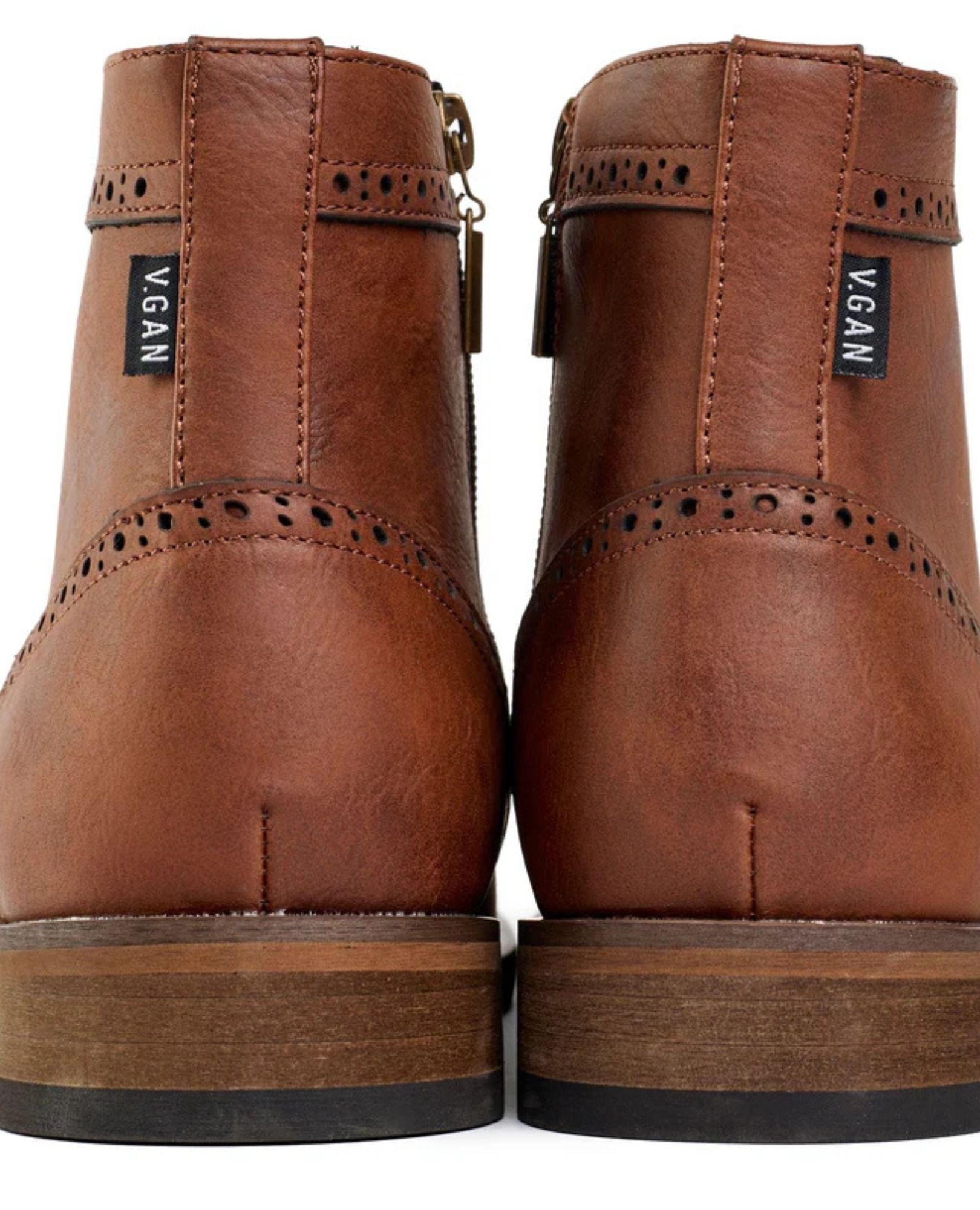 A timeless brogue boot, now reimagined with fresh aquatic prints, refined metal branding, and updated logo details. Crafted from high-quality vegan leather in a rich tan shade, these boots are PETA-approved, cruelty-free, and made in a vegan-certified factory. Designed for both style and sustainability, they come in recycled packaging for a lower impact on the planet.