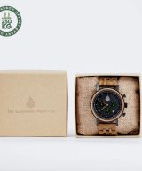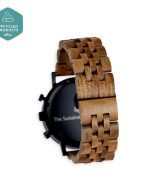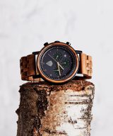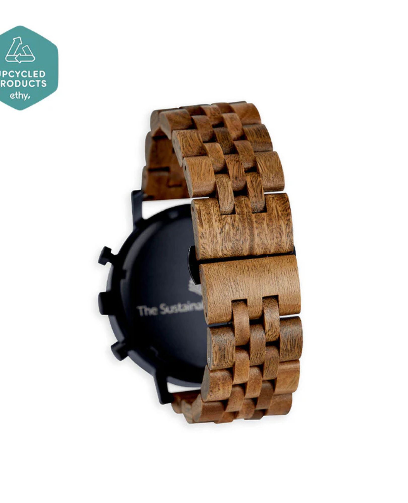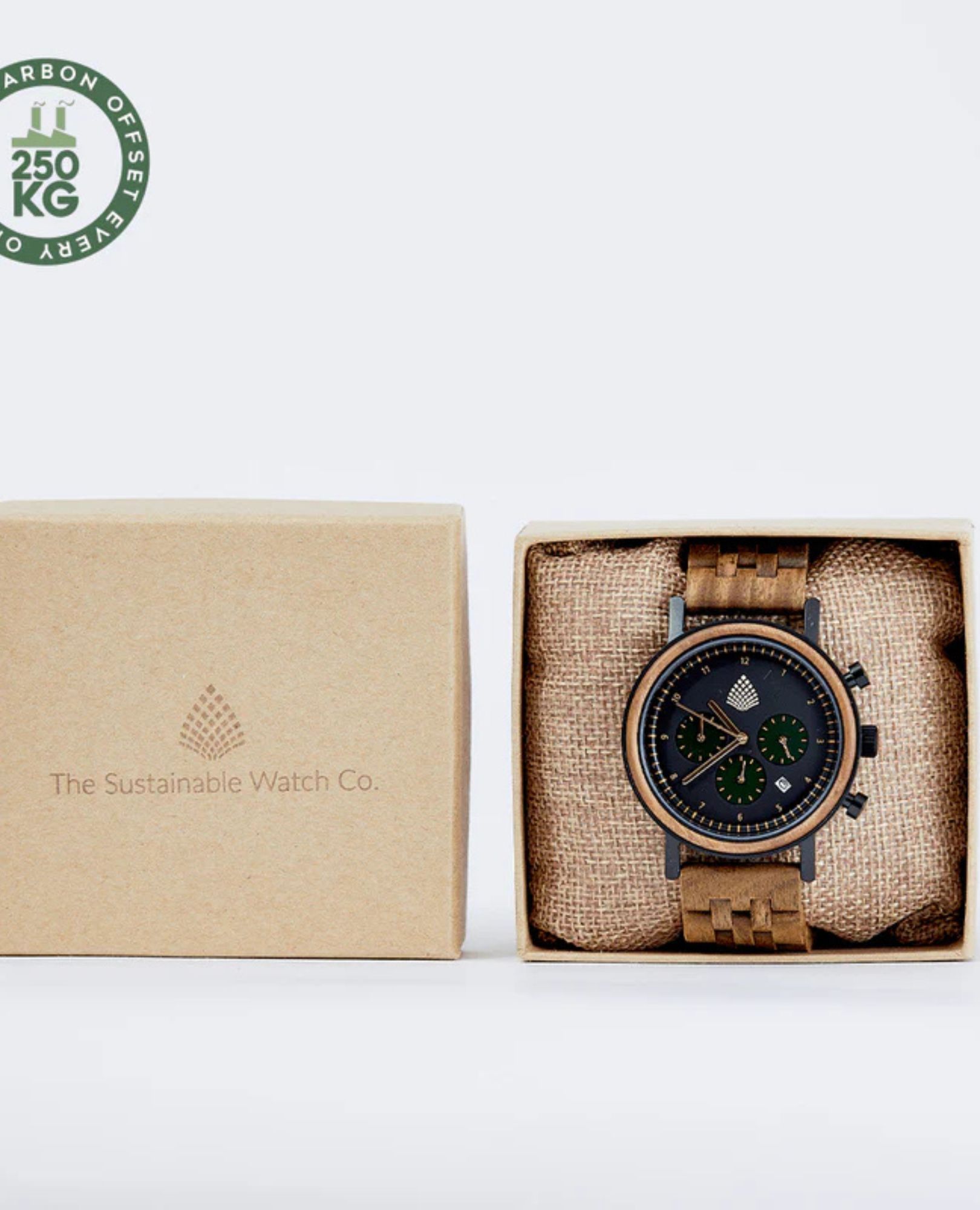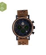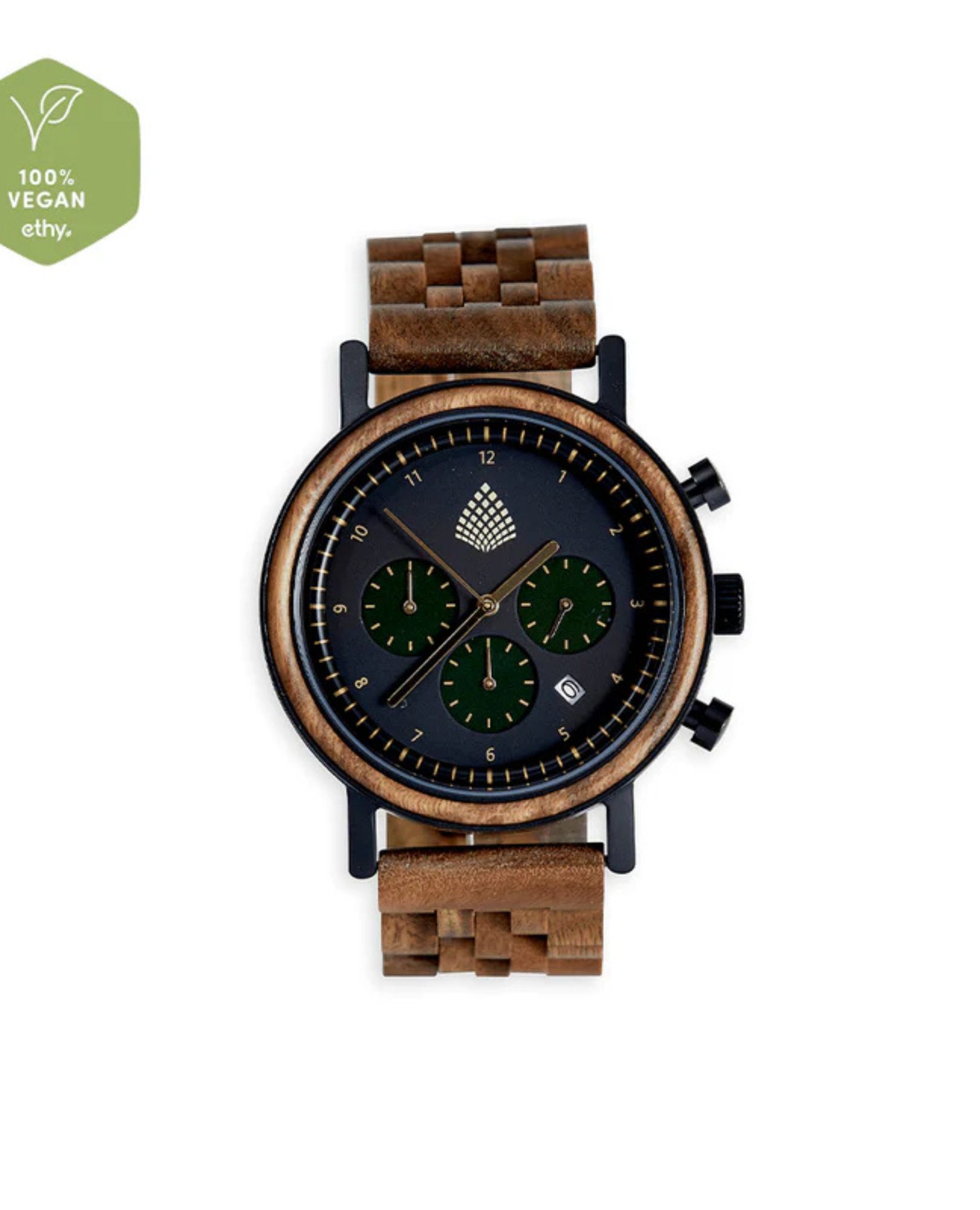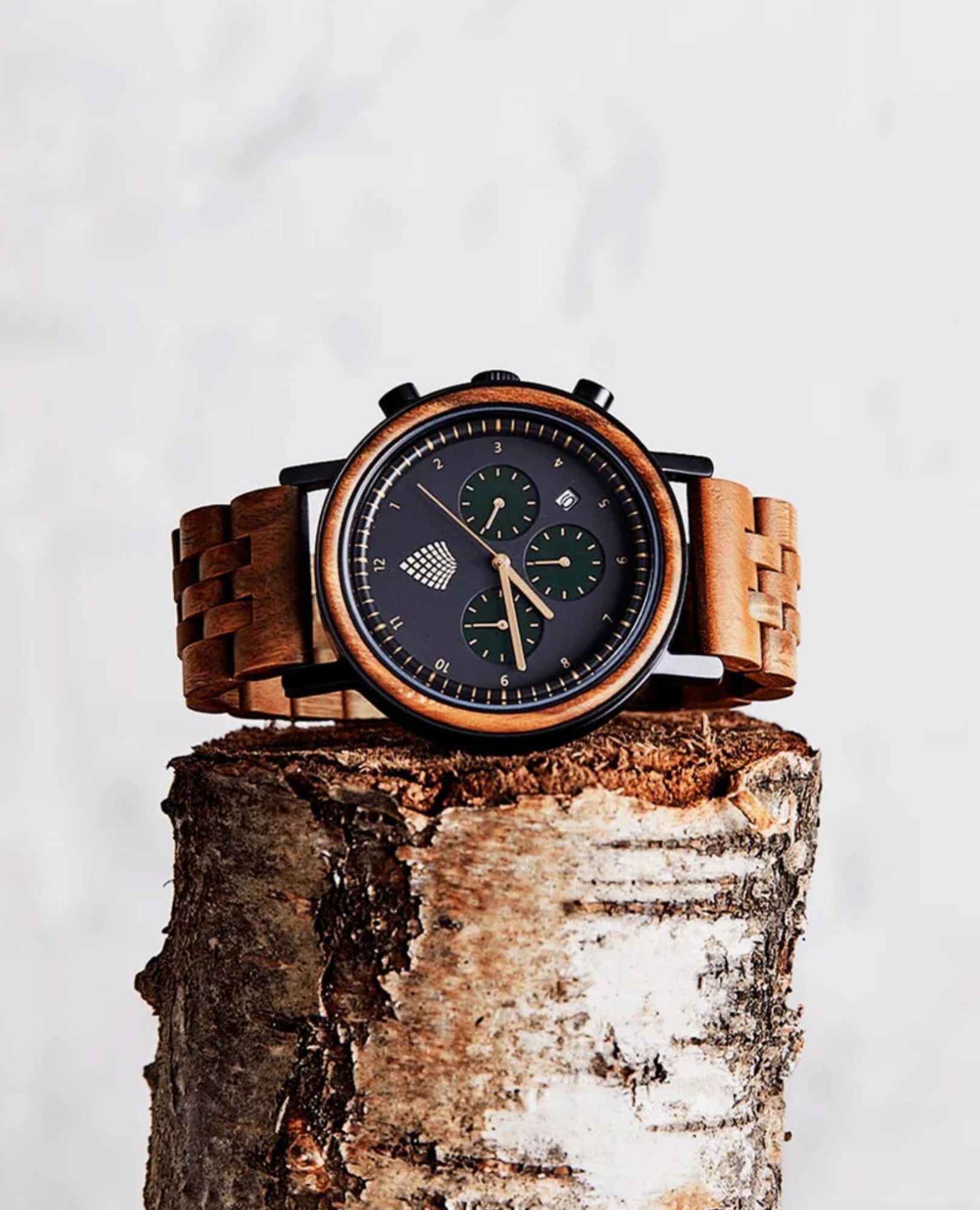 Crafted from recycled wood furniture, The Cedar watch blends rugged sophistication with eco-conscious design. Featuring a matte black case, dark green stopwatch dials, gold accents, and a rich dark brown wooden ring and strap, this timepiece is as stylish as it is sustainable. Plus, it comes with an adjustable band and eco-friendly packaging.