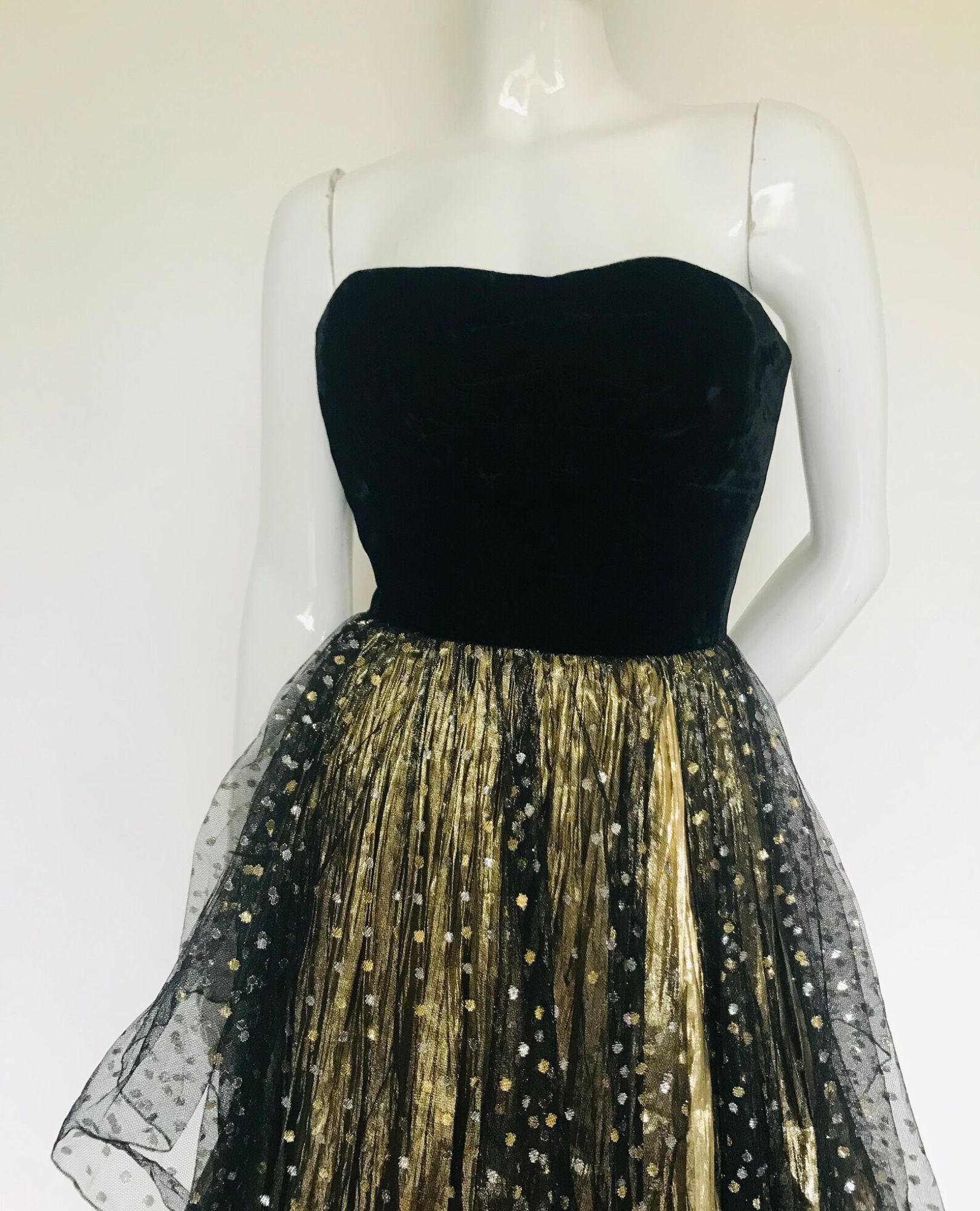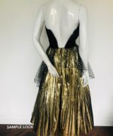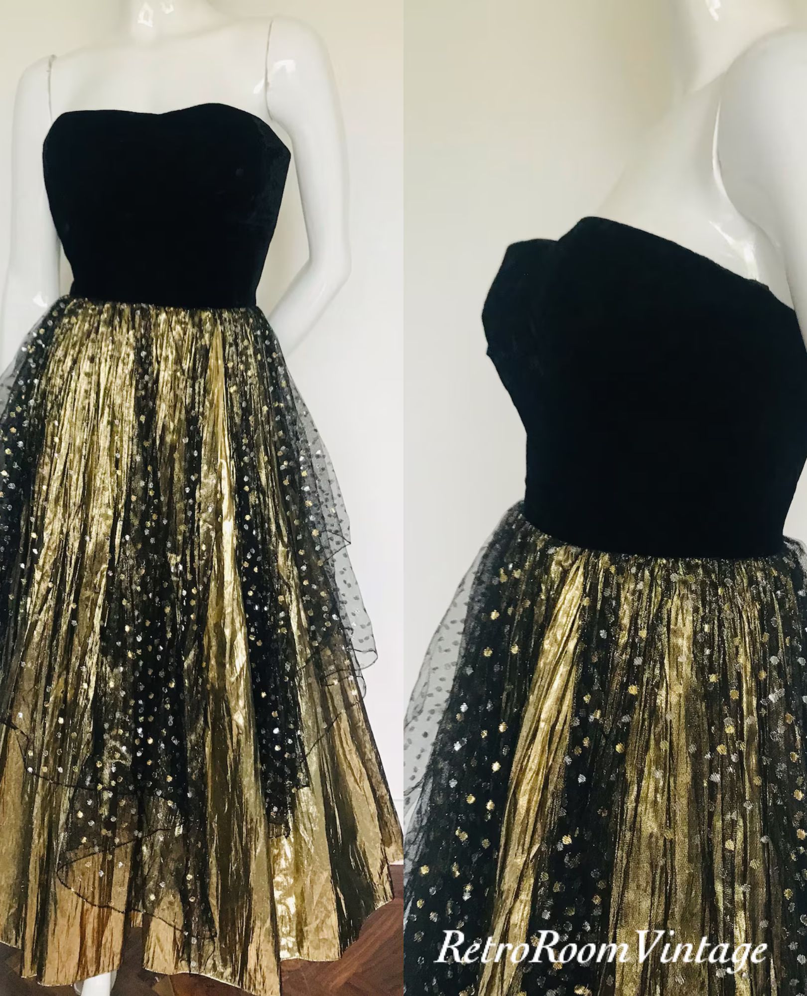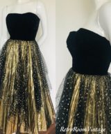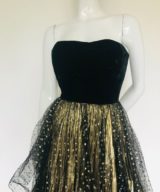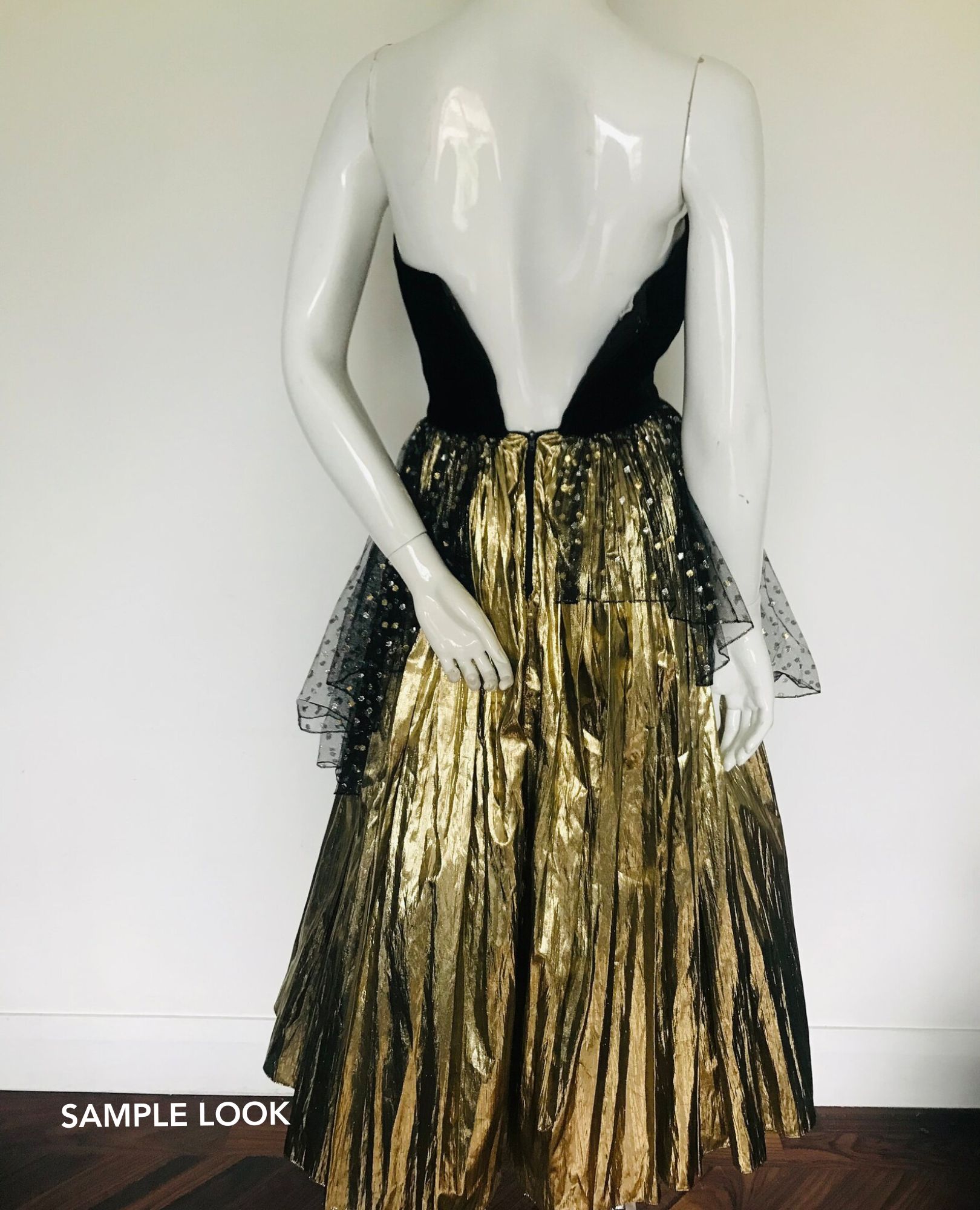 Step into 1980s opulence with this original Doree Leventhhal dress—velvet boned bodice meets a gold lame full skirt with netting, fully lined for drama. Approx UK size 6 (bust 16.5″ flat, waist 12″, waist to hem 37″), in pristine condition with no flaws. Zipper works fine—it’s just a stiff model.