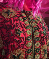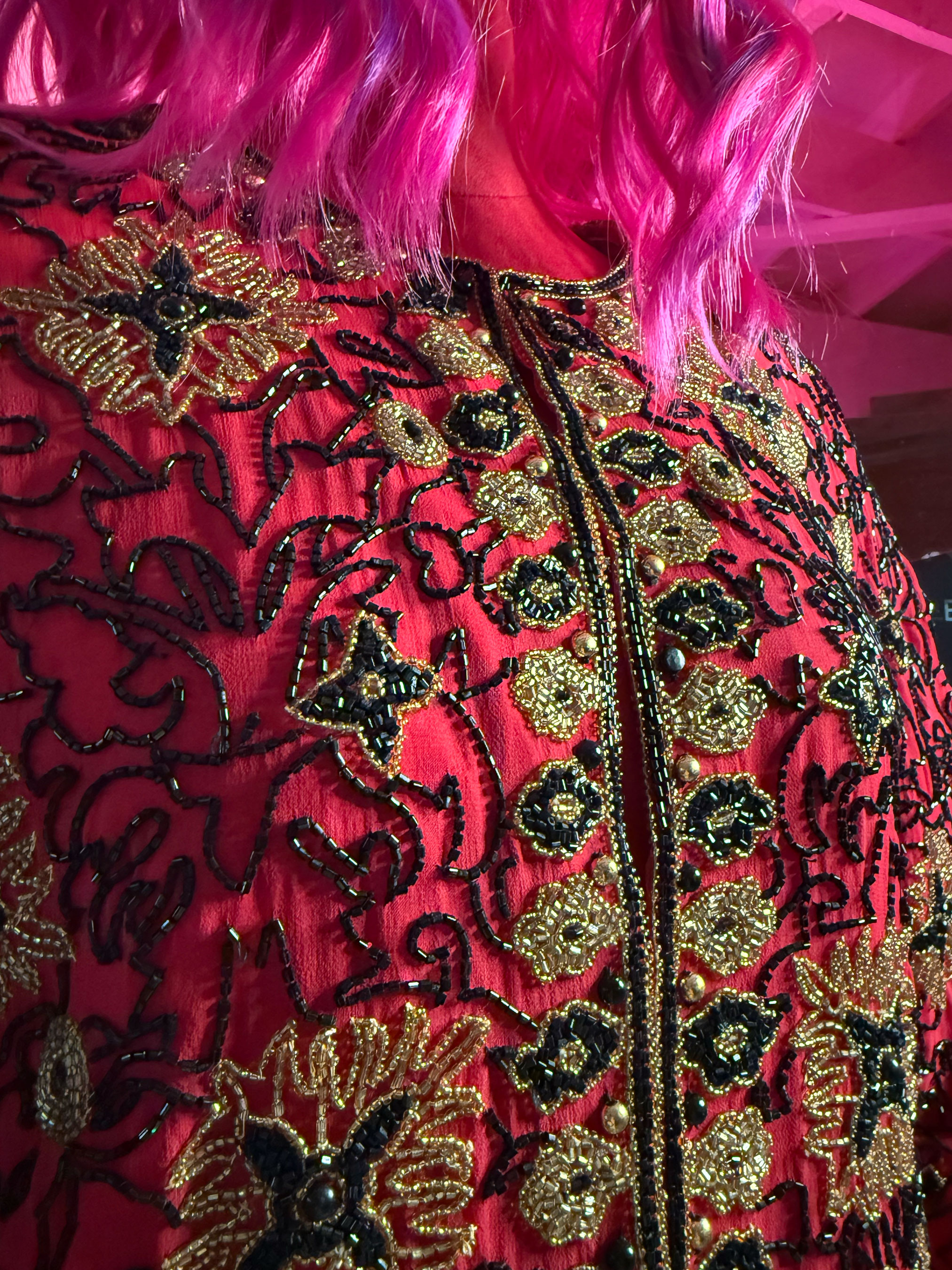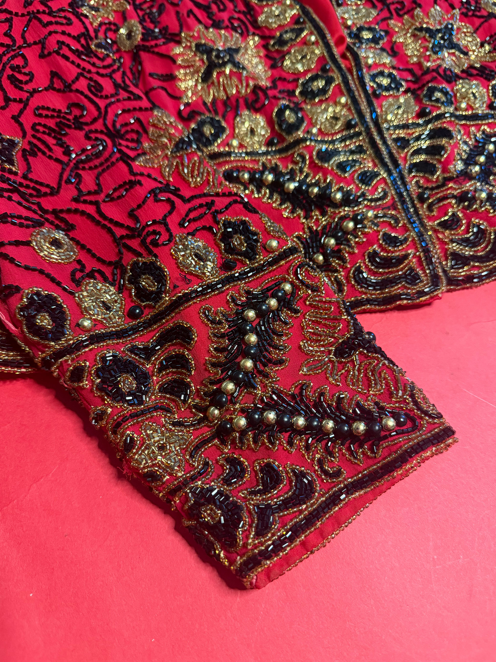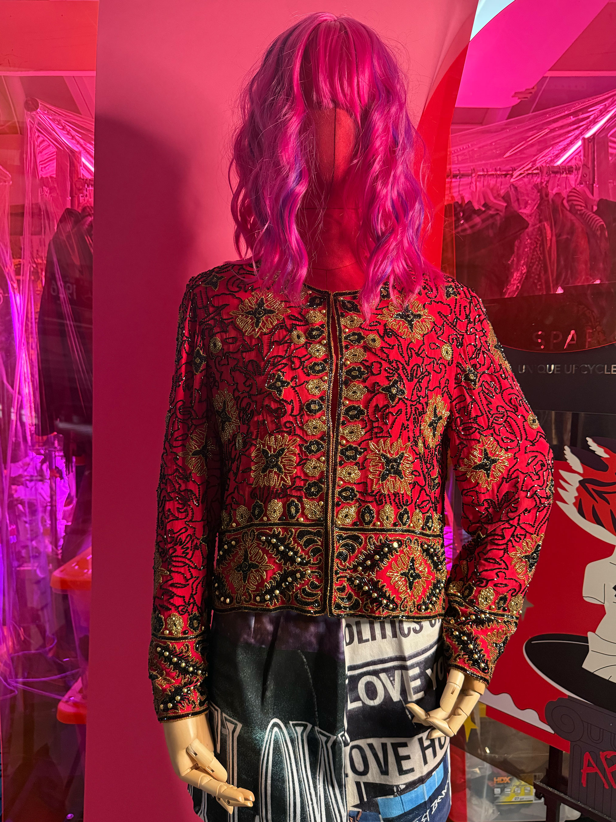 Straight from 1994, this vintage Adrianna Papell blazer is a total 90s knockout. Made of luxe red silk and decked out with intricate black, gold, and red embroidery, sequins, and beading—it’s definitely not shy (and that’s exactly why we love it). The cropped cut and shoulder pads give it that unmistakable power-glam vibe, while the hidden front hooks keep it sleek.