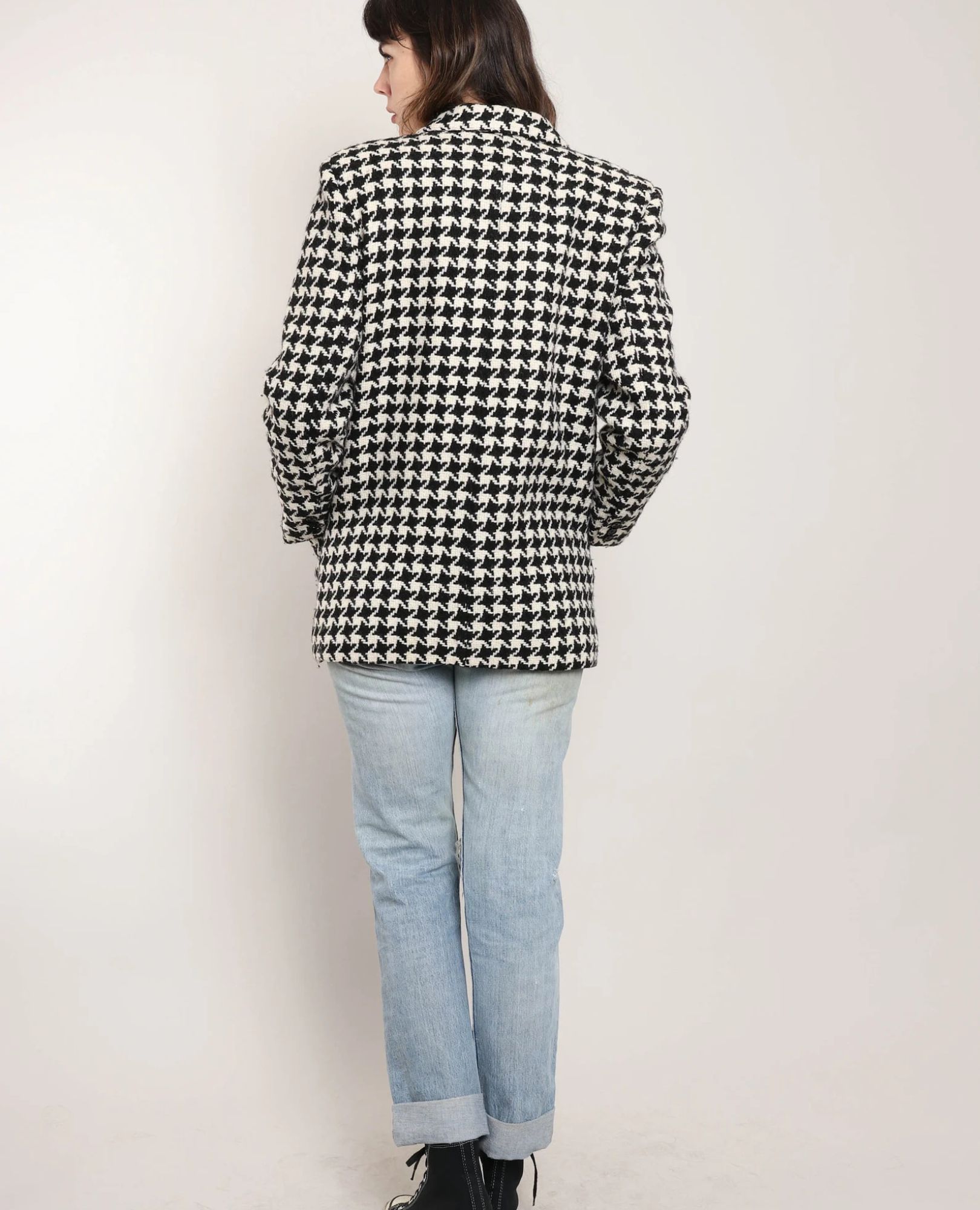 A timeless 1980s/1990s Bill Blass beauty in striking black-and-cream houndstooth, featuring accent lapels, waist button closures, and padded shoulders for that power vibe. Fully lined for comfort—great vintage condition with just a few minor speckles on the left cuff.
