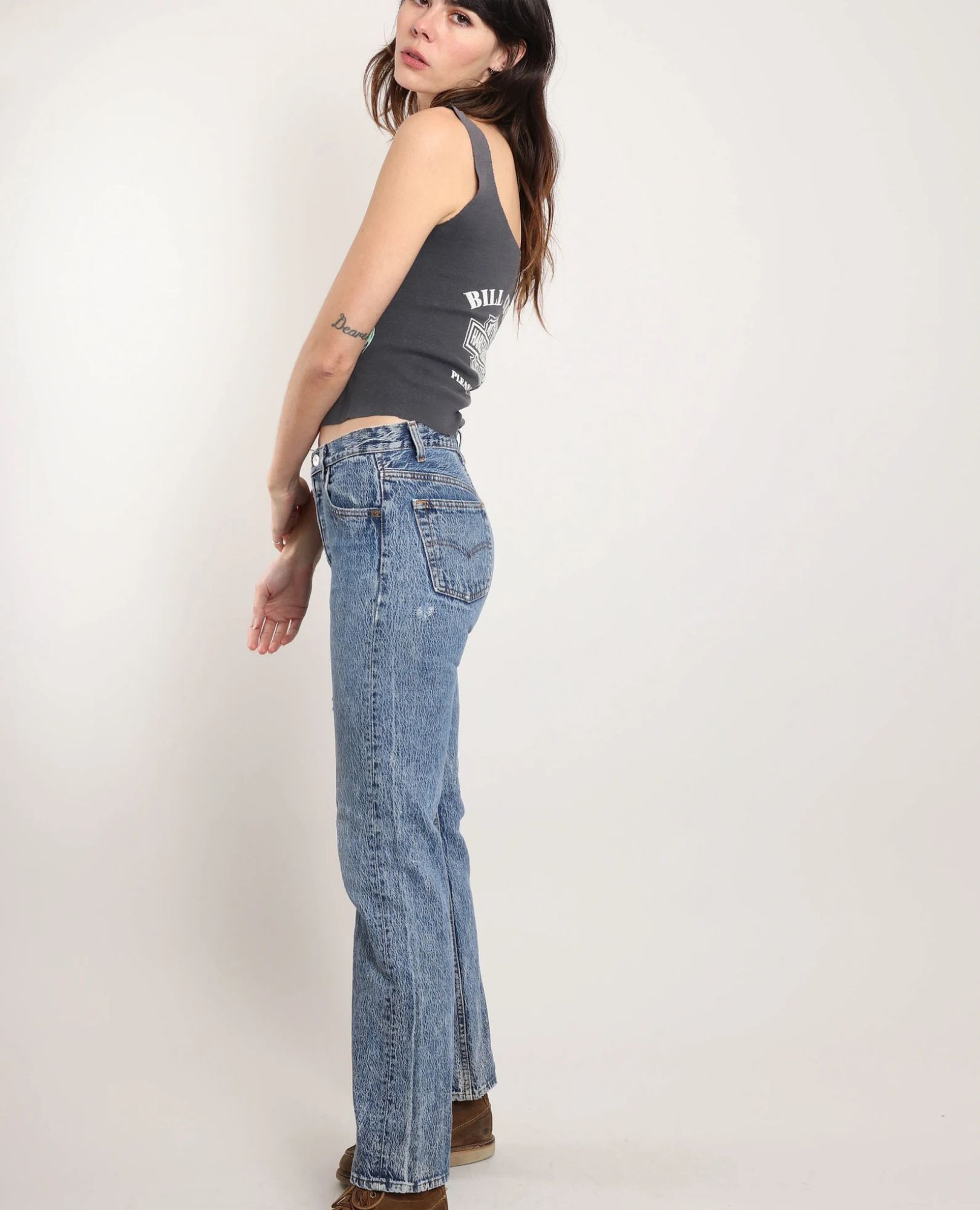 Snag these iconic 1980s/90s Levi’s 501 jeans in a perfectly faded acid wash. With a mid to low rise, button fly, and that classic red tab, they’ve got all the vintage attitude you want—plus a few stylishly placed tears for that lived-in look.