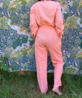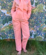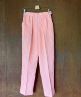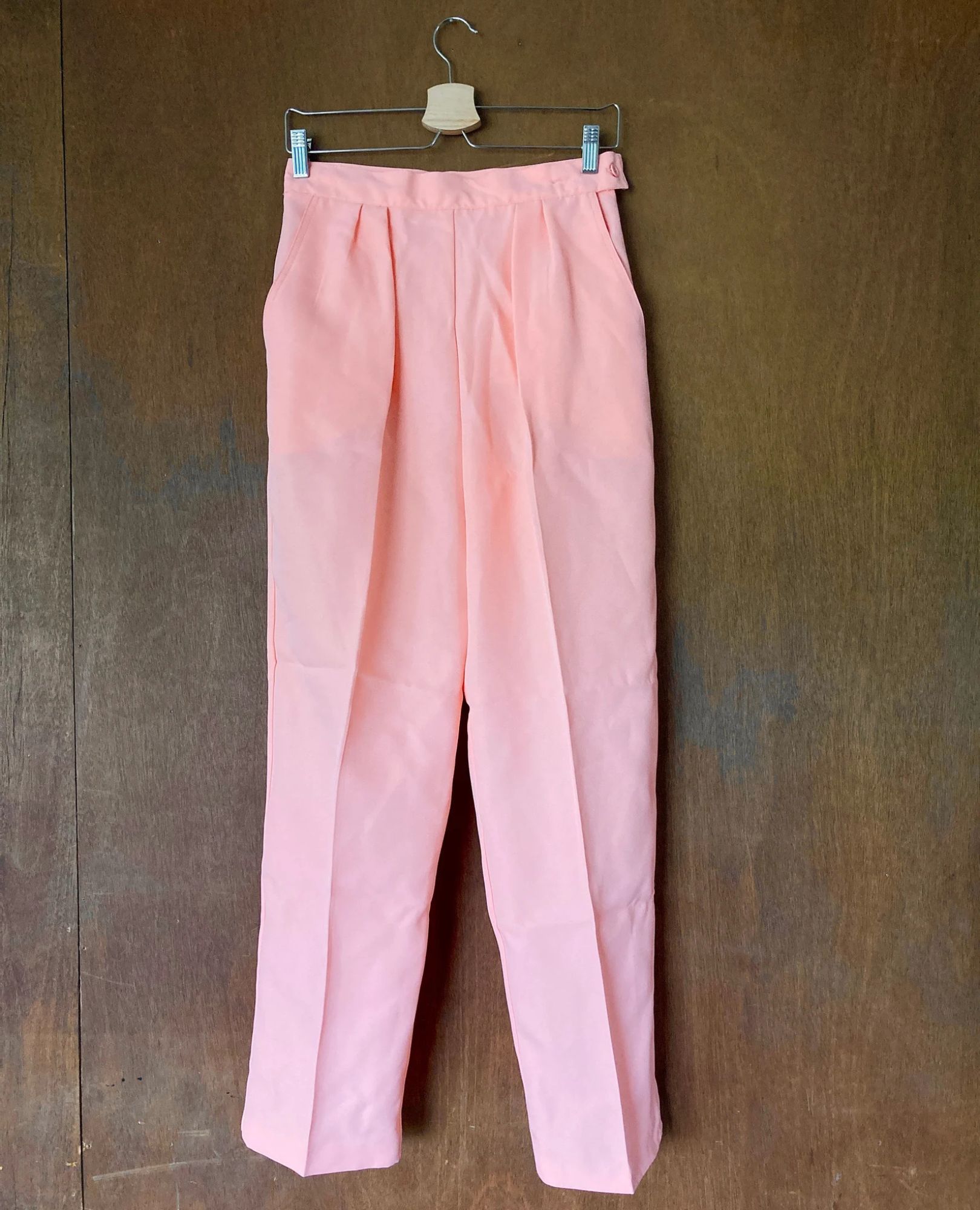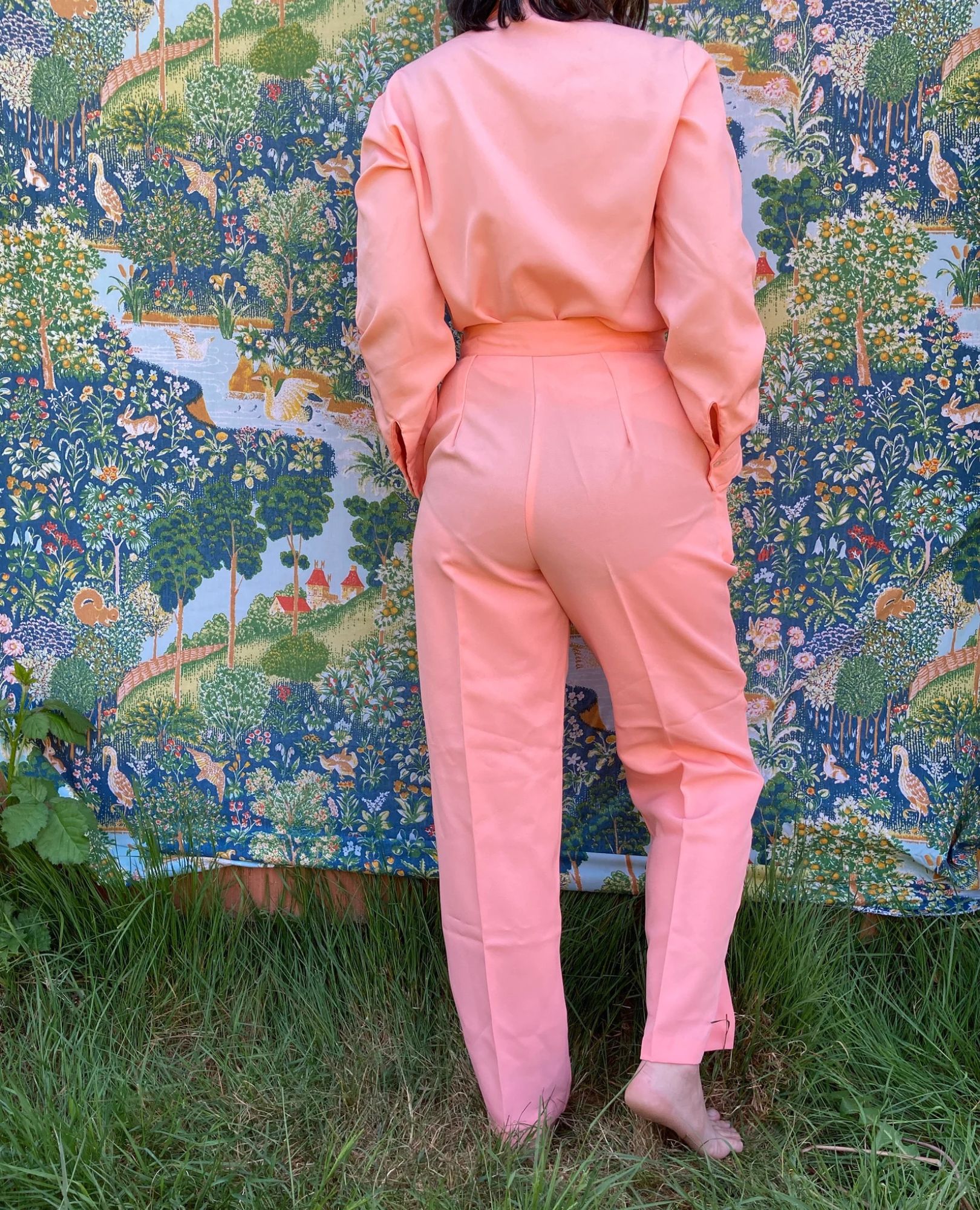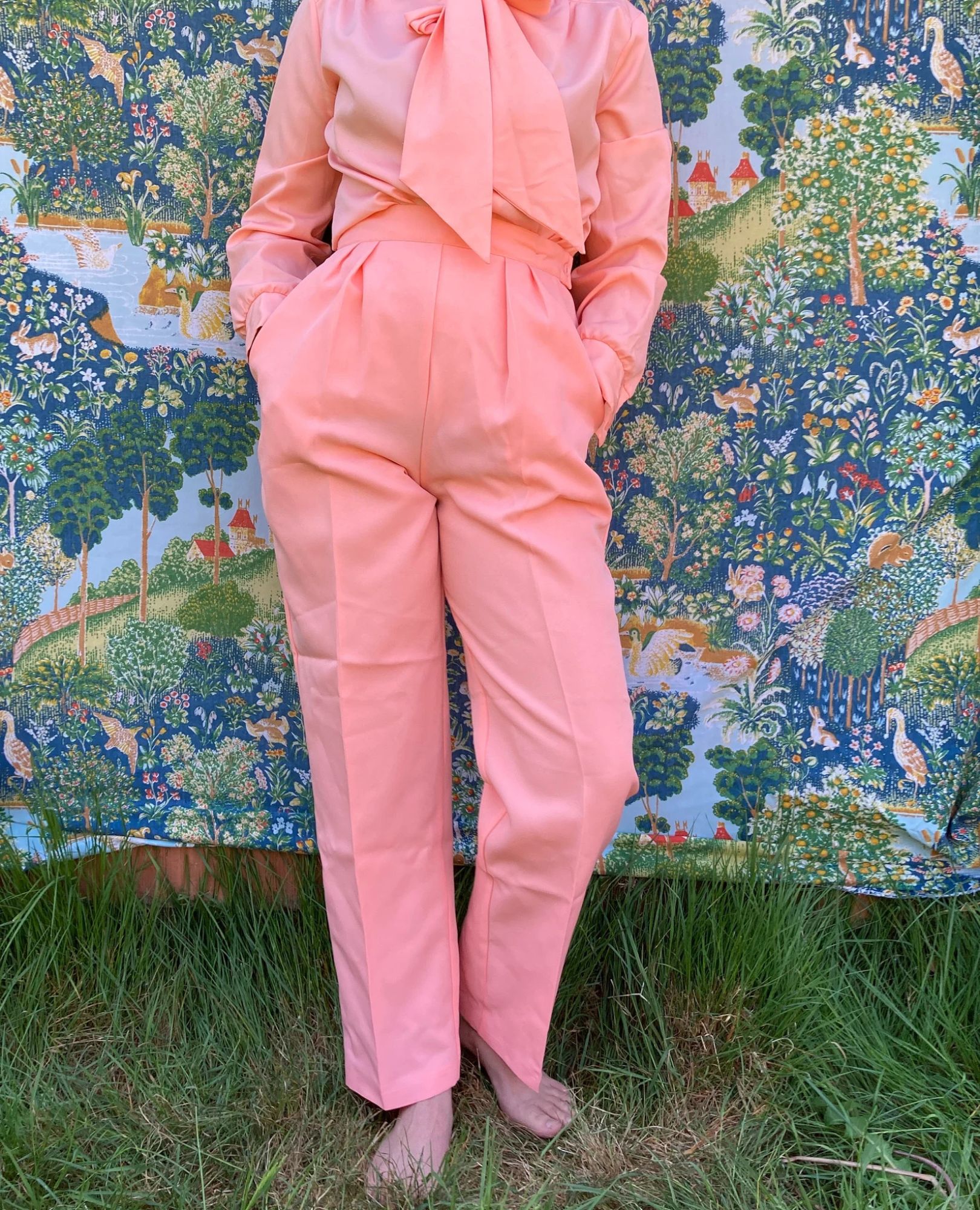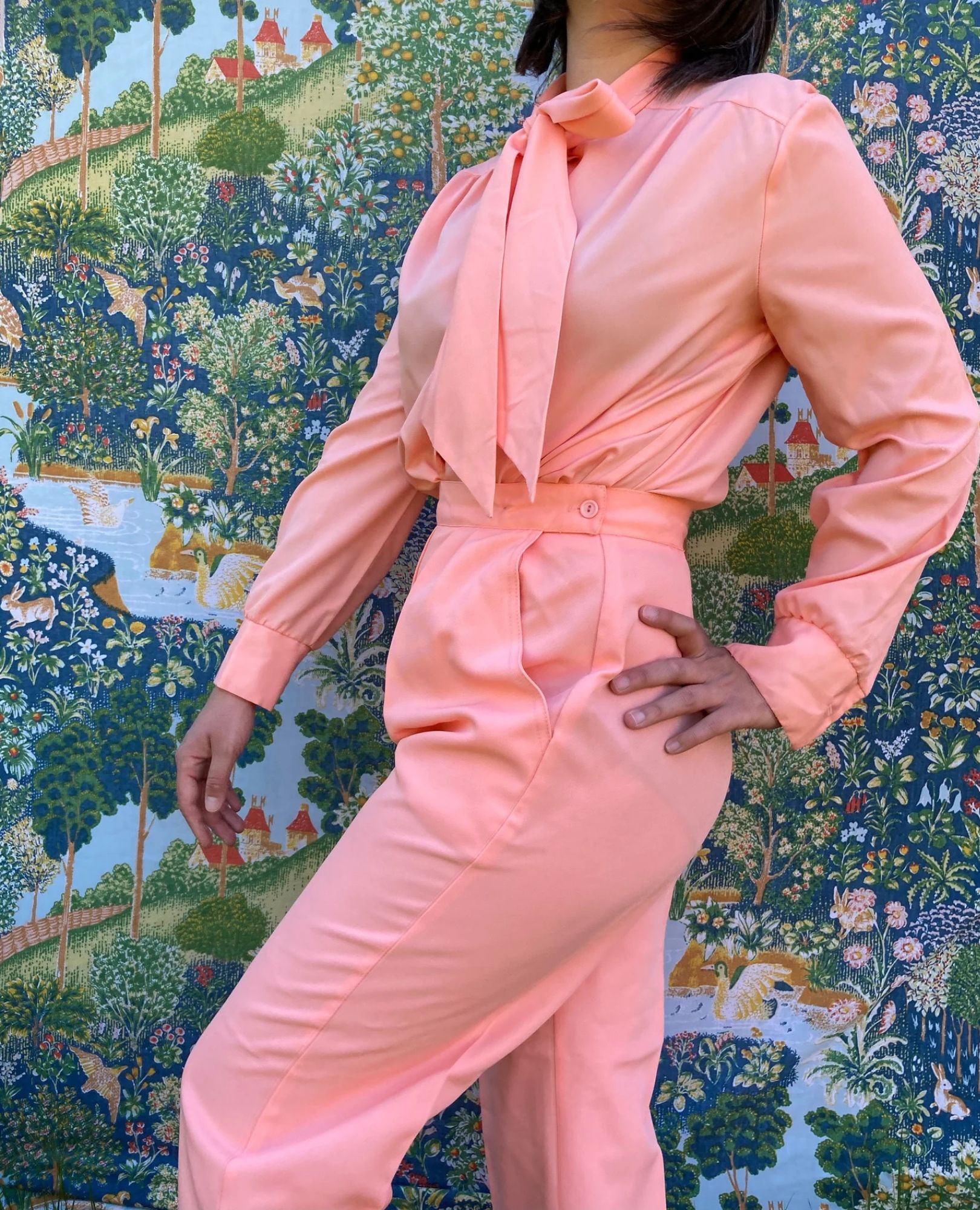 This dreamy 1960s peach set in size Small is serving serious vintage charm—high-waisted front-crease pants paired with a matching pussy bow blouse. The pants feel like a soft cotton blend and both pieces are in great shape, with just a bit of natural pilling on the blouse.