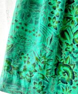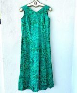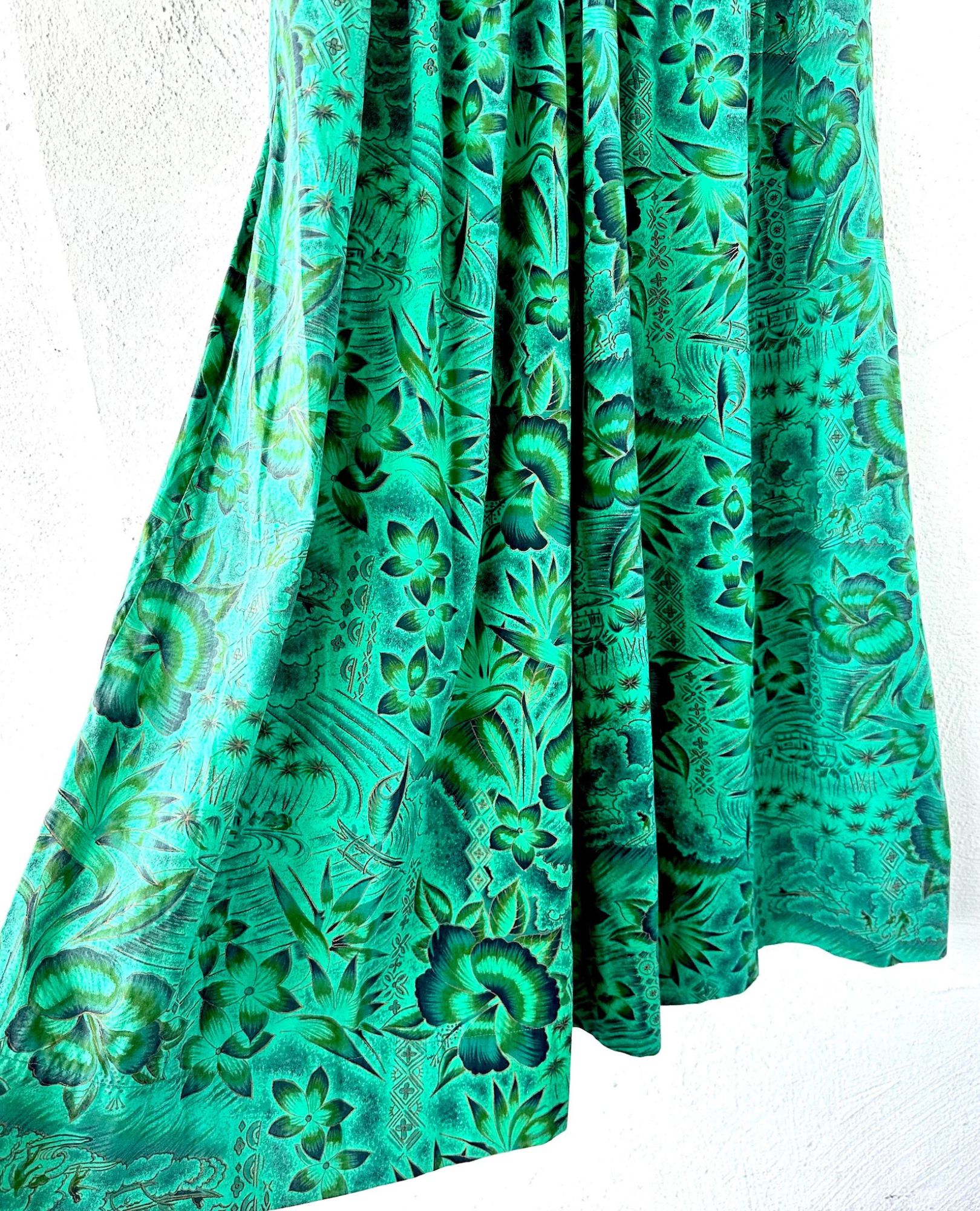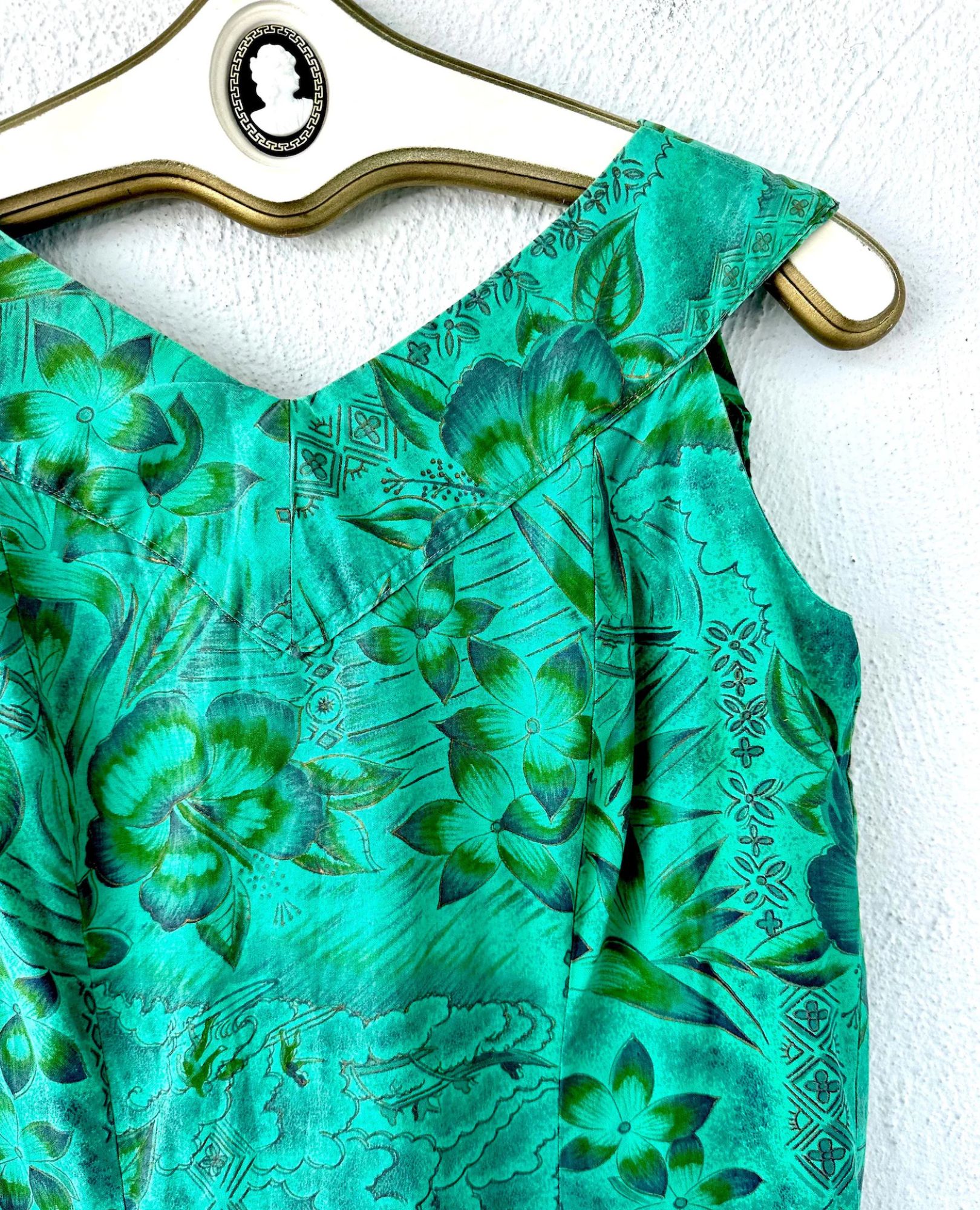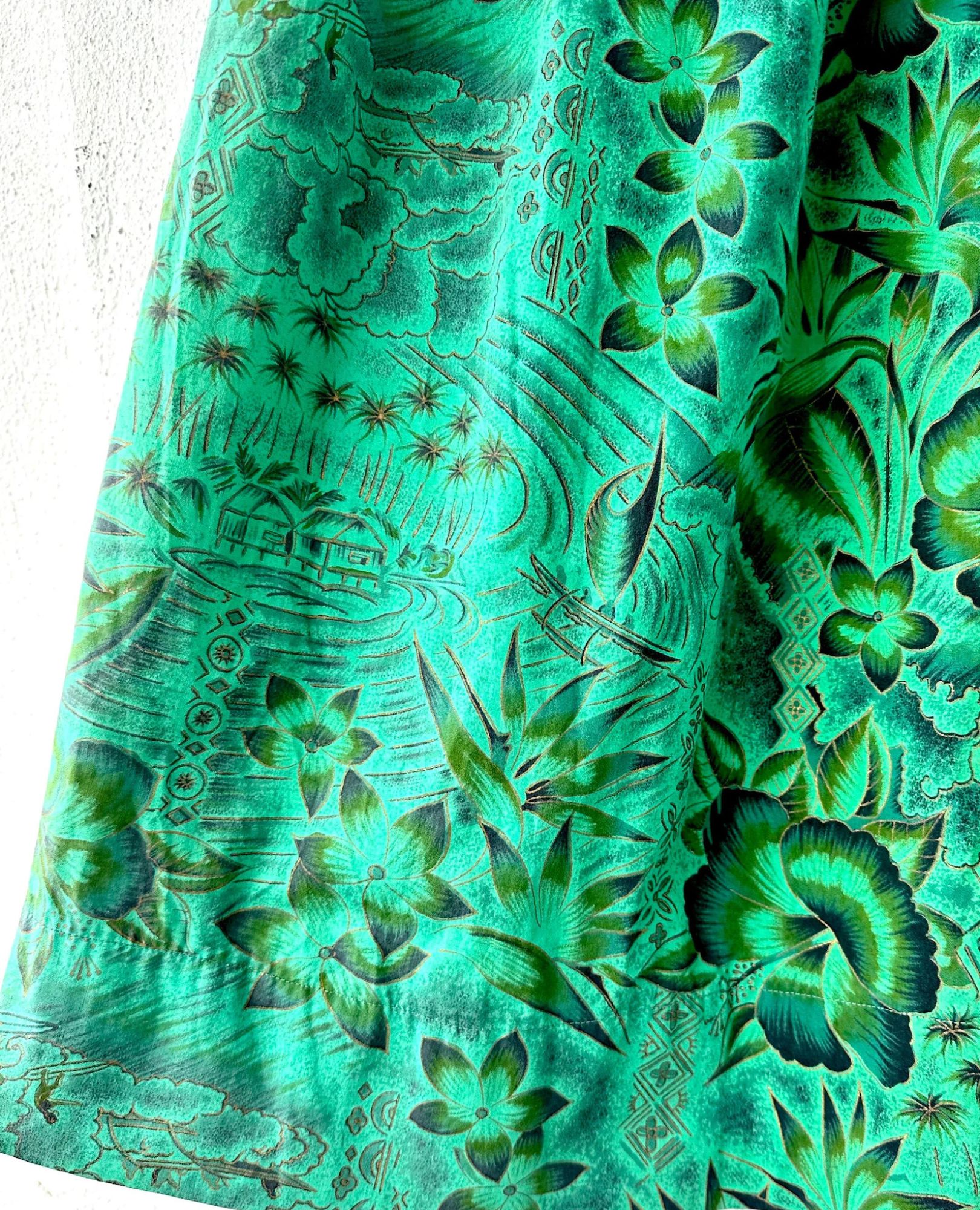 This stunning 1950s Hawaiian muumuu is a wearable postcard from paradise—covered in classic Hawai‘i imagery like surfers, outriggers, florals, hale huts, and tapa motifs, all hand screen-printed in lush greens and shimmering metallic gold. Made from soft Hawaiian cotton with an interior elastic waistband for shape if you want it. No label, but fits like a Small to Medium. In beautifully preserved vintage condition—an absolute treasure!
