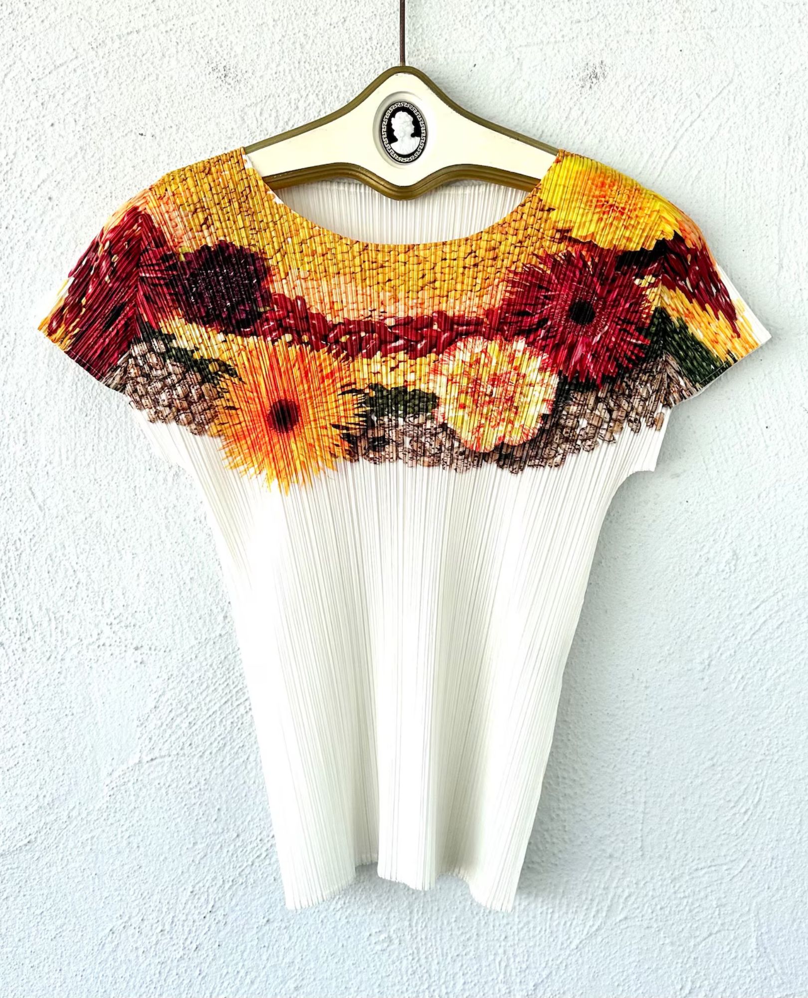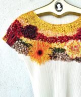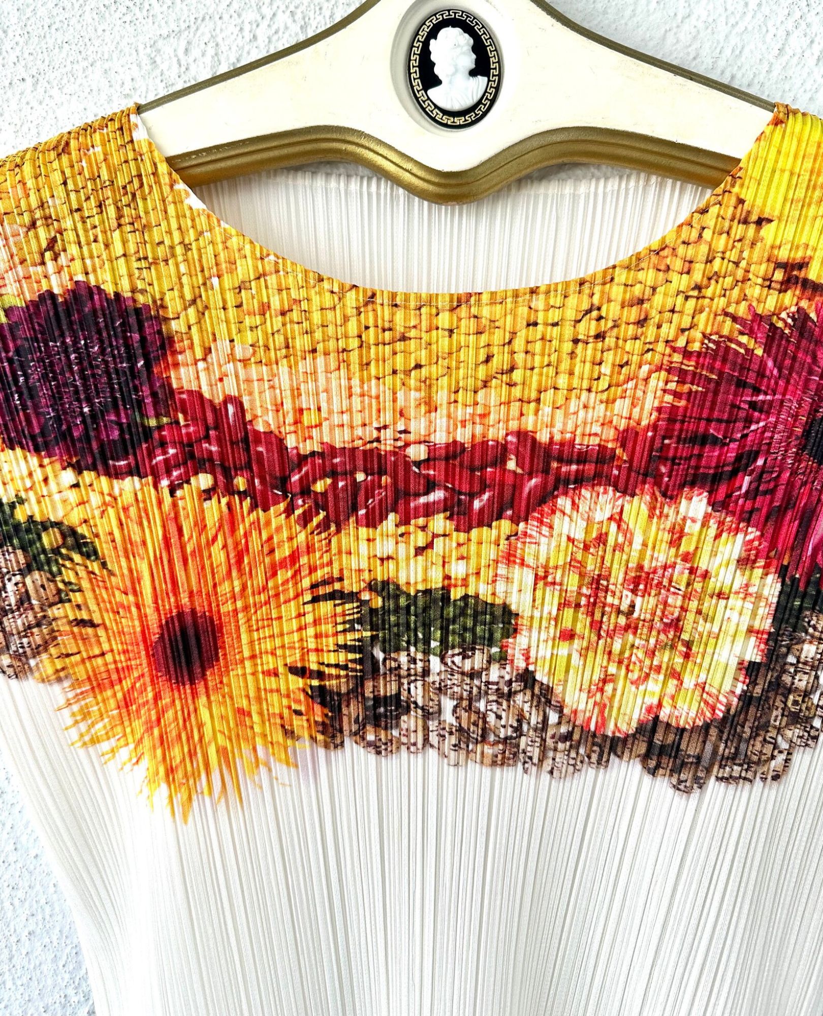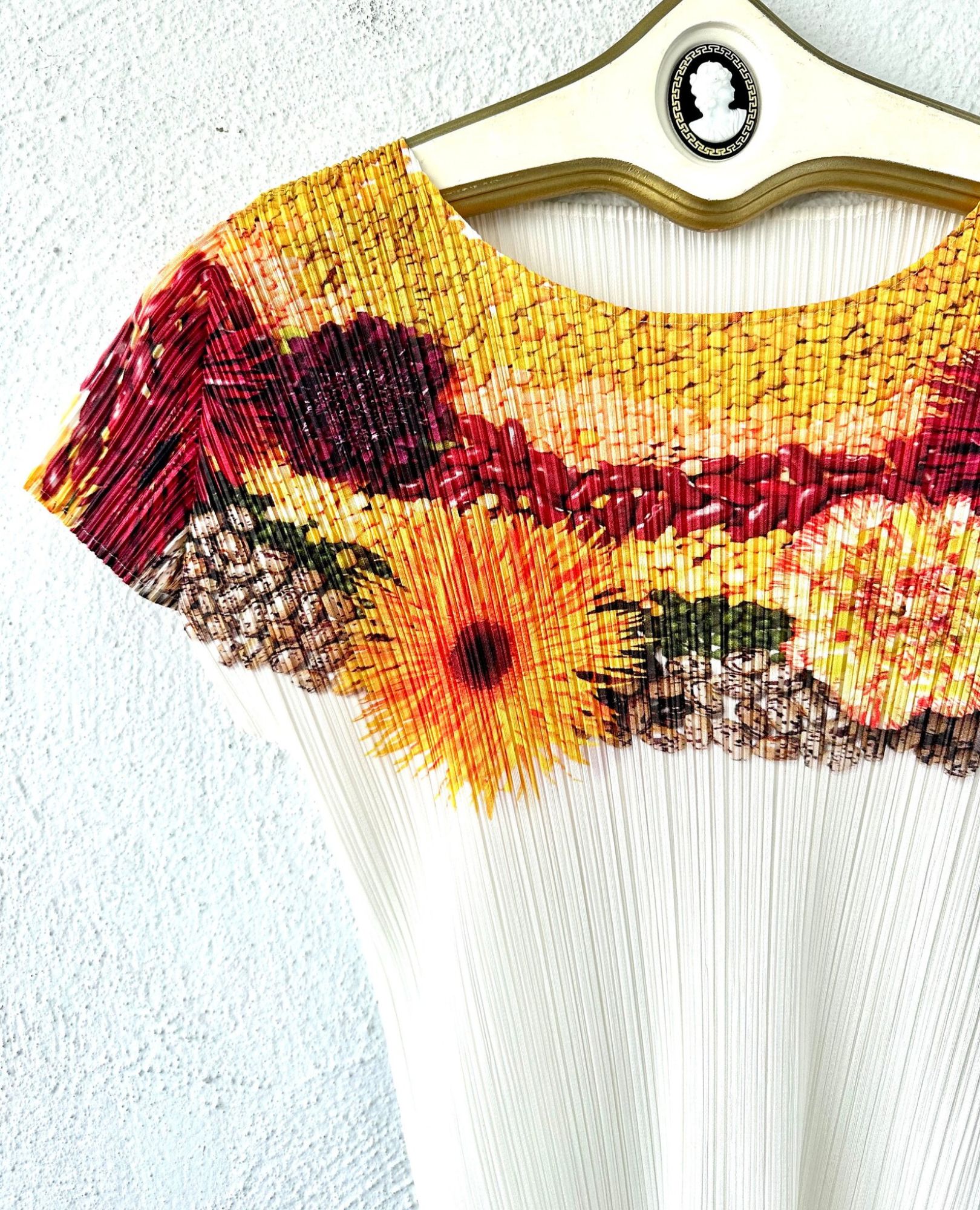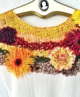 A timeless piece from the legendary designer, featuring Issey Miyake’s signature pleated fabric in a vibrant mix of reds, oranges, yellows, whites, and browns. Free size fit, in amazing vintage condition—no tags specified.