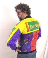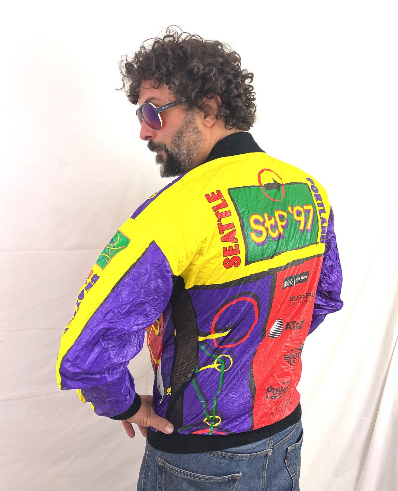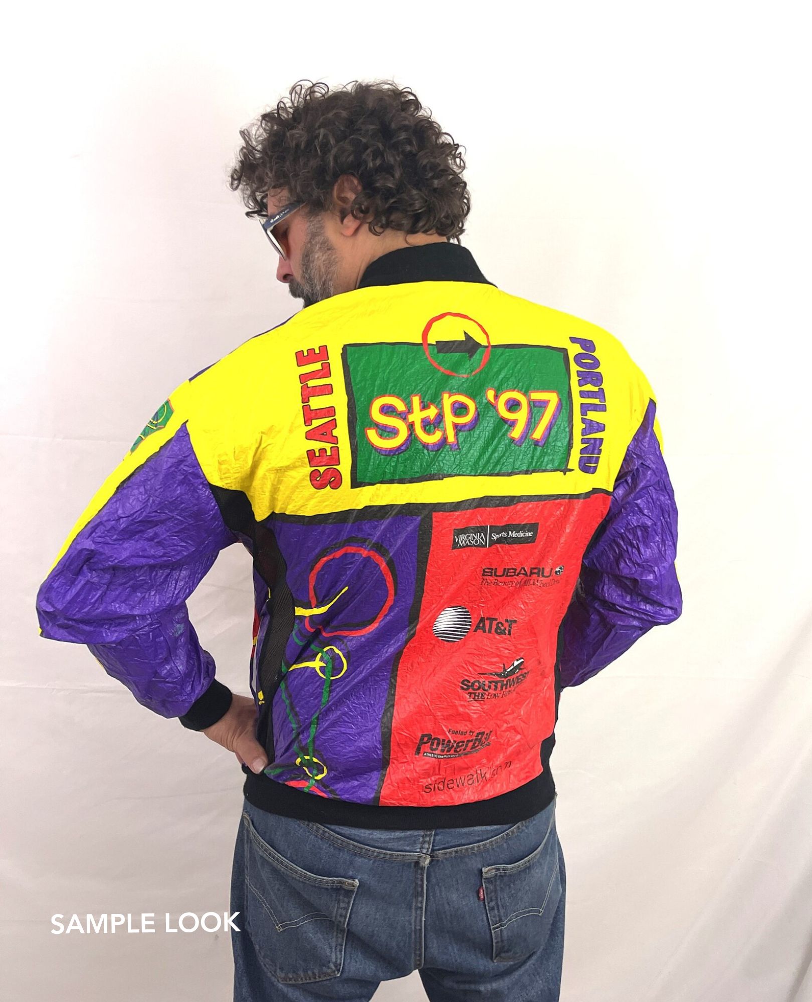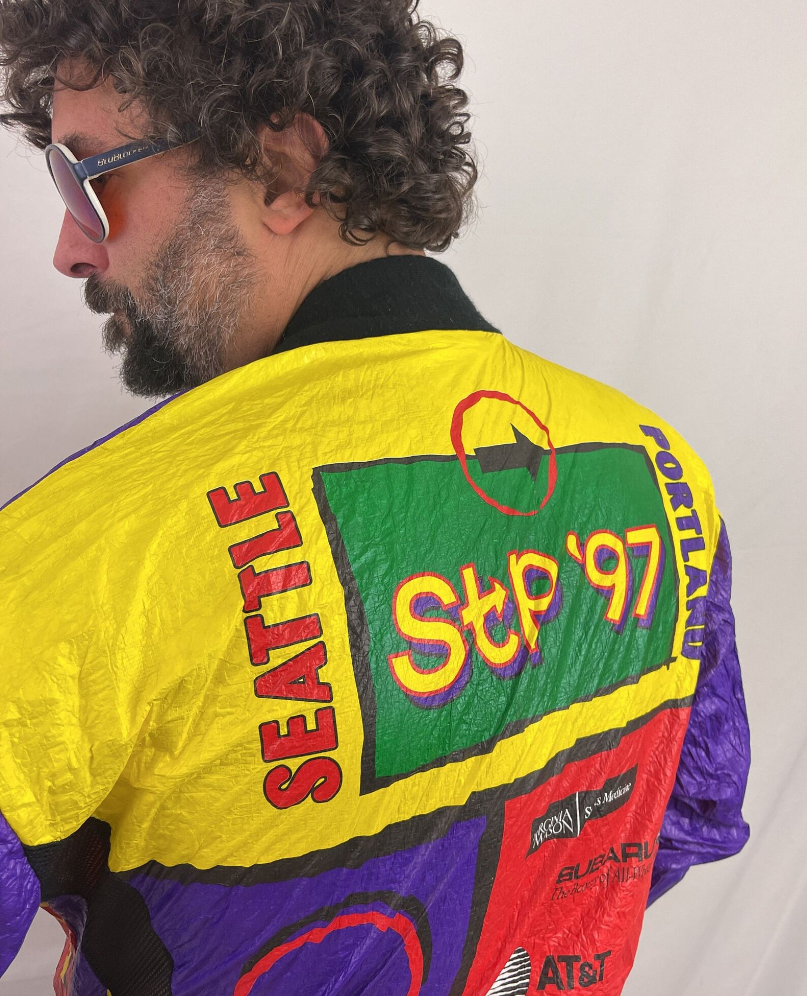 Score this ultra-lightweight, rugged Tyvek jacket from the 1997 Seattle-to-Portland bike race—feels like paper but stands up to adventure! In great vintage condition with a zipper front, XXL fit (25″ pit-to-pit, 30″ length, 25″ sleeves), and made in the USA. It’s a Seattle souvenir with that iconic Graphic Jackets tag.