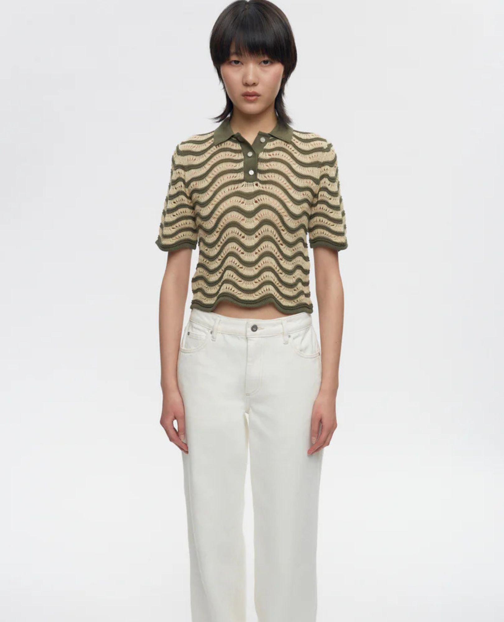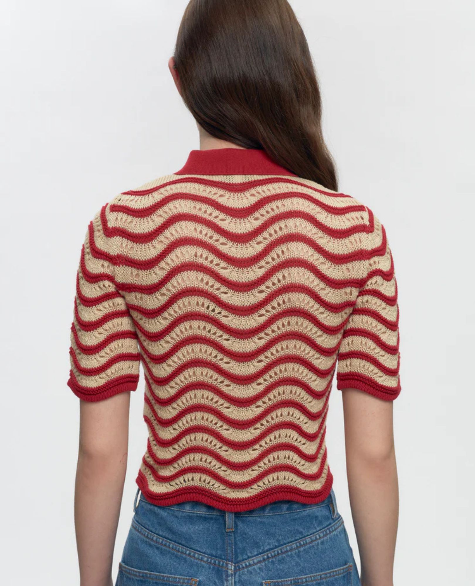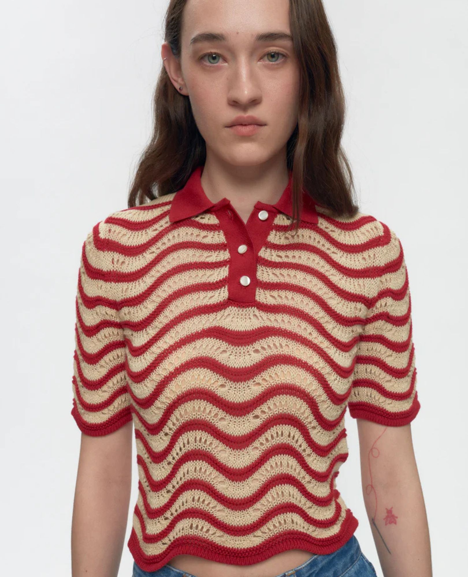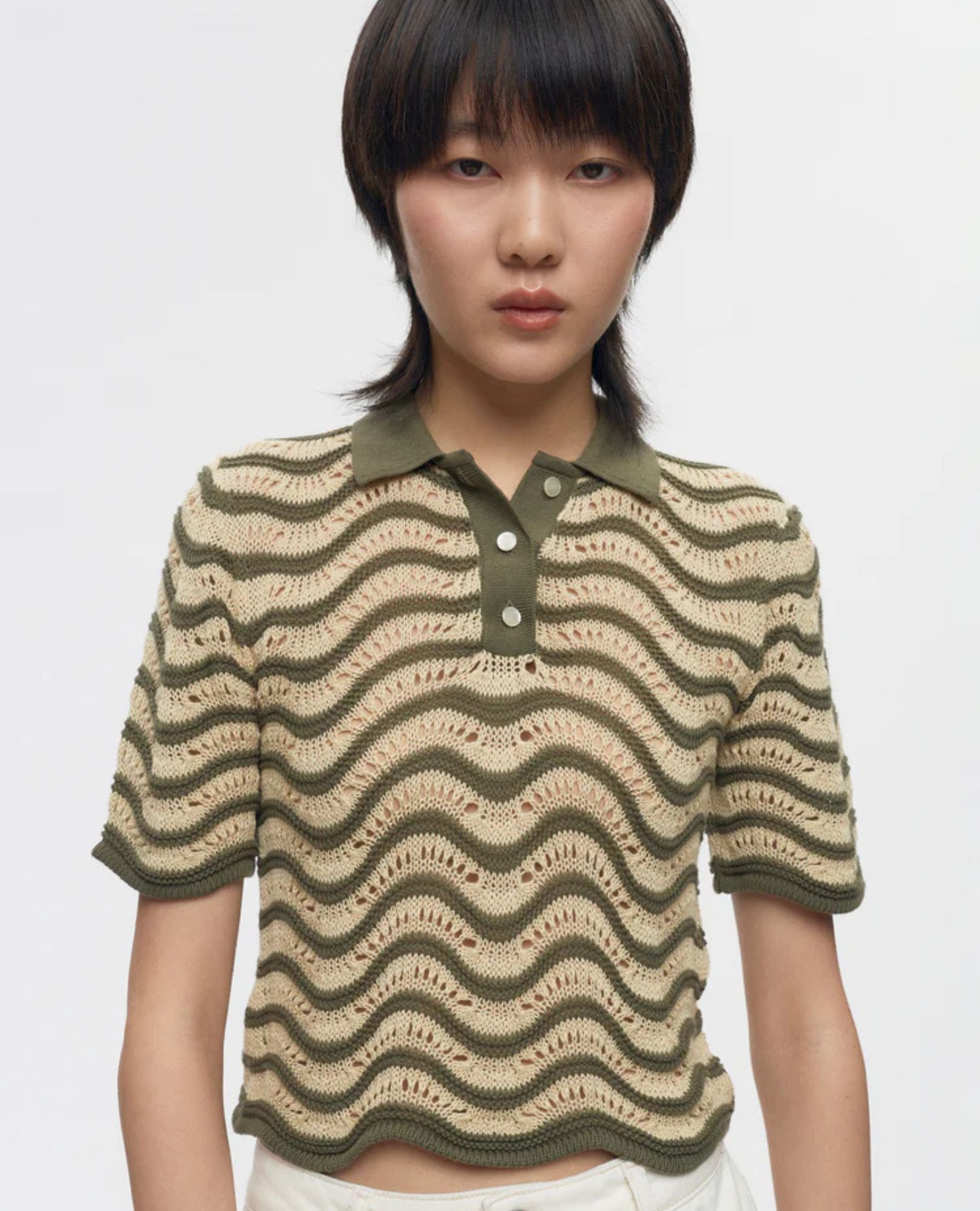 Stay cool in the Sabah Polo—crafted from 100% cotton with a sun-inspired open-knit pattern. Relaxed, cropped, and featuring wavy trims for a breezy, stylish look.